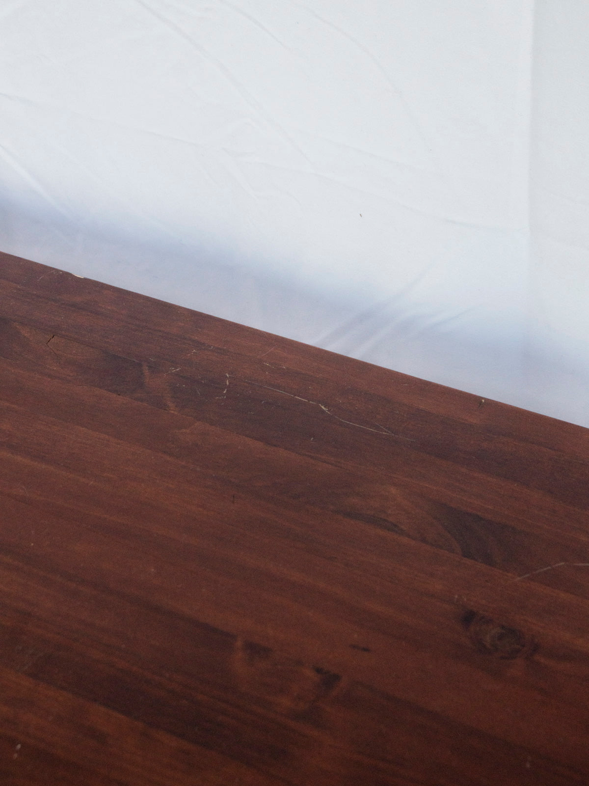 Bring home a stylish and inviting two-tone wooden desk, enhanced with gold-tone metal handles. Its sliding keyboard tray, large open shelf, and four spacious drawers offer practical organization for everyday work while remaining compact enough to fit into a home office. The contrasting wood tones and texture create a refined and inspiring atmosphere. There are some signs of wear and a few scratches on the desktop and frame.