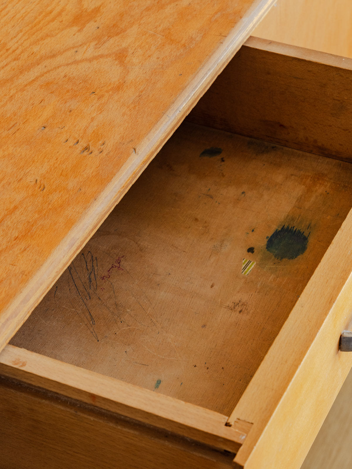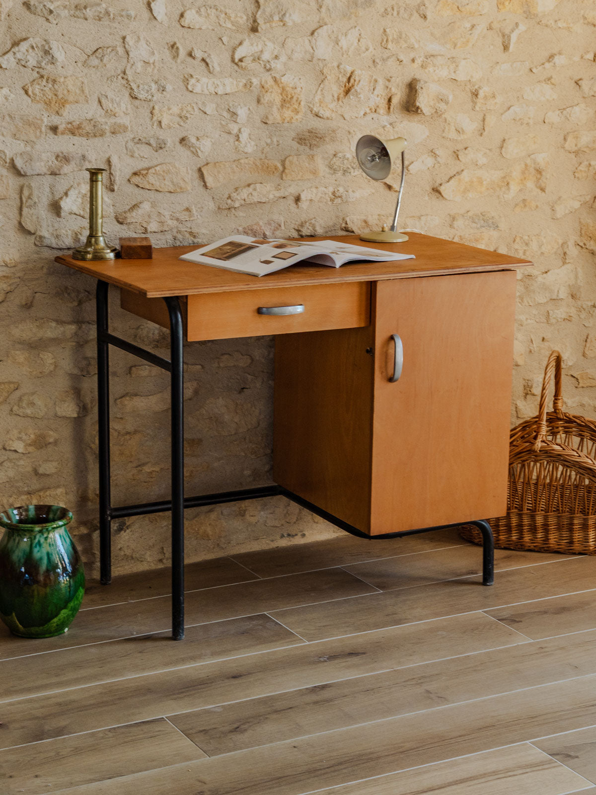 Discover this wooden desk and chair set, accented with black metal details, where the combination of materials creates a simple yet inviting aesthetic. The desk, equipped with a drawer and a latched door, conceals two interior shelves and original silver handles, offering discreet storage and proportions perfectly suited to a workspace or entryway. The chair completes the set with a comfortable seat. Some signs of age are present.