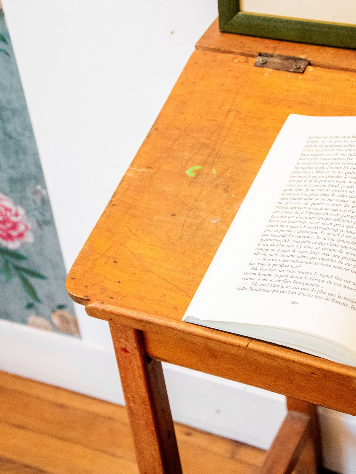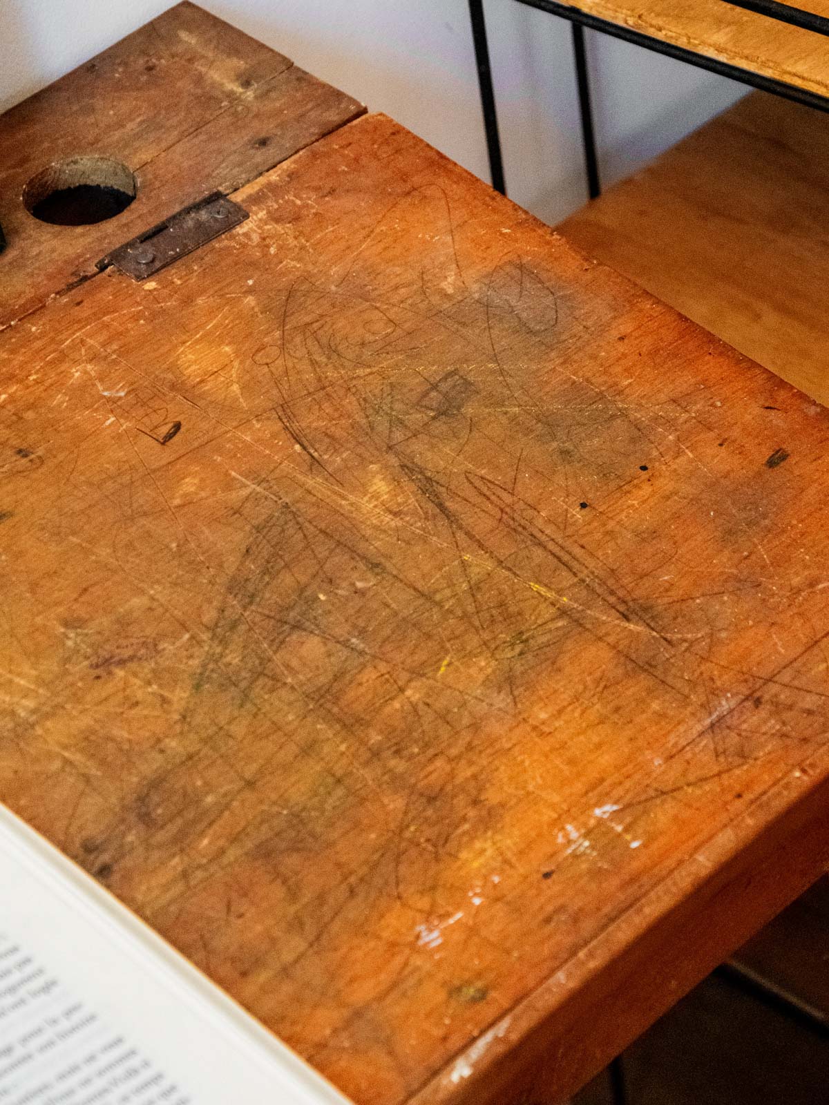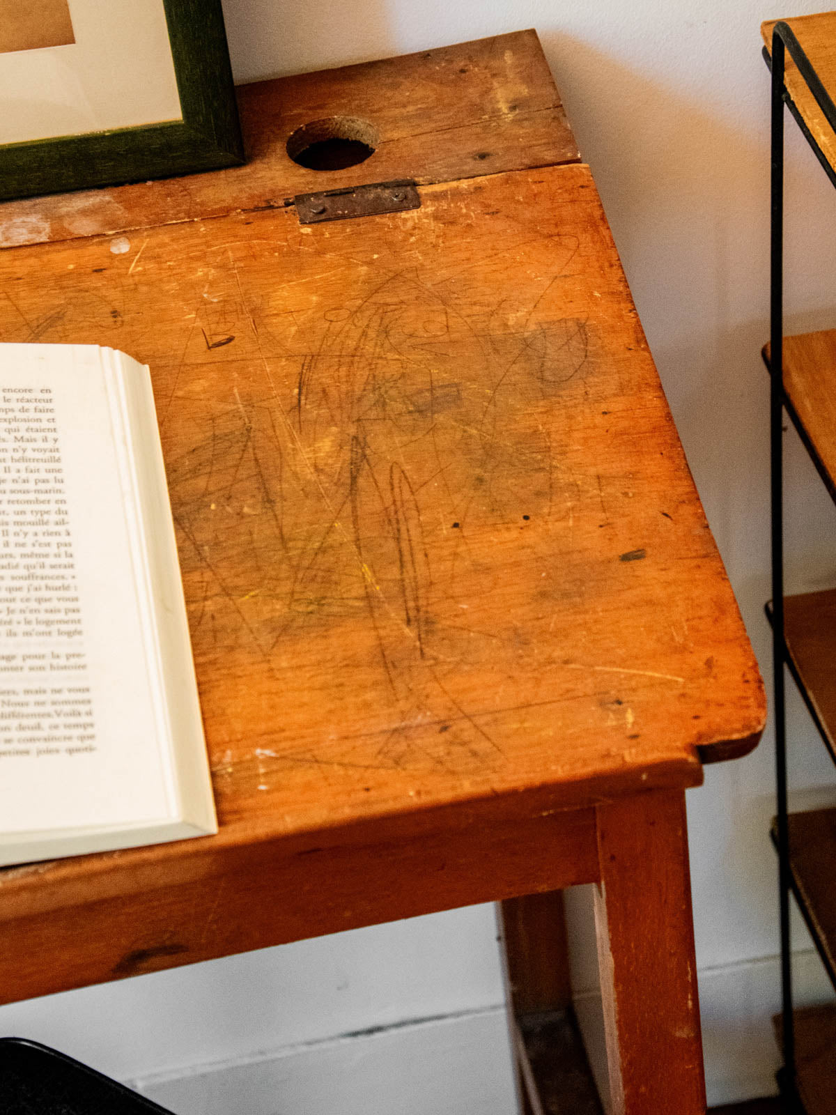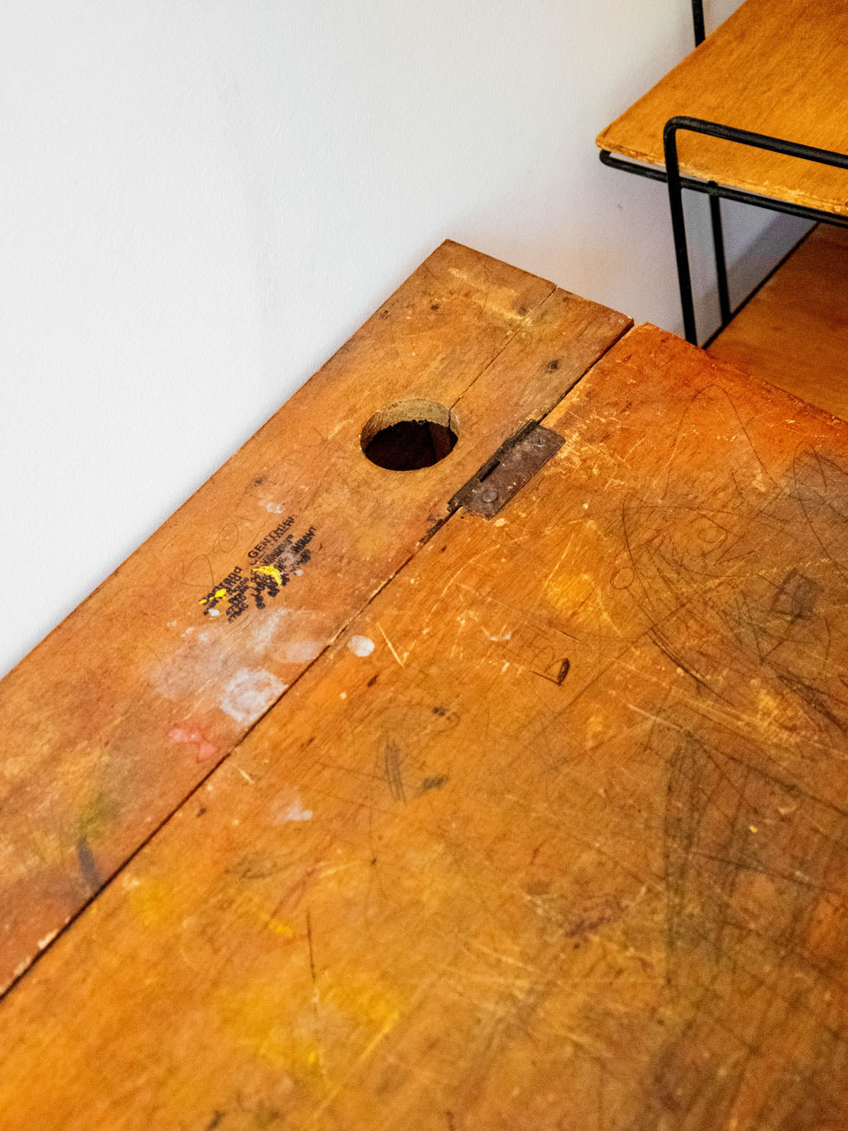 Embrace this charming vintage wooden desk, reminiscent of school furniture, with its compact size and work surface perfect for children's drawings and notebooks. Its wooden frame and warm patina create a calm and studious atmosphere in a bedroom or workshop, while the height under the tabletop is designed for a child's comfortable seating. Minor signs of wear and children's marks are present.
