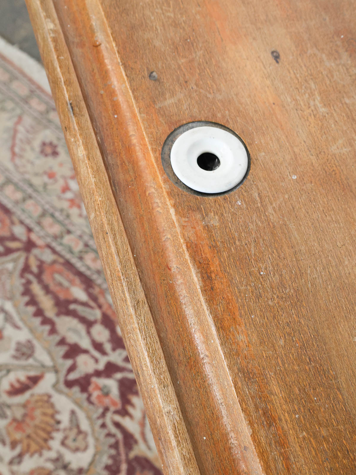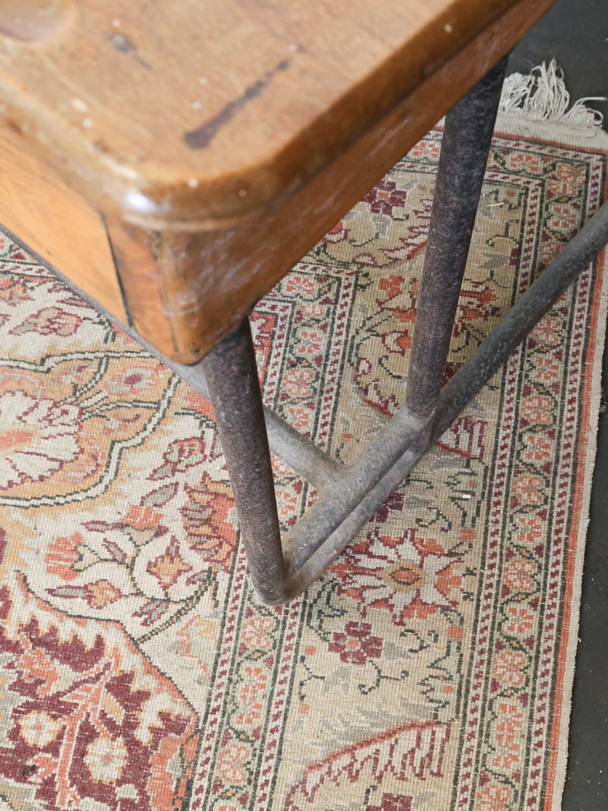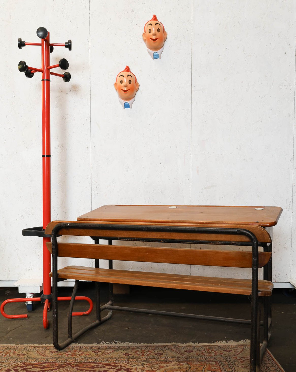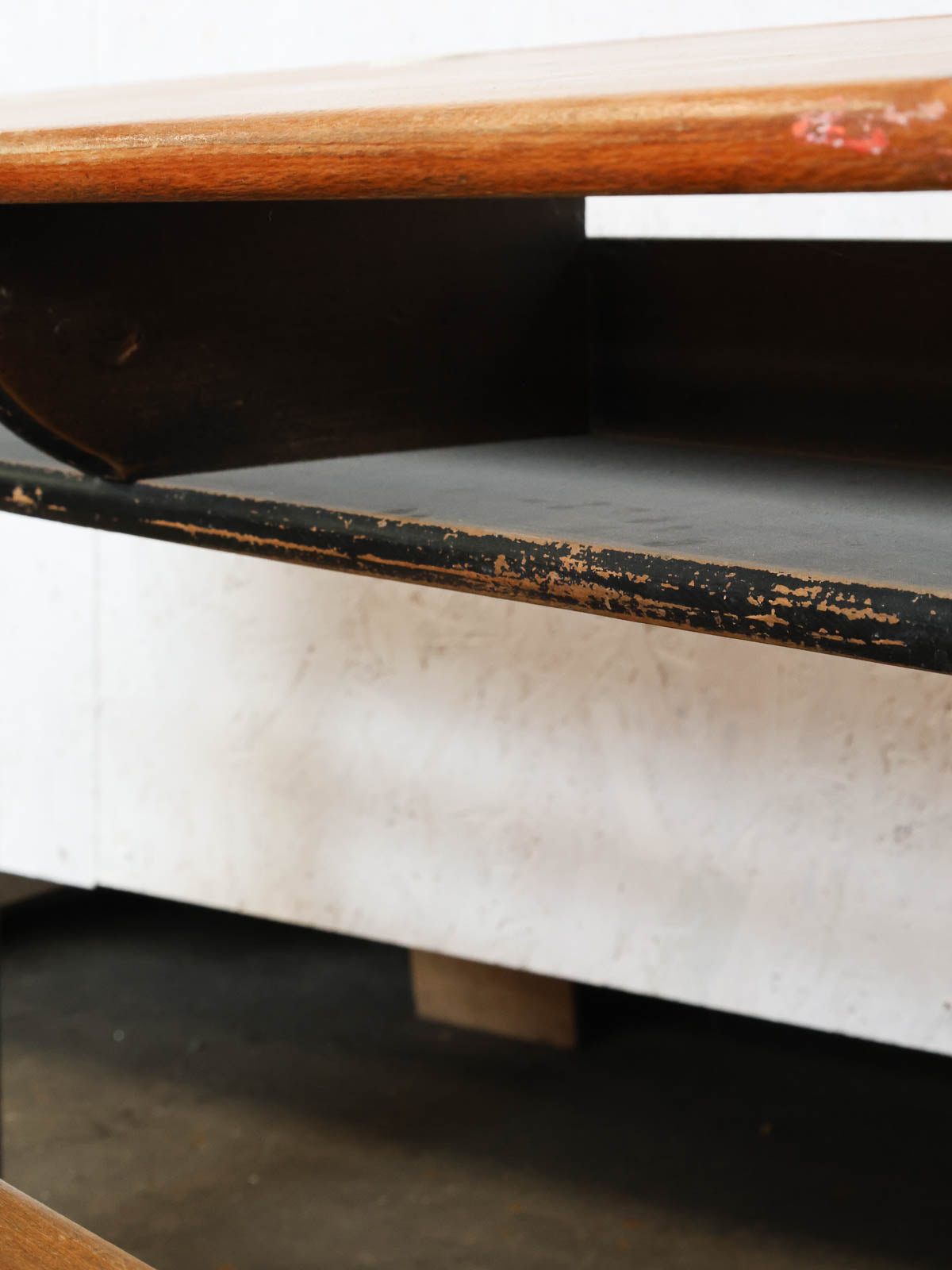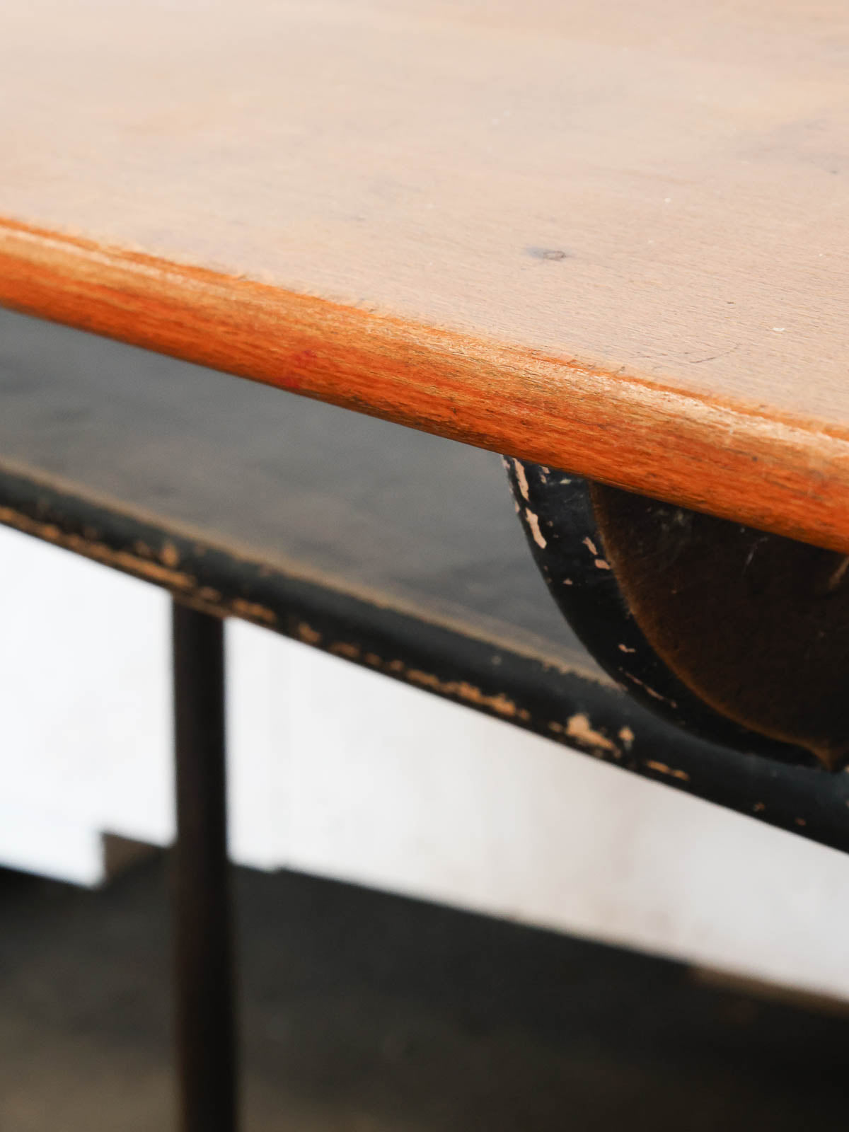 Adoptez ce petit bureau d'écolier écritoire aux piétements métalliques, mêlant un plateau en bois patiné et deux encriers en porcelaine d'origine. Compact et aux proportions étudiées, il s'installe facilement dans un coin bureau ou une chambre d'enfant, offrant une niche intérieure peinte en gris et noir, assez basse pour ranger carnets et instruments d'écriture. Son style rétro et sa matière brute apportent une ambiance studieuse et chaleureuse, parfaite pour une déco au charme discret.