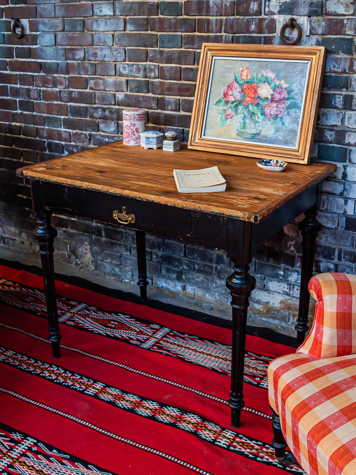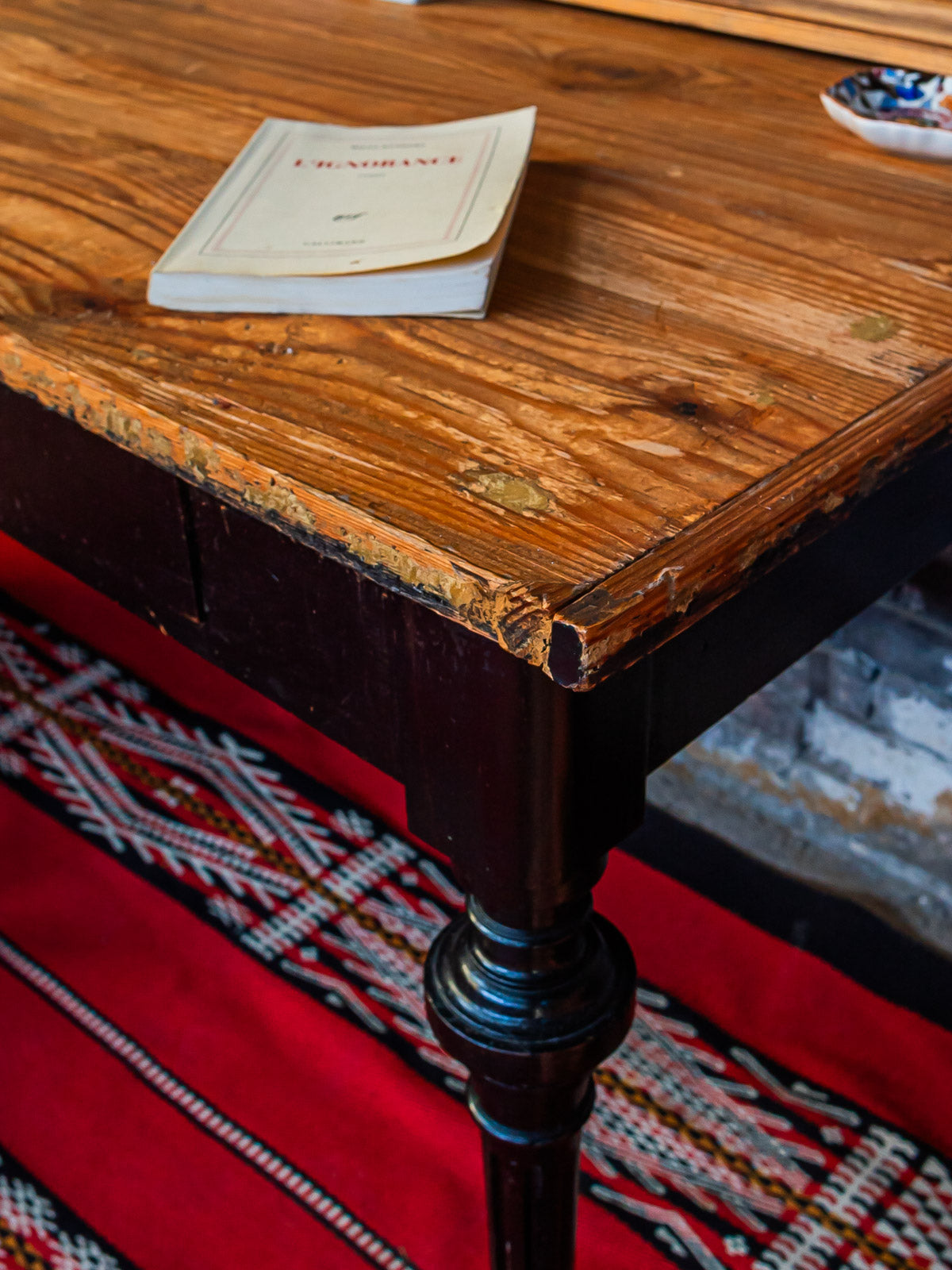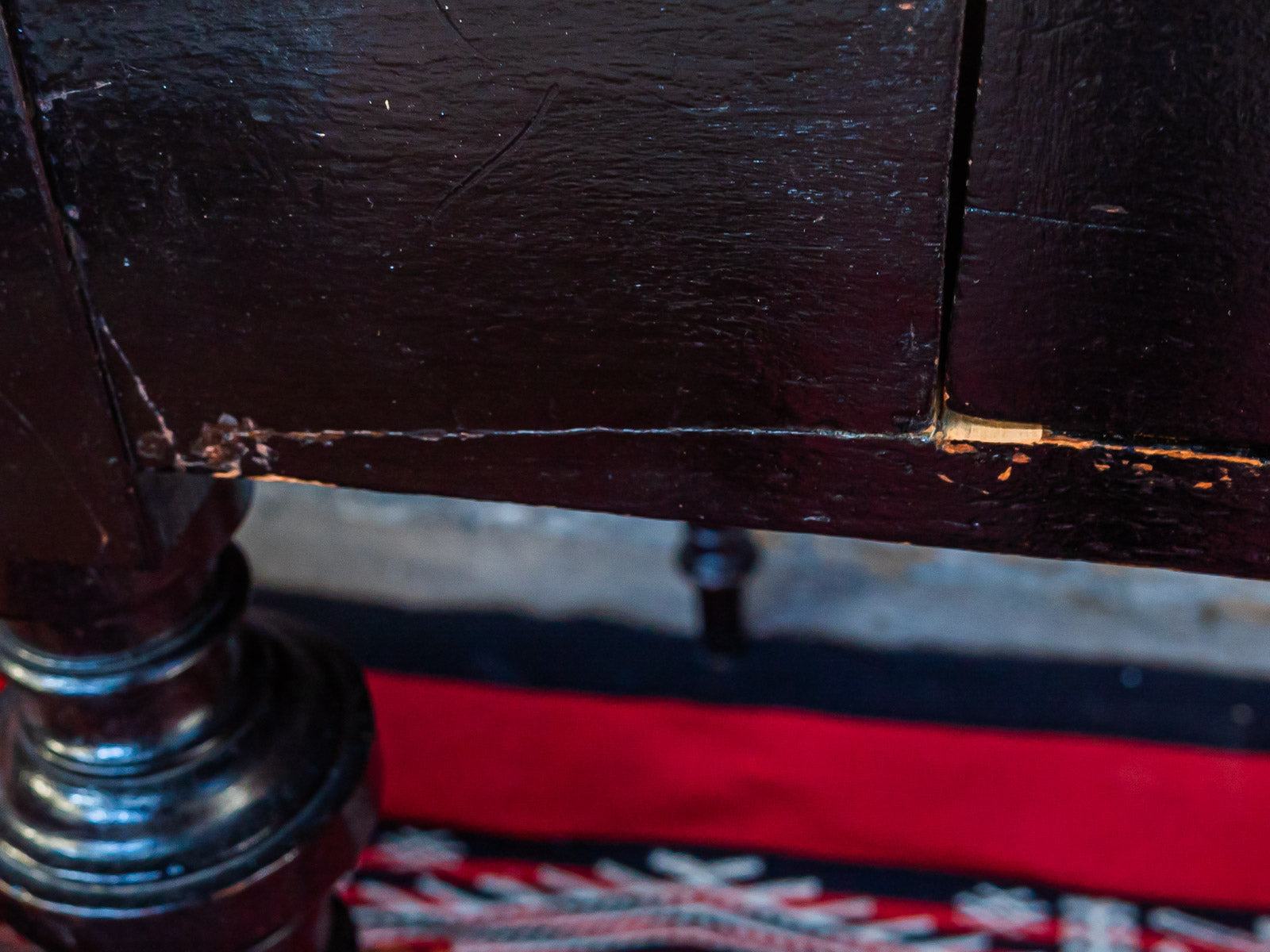 Discover this undeniably charming Napoleon III desk, combining character and elegance. Its raw wood top, combined with a black painted base, brings a vintage touch to your interior. Featuring a compartmentalized drawer, it offers practical storage space. Signs of wear and wood filler additions are visible, testifying to its unique history. An attractive piece for lovers of refined decor.