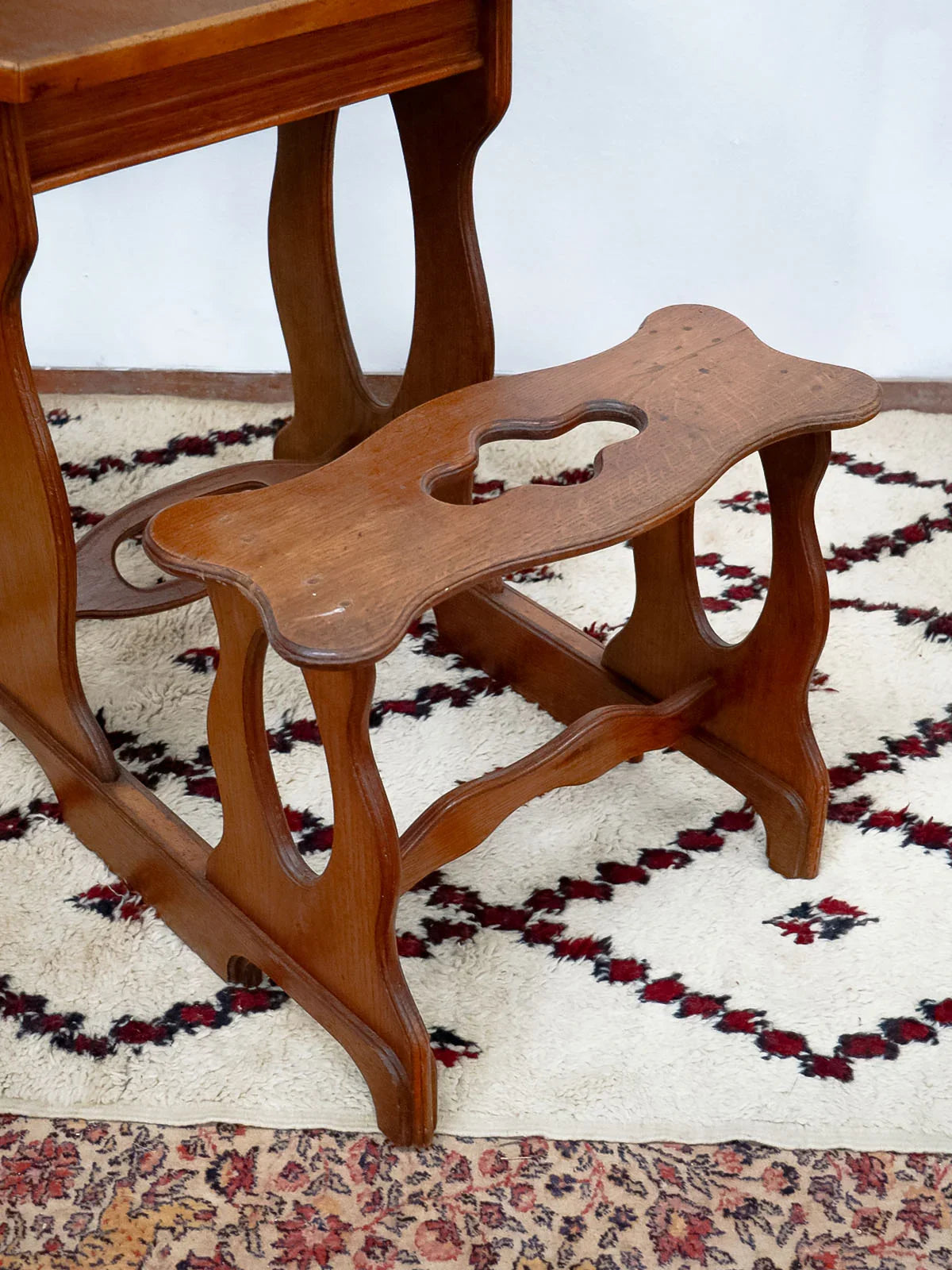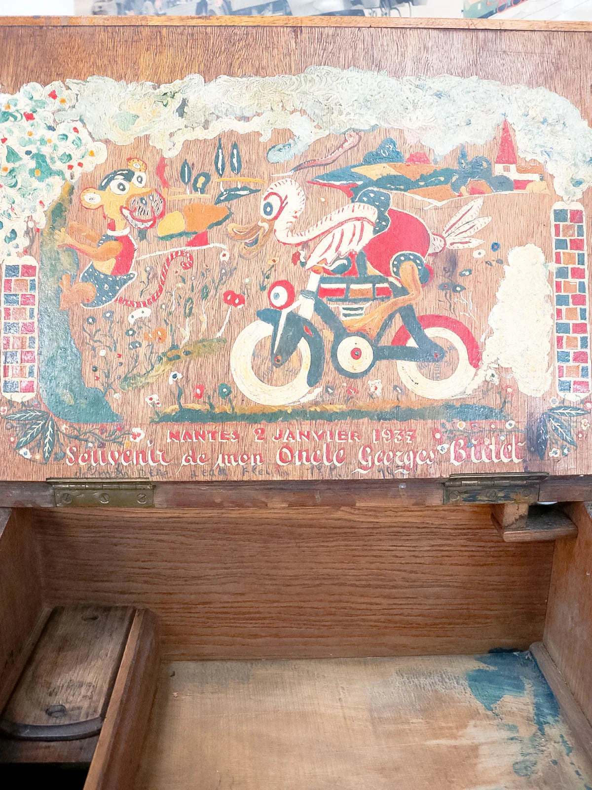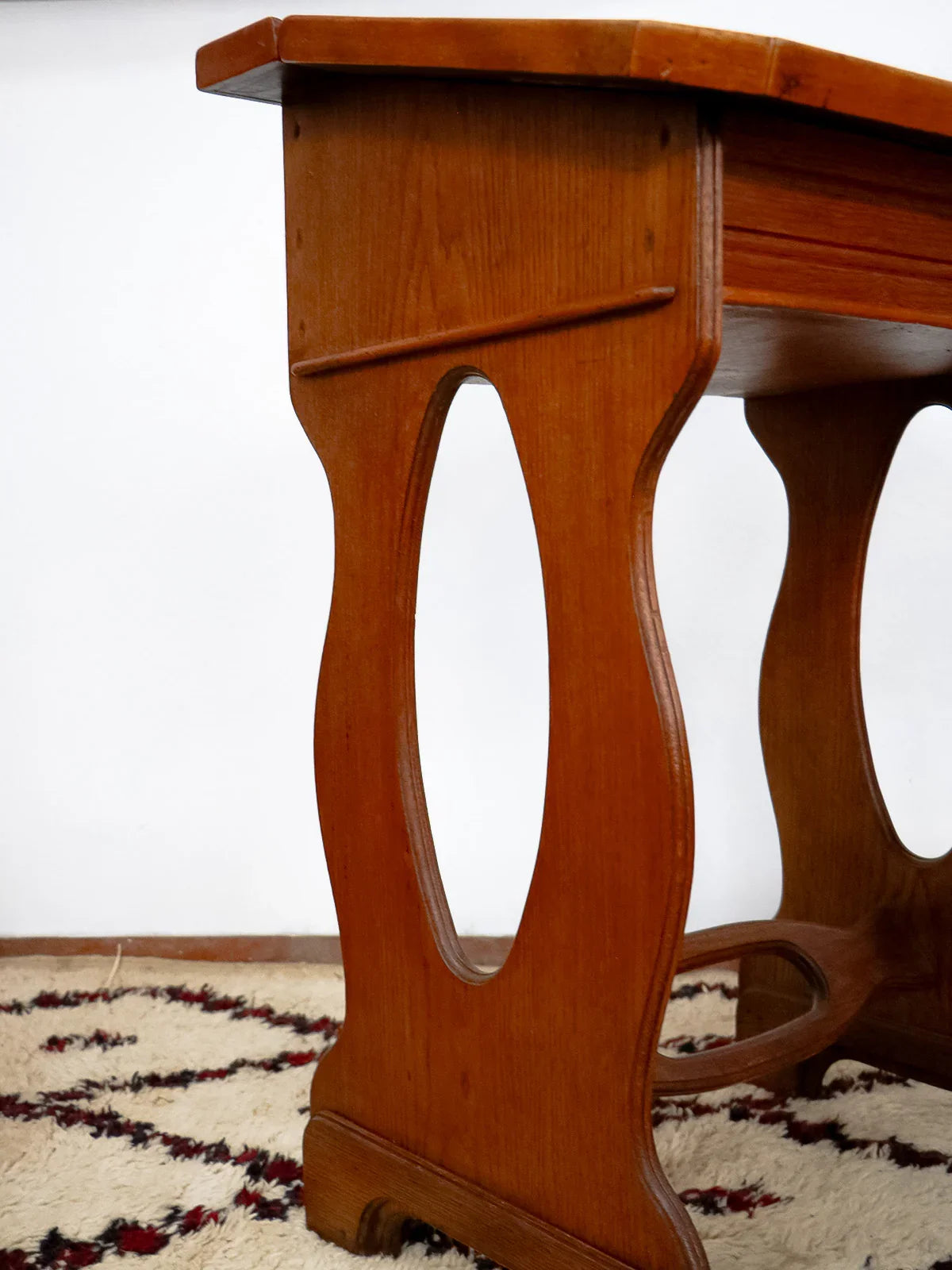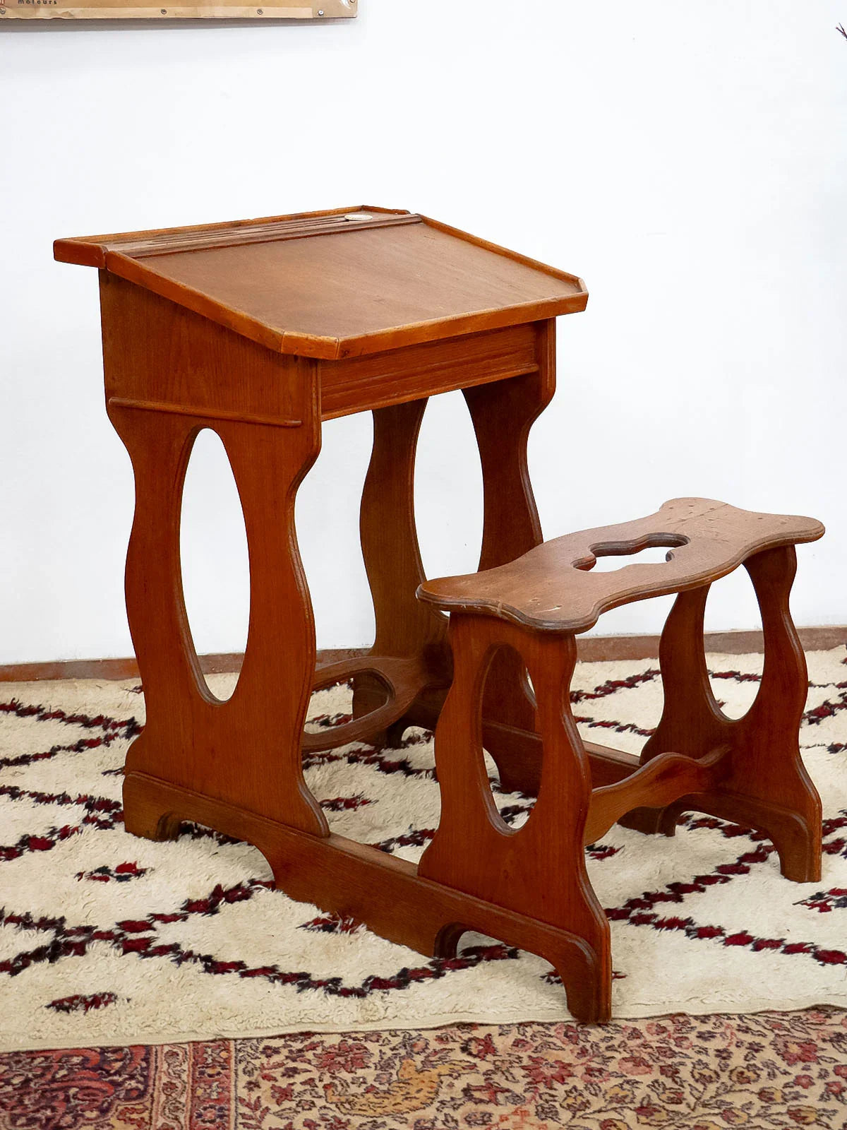Discover this oak school desk from the 1900s, its dark wood and classic school lines telling a story. Its plywood top lifts for convenient storage, revealing an interior pen tray and the original porcelain inkwell, ideal for a child's bedroom or a retro-style study nook. Designed for a child's seat, it brings a warm and authentic presence to the room. There are some traces of ink and paint inside.