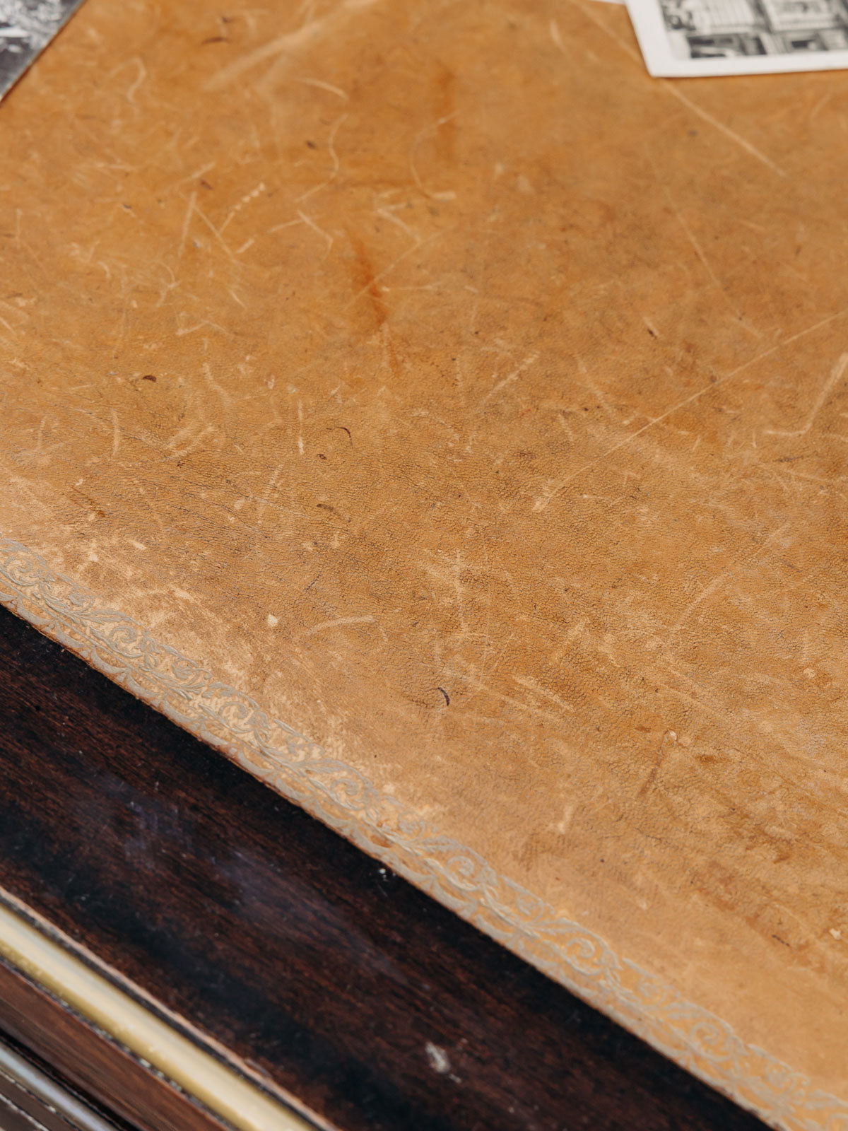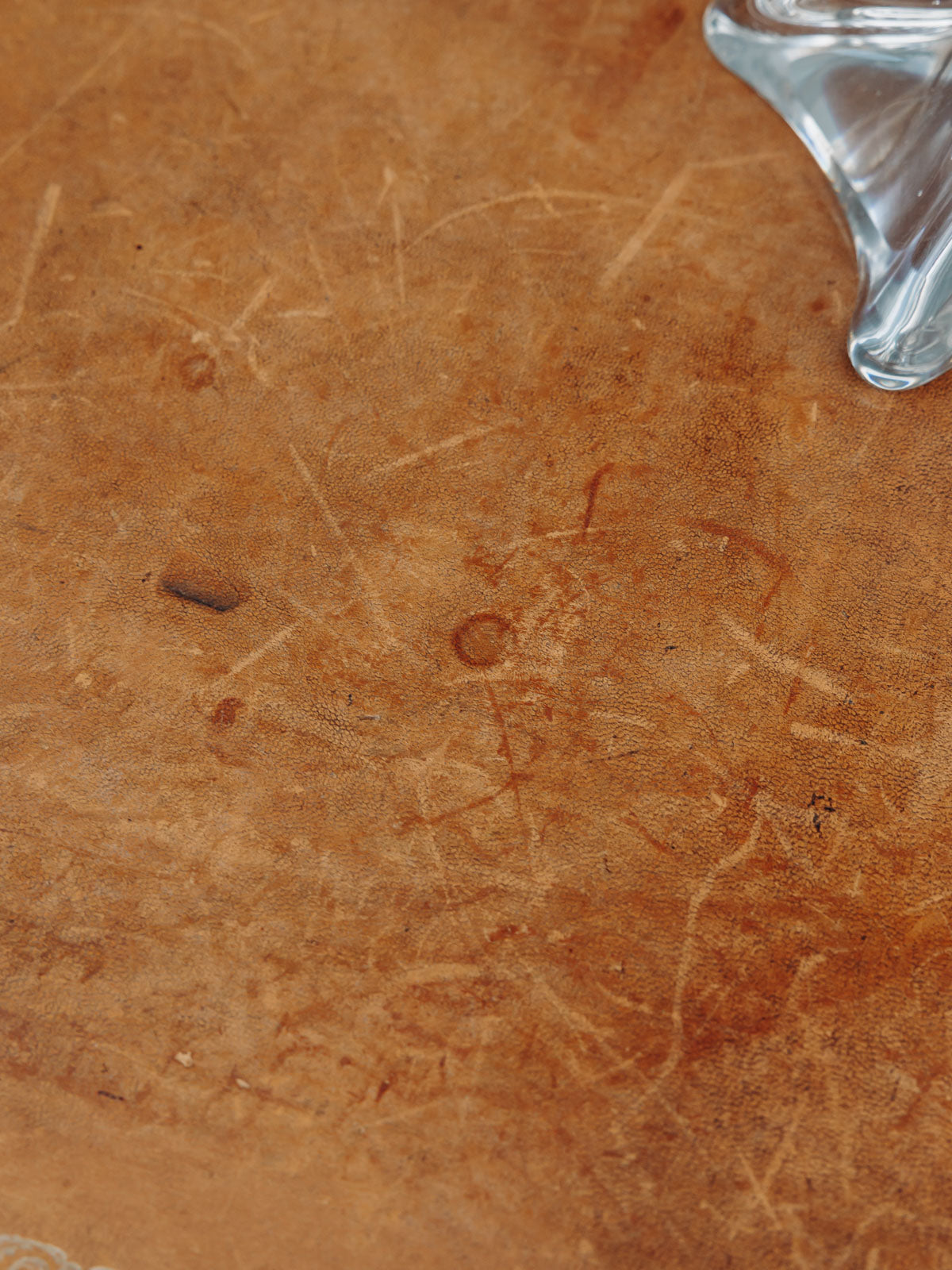 Elevate your workspace with this dark wood desk, featuring a leather top and gold trim that accentuates its classic and elegant lines. Its two lockable drawers with keys offer discreet and organized storage, ideal for a home office or bedroom, while its balanced proportions maximize surface area without cluttering the room. The combination of leather and wood creates a warm and refined atmosphere. Minor signs of age are present.