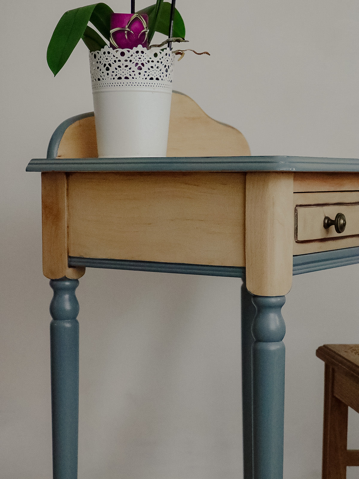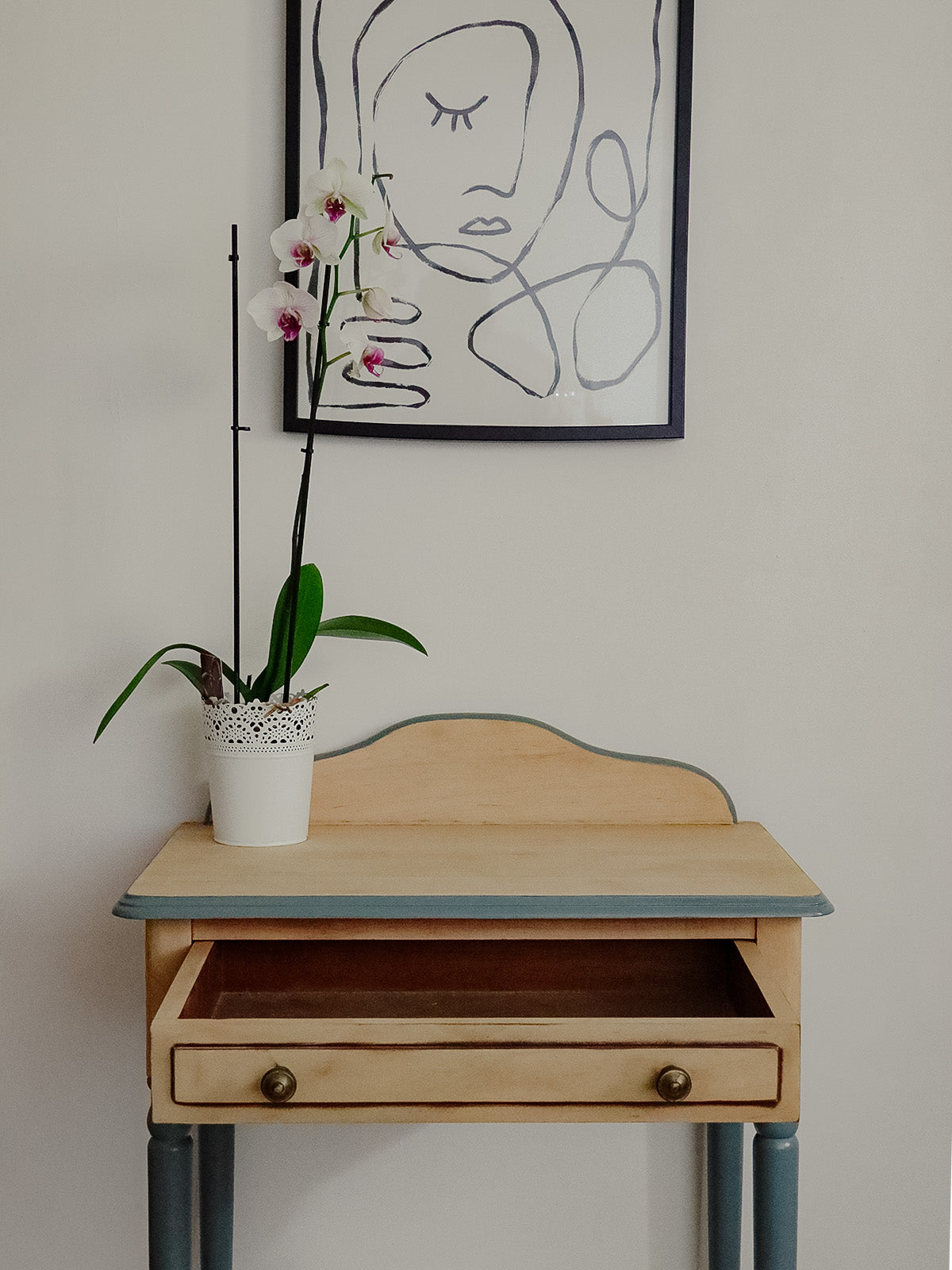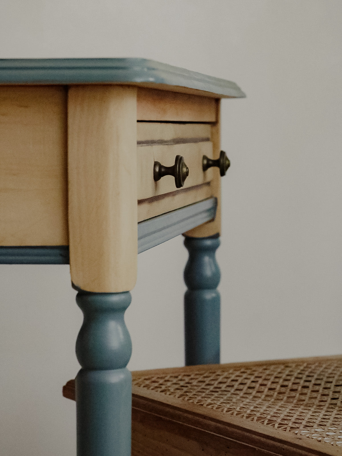 Choose this small desk in solid beech with clean lines and a light wood finish, enhanced by blue-painted legs that add a touch of understated character. Its compact surface offers a comfortable workspace for a laptop or writing, while its drawer provides storage for pens, notebooks, and everyday papers. Simple yet inviting, it creates a calm and functional atmosphere, ideal for a home office, bedroom, or entryway.