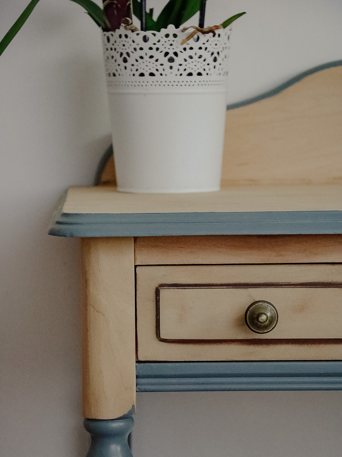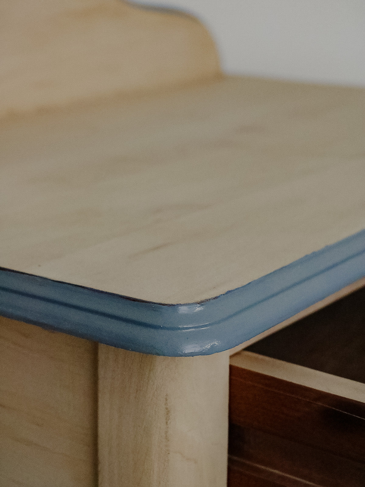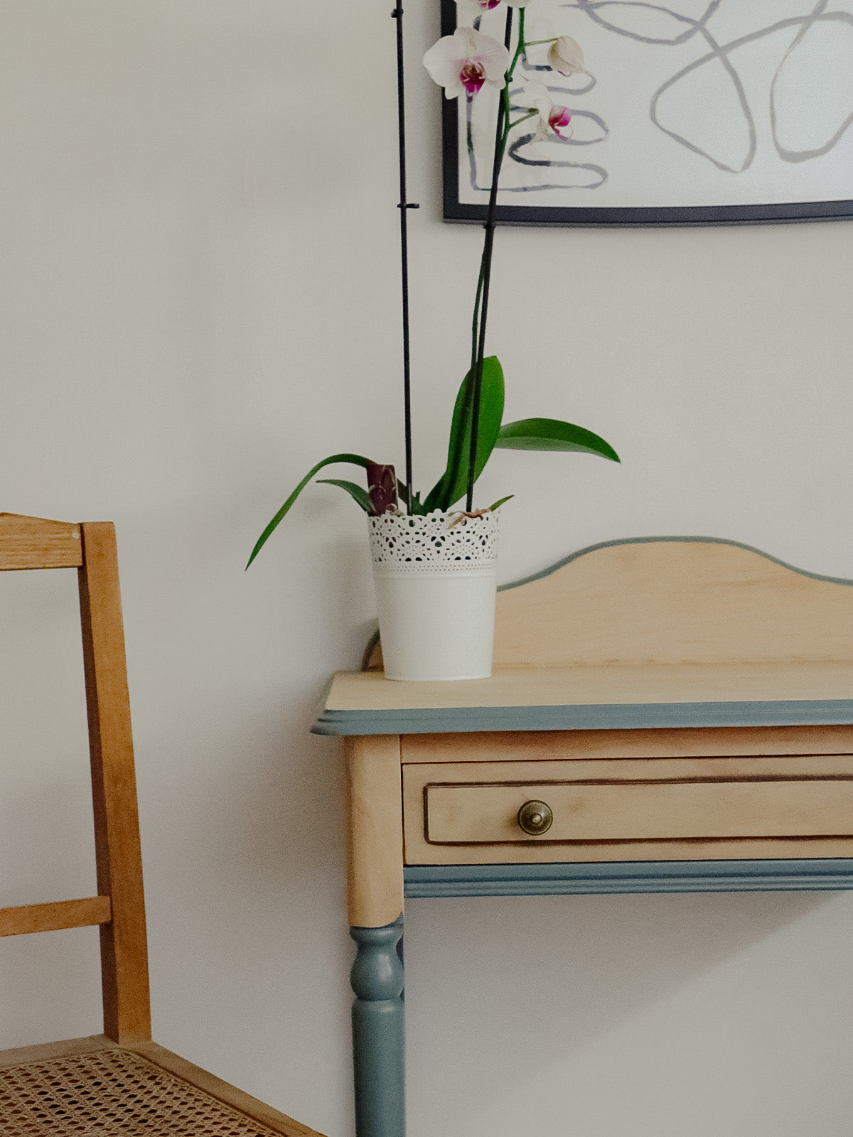 Choose this small desk in solid beech with clean lines and a light wood finish, enhanced by blue-painted legs that add a touch of understated character. Its compact surface offers a comfortable workspace for a laptop or writing, while its drawer provides storage for pens, notebooks, and everyday papers. Simple yet inviting, it creates a calm and functional atmosphere, ideal for a home office, bedroom, or entryway.