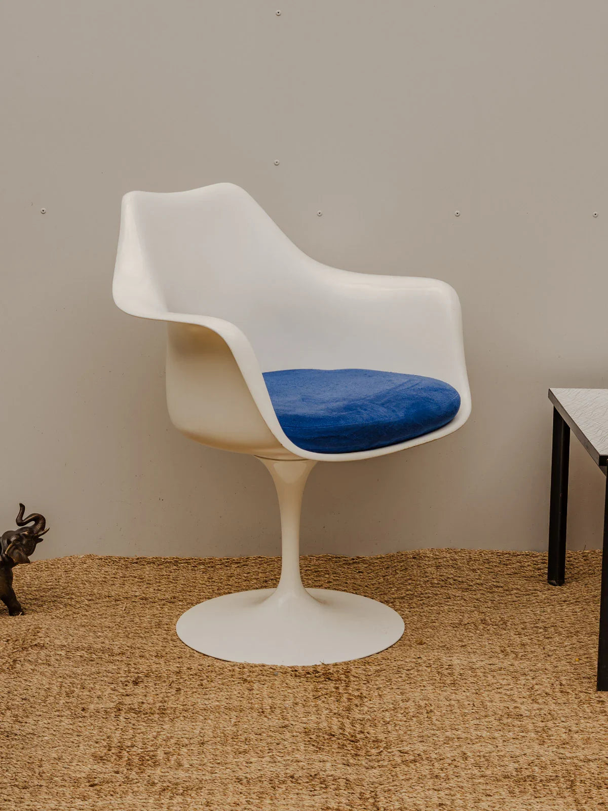 Embrace this swivel armchair by Knoll, featuring a white metal frame and a soft, blue velvet cushion that lends a modern and inviting silhouette. Its deep seat and proportions make it ideal for a reading nook, office, or living room where comfort and understated elegance are desired. The contrast between metal and velvet creates a warm, contemporary ambiance that easily complements various interior styles. Some signs of wear are present.