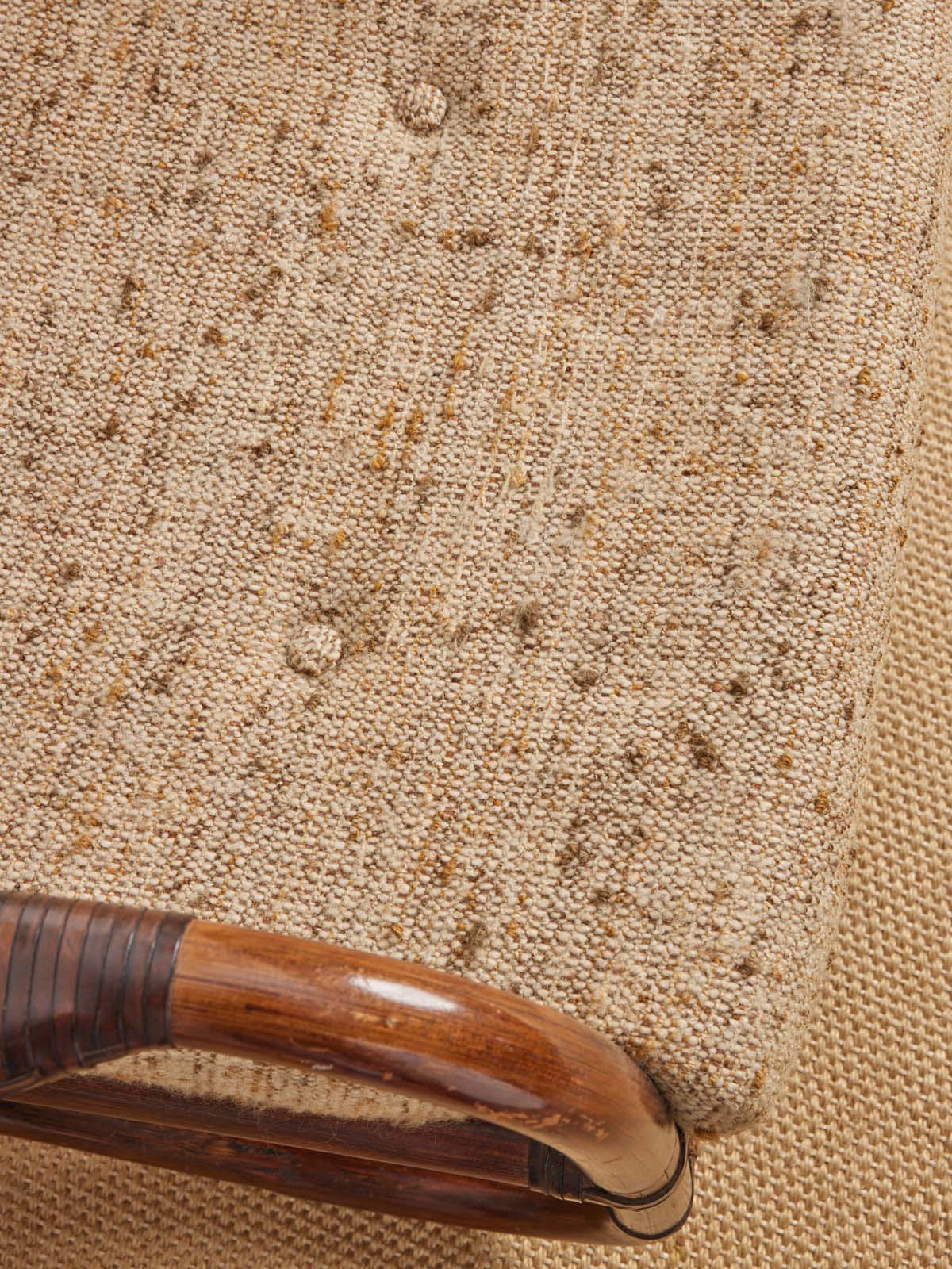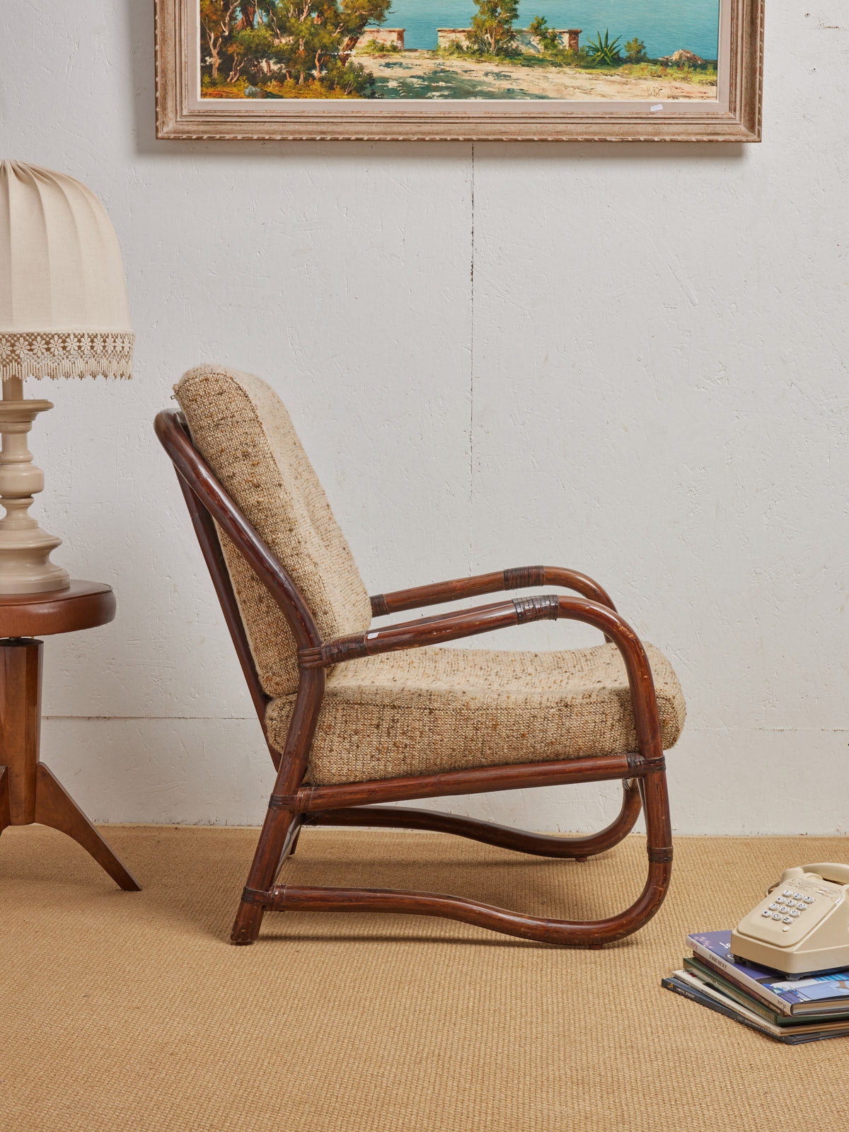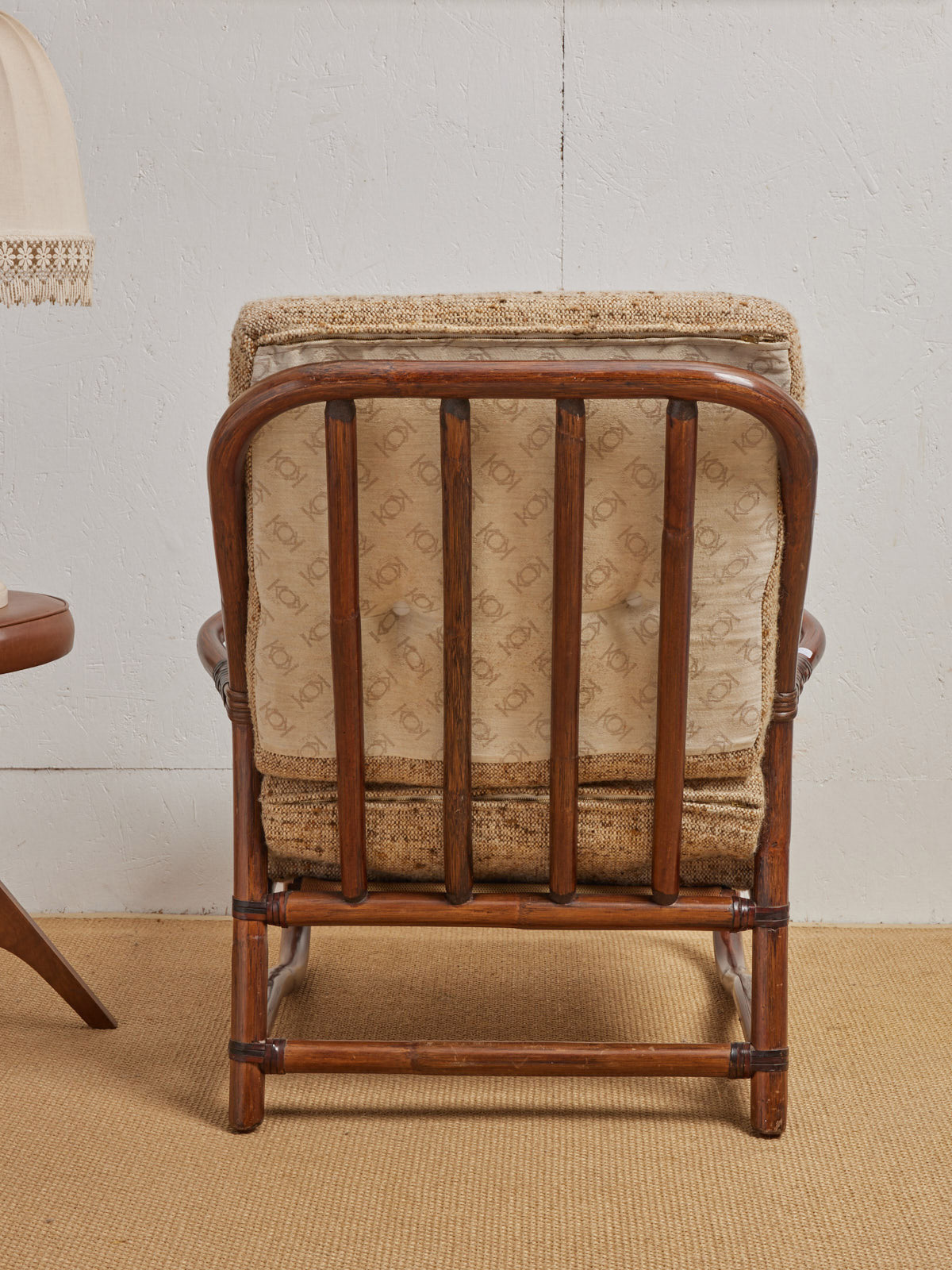 Embrace this curved bamboo armchair from the 1970s, where the natural elegance of bamboo meets the comfort of a fabric upholstery and a two-part seat. Its airy silhouette and inviting proportions make it ideal for a reading nook, a veranda, or a bohemian-chic living room. The bamboo base emphasizes an organic aesthetic, while the fabric adds softness and warmth, inviting relaxation in an authentic and refined atmosphere.