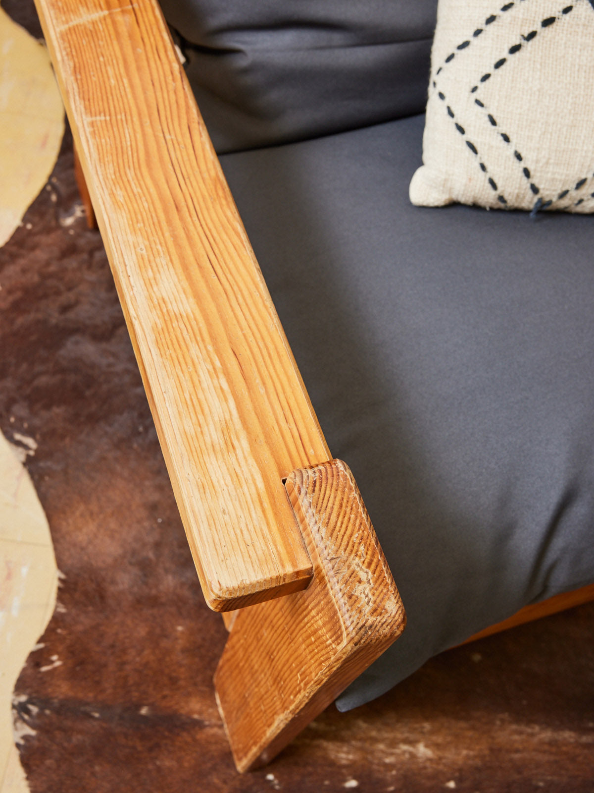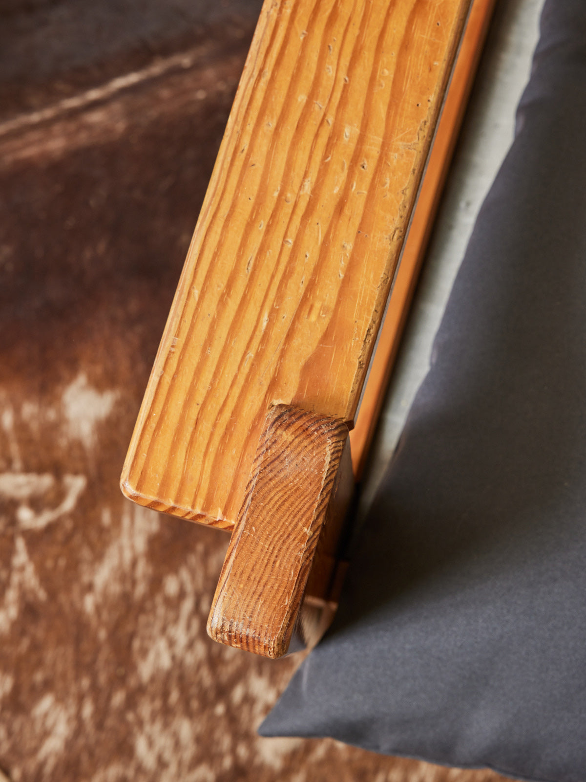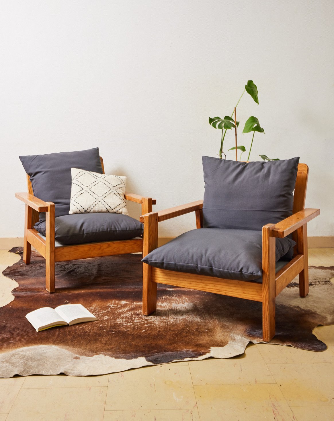 Discover a pair of pine armchairs with a beautifully aged patina, combining the warmth of reclaimed wood with a simple, refined silhouette. Their lightweight frame highlights the pine grain, while the new anthracite gray cushions offer a soft seat and a contemporary contrast. Perfect for creating a discreet reading nook in the living room or inviting relaxation on a sheltered terrace, they establish an elegant and welcoming atmosphere. The wood bears some marks of time, telling the story of these armchairs.