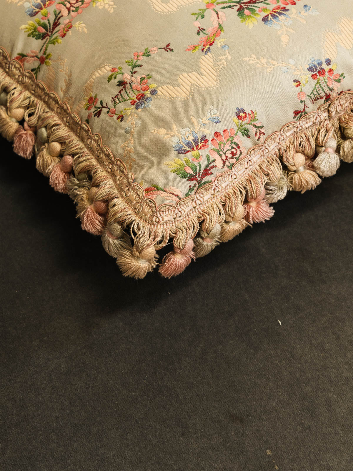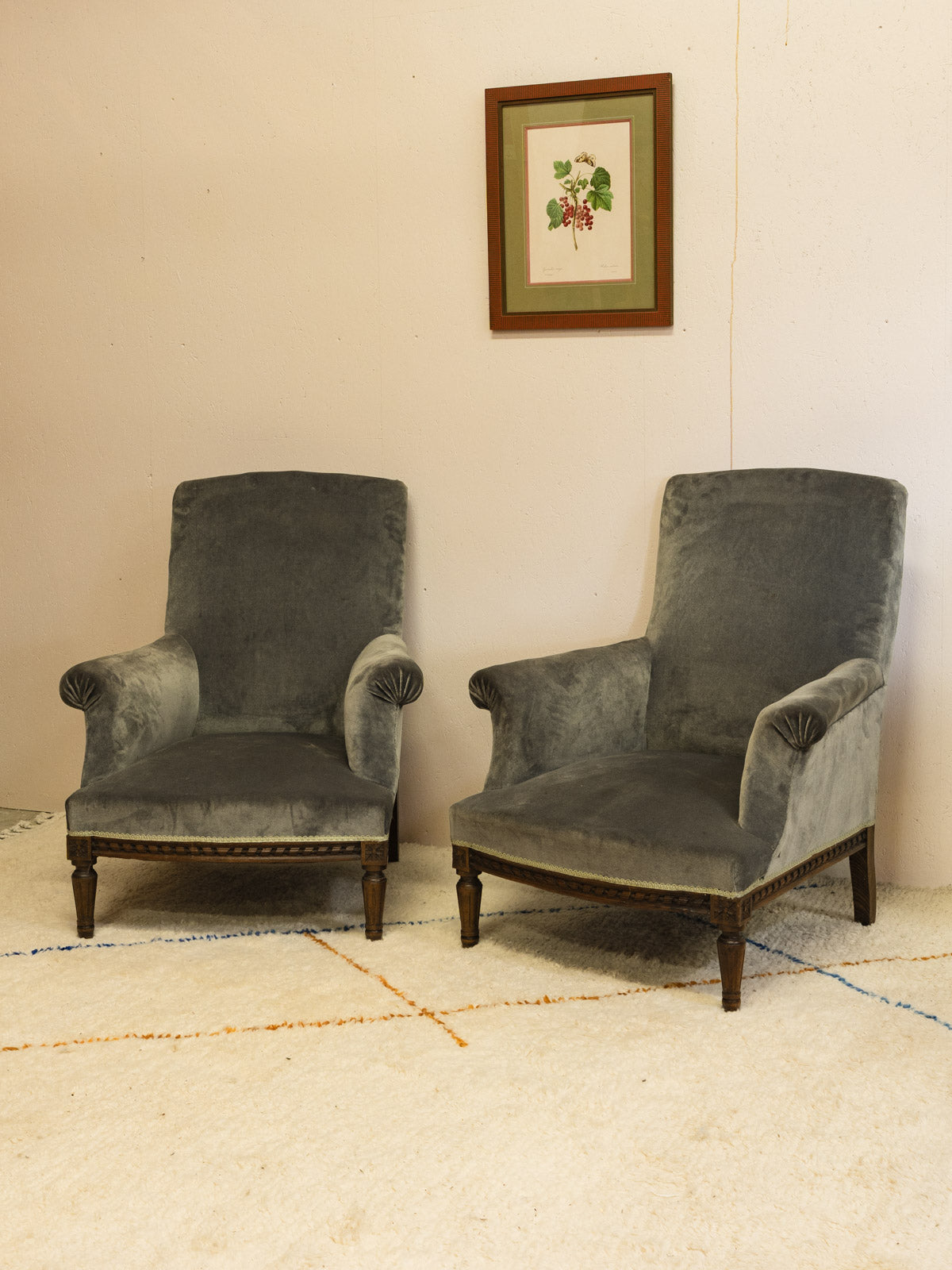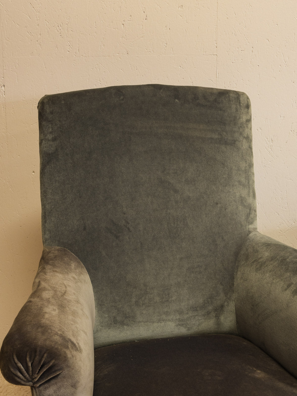 Invite a pair of green-grey velvet armchairs to enrich your living room; their wooden frames offer a warm and refined silhouette. Sold with two floral and tassel cushions, they bring a retro-chic touch ideal for a reading nook or an intimate conversation area, while the velvet highlights the depth of the color and promises enveloping comfort every day. A few signs of wear: a stain on the seat of one armchair and a slightly torn backrest on one of the armchairs.