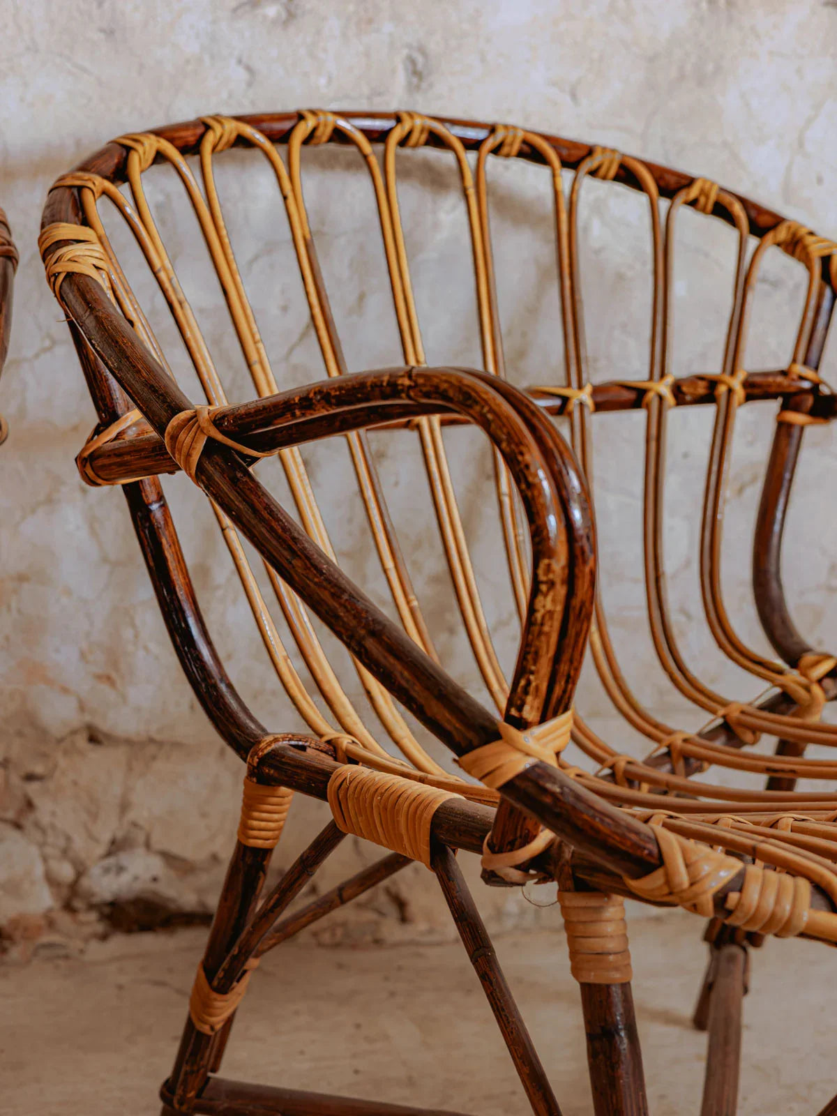 Adopt this 70s rattan armchair, where the alchemy of light and dark wood creates a play of warm contrasts; its low seat and balanced proportions offer an enveloping comfort, ideal for a reading nook or a covered terrace. The wooden structure and rattan frame provide a natural and timeless look, perfect for bohemian-chic or minimalist Scandinavian decor. Easy to integrate, they enhance natural light and invite daily relaxation. Sold individually, 2 pieces available.