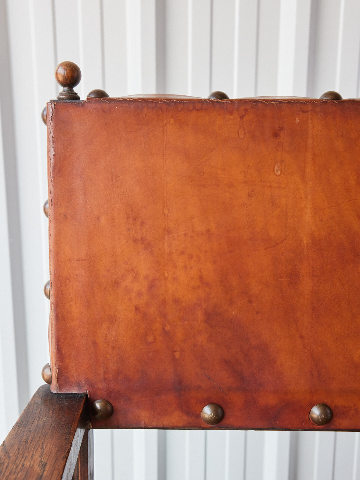 Embrace this large studded leather armchair, supported by a carved wooden frame that accentuates its classic and architectural appeal. The richly textured leather, aged by time, invites relaxation, while the carved wood provides an elegant and refined contrast. Its generous proportions offer enveloping comfort, ideal for a reading nook or a living room that cultivates a warm and sophisticated atmosphere.