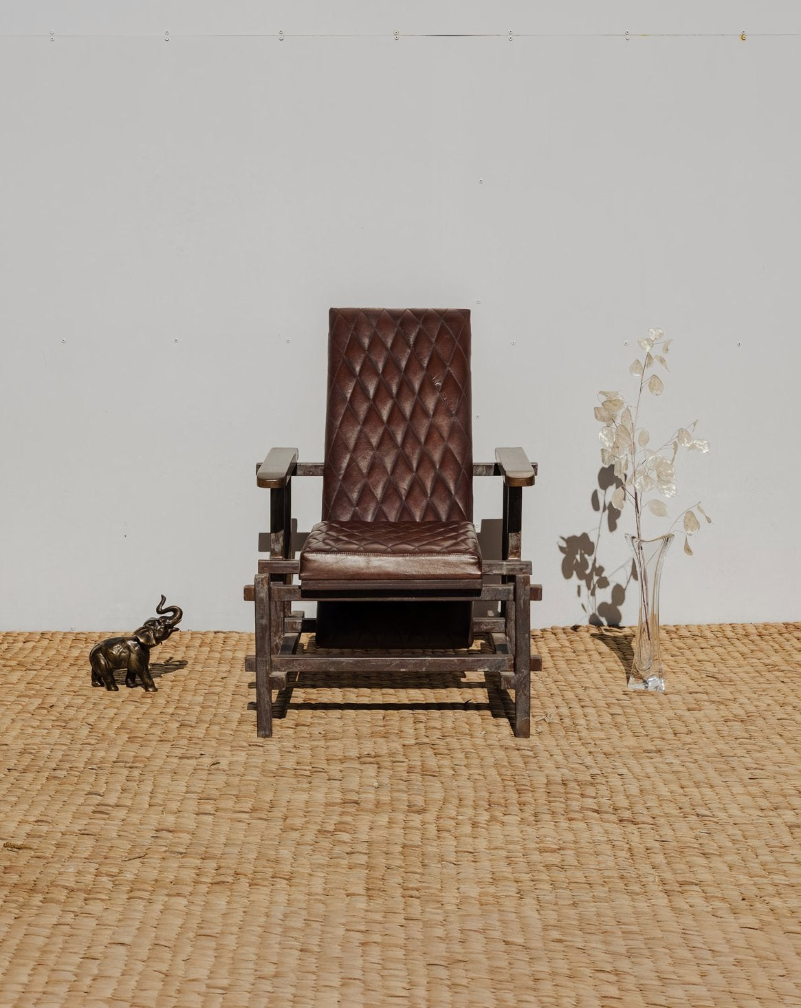 Embrace this chair with a wooden frame inspired by Thomas Rietveld's design, reinterpreted by Francesco Segura, whose brown leather seat and backrest invite relaxation. Its graphic lines and proportions bring a distinctive presence, ideal for a reading nook or a retro-contemporary living room, while the warmth of the leather and wood creates a cozy and sophisticated atmosphere. Some traces of time are present.