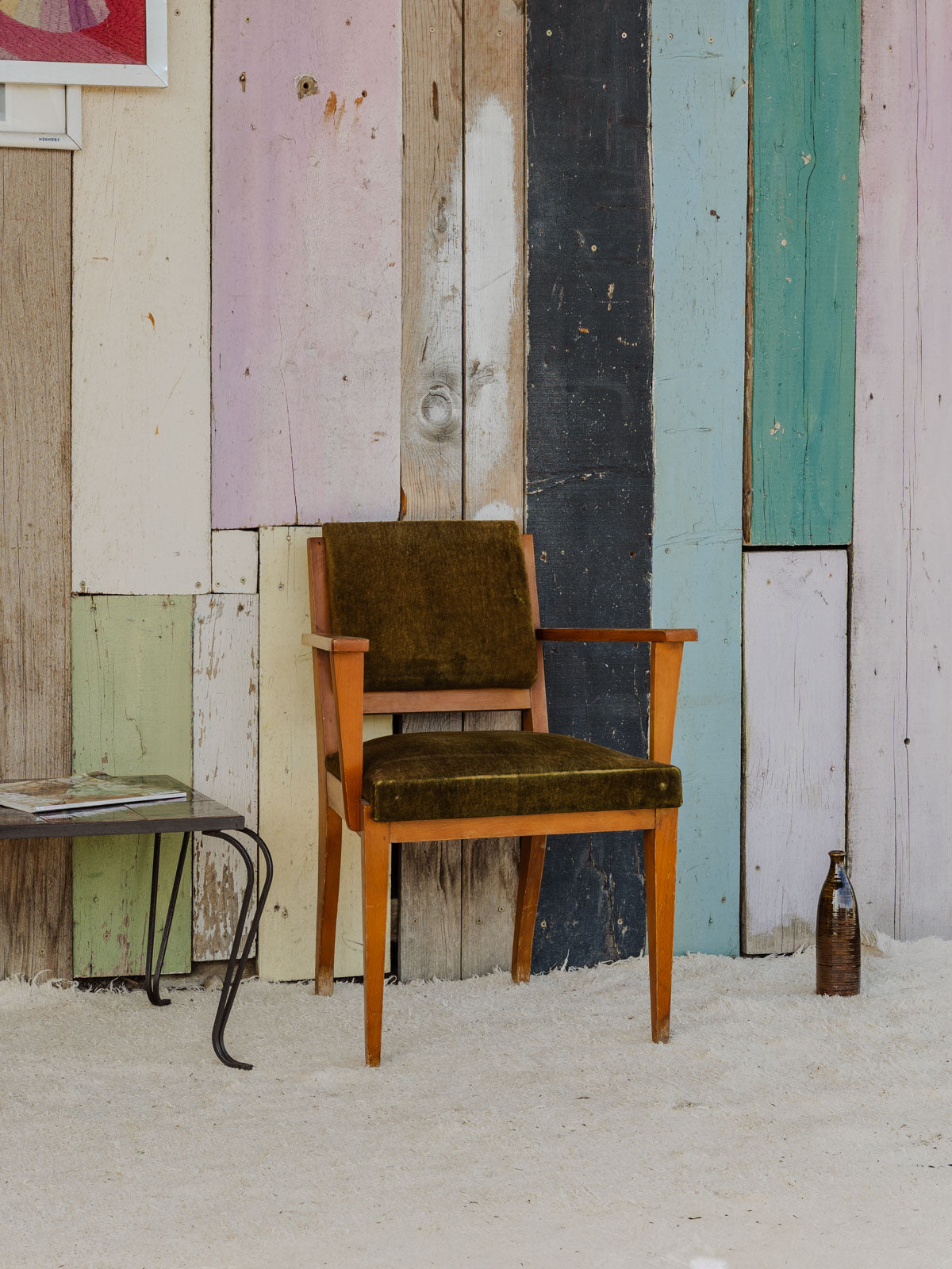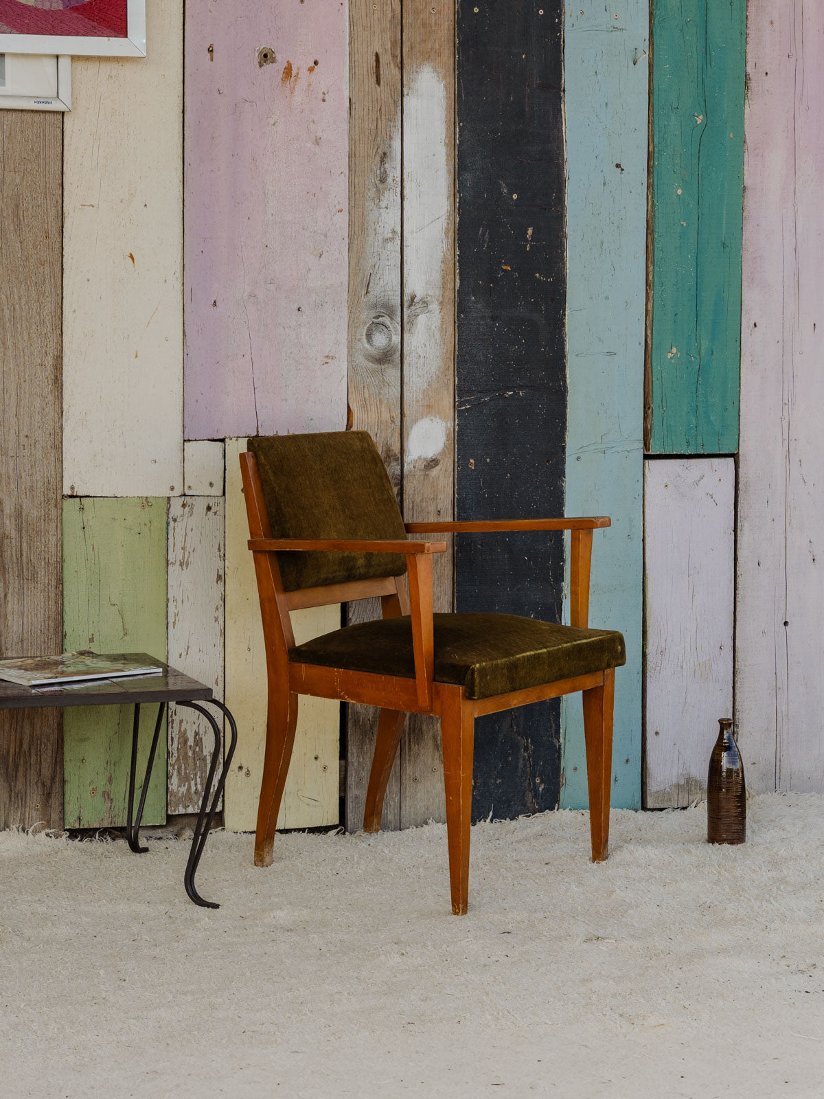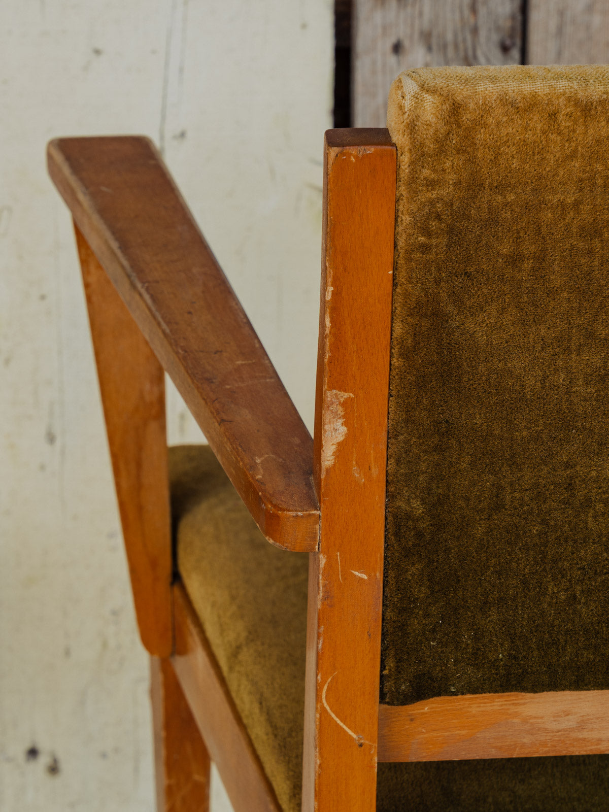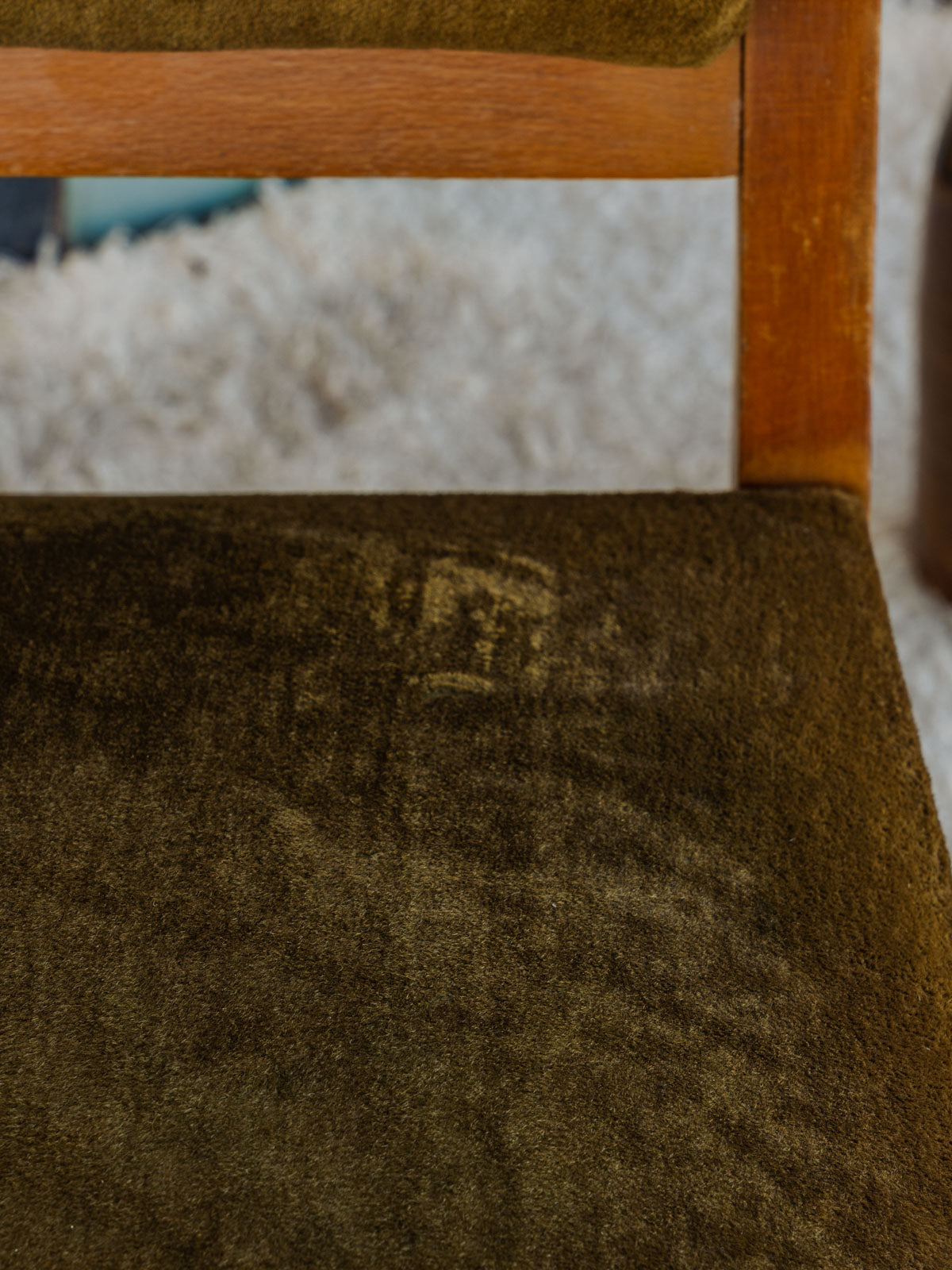 Adopt this armchair with a wooden structure, upholstered in deep green velvet that invites relaxation. Its generous seat and enveloping backrest offer immediate comfort, ideal for a reading nook or an intimate living room, while its balanced proportions fit easily into different spaces. The contrast between the warmth of the wood and the softness of the fabric creates an elegant and welcoming atmosphere. Some traces of time present.