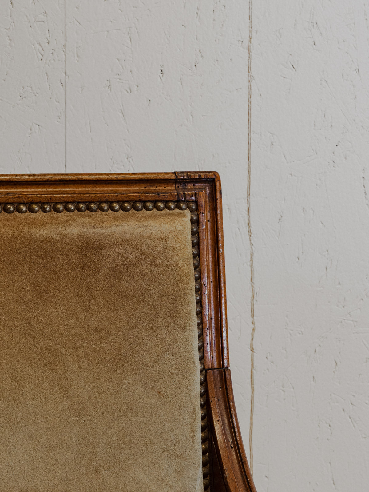 Adopt this wooden armchair, with a back and seat upholstered in light green nubuck and accented with studs that give it a discreet elegance. Its generously proportioned structure and deep seat offer welcoming comfort, ideal for a reading nook or intimate conversation. Its design blends sobriety and character, creating a warm and refined atmosphere in a living room or office. Some signs of age are present.