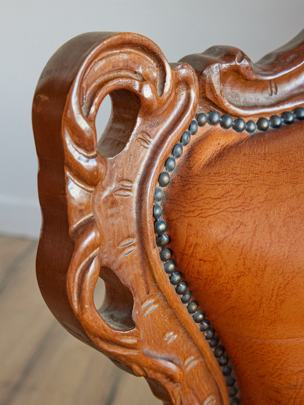 Choose a pair of Baroque-style armchairs upholstered in light brown leather, whose smooth surface reveals a subtle patina. The carved wood framing the shapes and the rich ornamentation of buttons and studs highlight meticulous craftsmanship, while the generous seating invites you to read or chat by the fire. Their classic silhouette integrates seamlessly into both contemporary and more traditional interiors, creating an elegant and inviting contrast. A small touch-up is present on one of the armchairs, but this does not detract from the overall charm of these exceptional pieces.