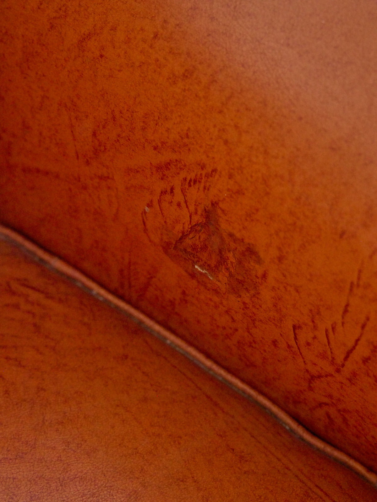 Choose a pair of Baroque-style armchairs upholstered in light brown leather, whose smooth surface reveals a subtle patina. The carved wood framing the shapes and the rich ornamentation of buttons and studs highlight meticulous craftsmanship, while the generous seating invites you to read or chat by the fire. Their classic silhouette integrates seamlessly into both contemporary and more traditional interiors, creating an elegant and inviting contrast. A small touch-up is present on one of the armchairs, but this does not detract from the overall charm of these exceptional pieces.