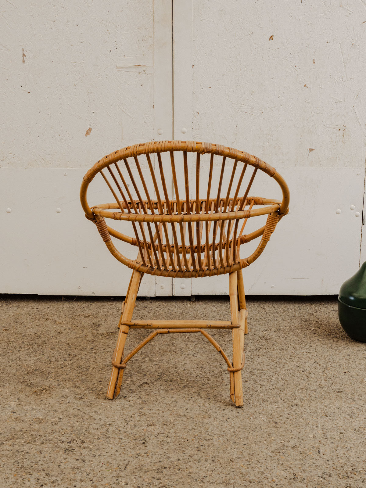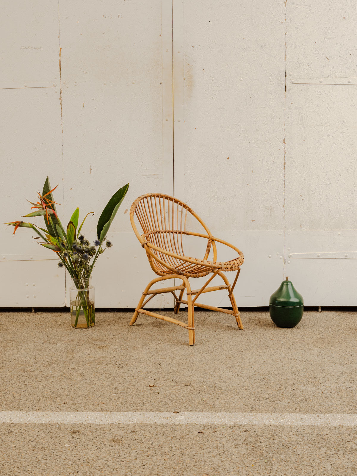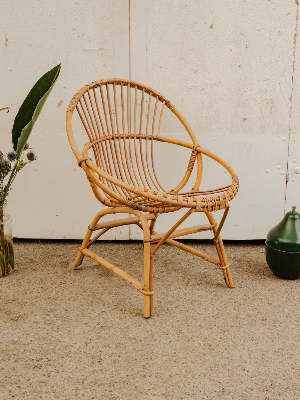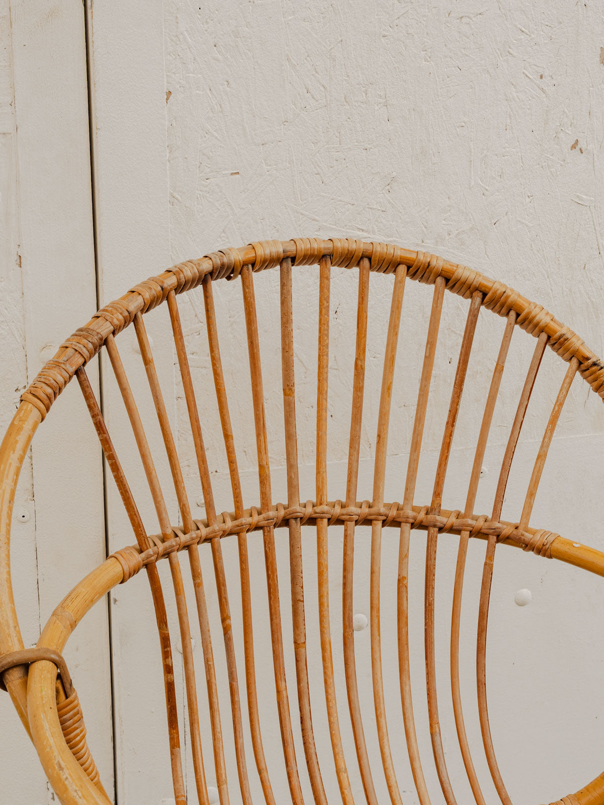 Adoptez ce fauteuil rond en rotin, dont l'ossature tressée exprime un savoir-faire naturel et léger. Sa silhouette enveloppante et ses proportions offrent une assise accueillante, idéale pour un coin lecture, une chambre ou une terrasse abritée, apportant une note bohème-chic et lumineuse à votre intérieur. Le rotin patiné diffuse une chaleur subtile qui se marie aux matières douces et aux couleurs naturelles. Quelques traces du temps présentes.