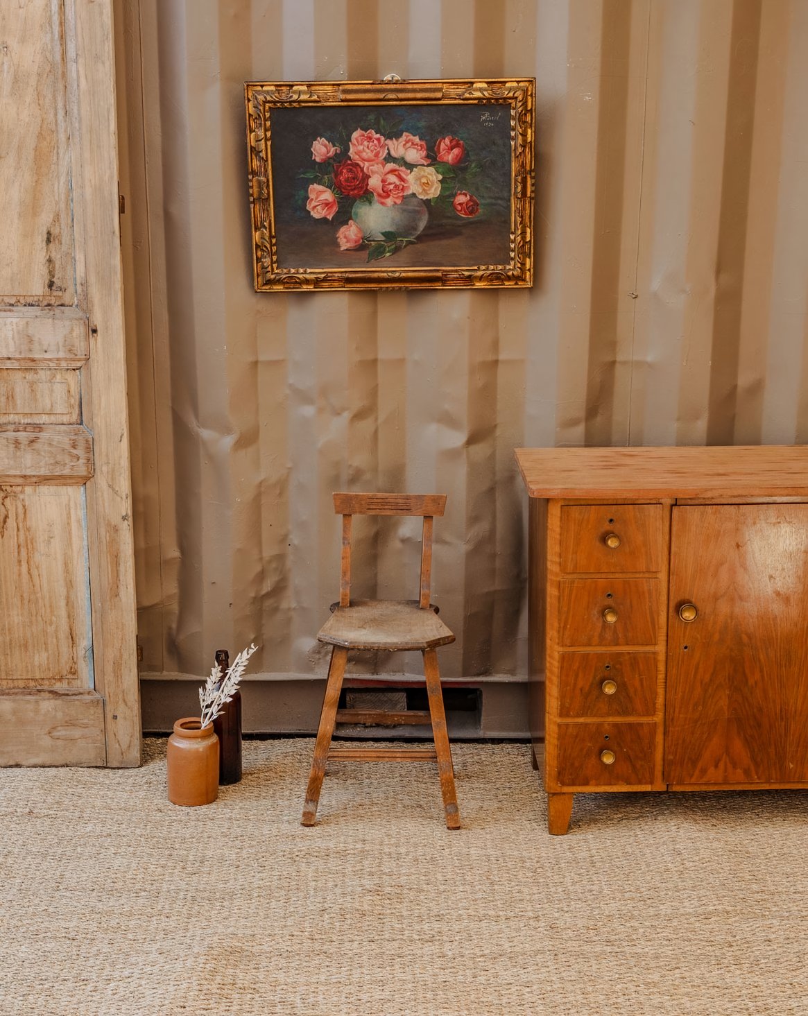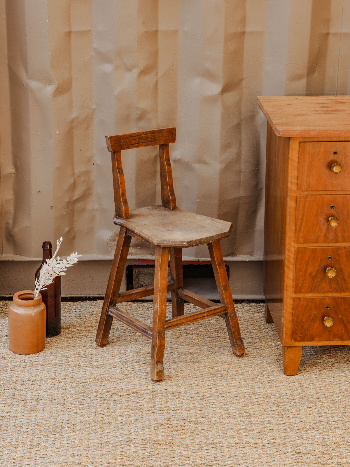 Choose this wooden farmhouse chair for children, its size making it easy to place around small tables and reading nooks. Its sturdy frame and natural patina reveal a discreet rustic charm, while the seat, designed for young children, promises comfort and stability for everyday use, creating a warm and timeless atmosphere perfect for play and reading. Some signs of age are present.