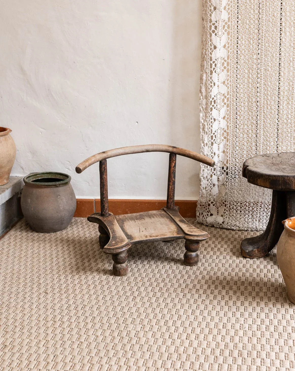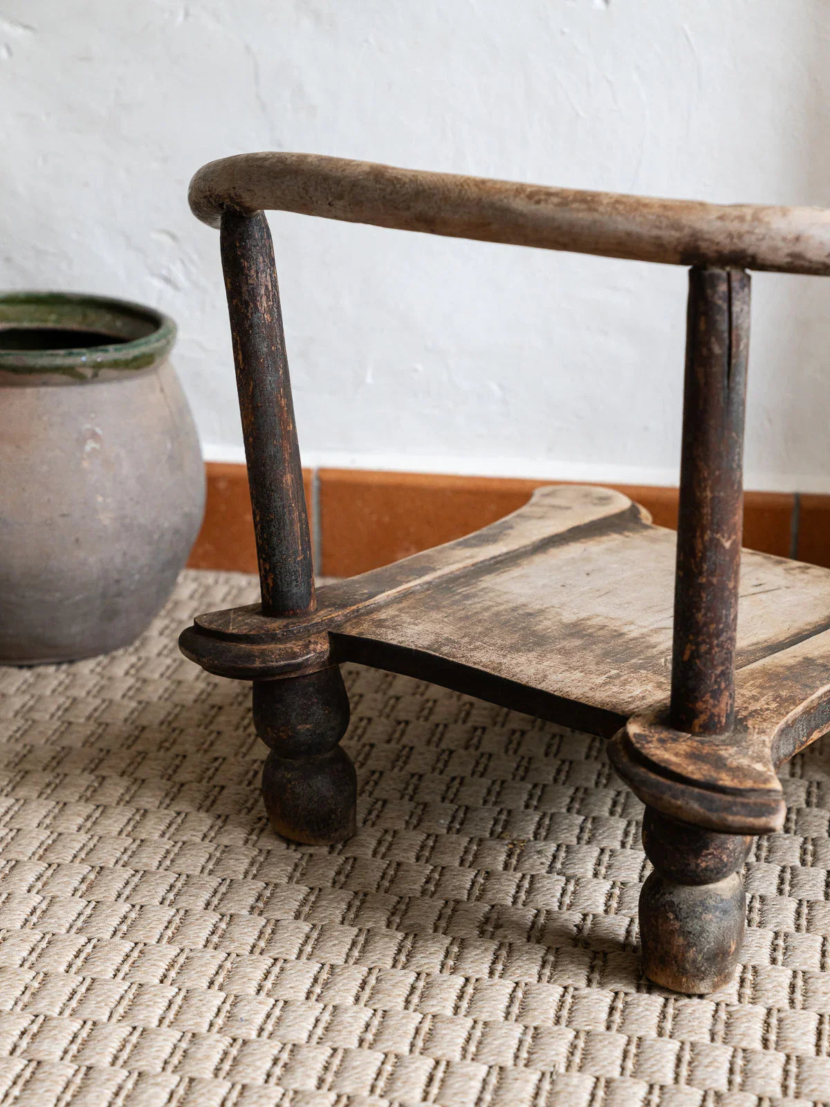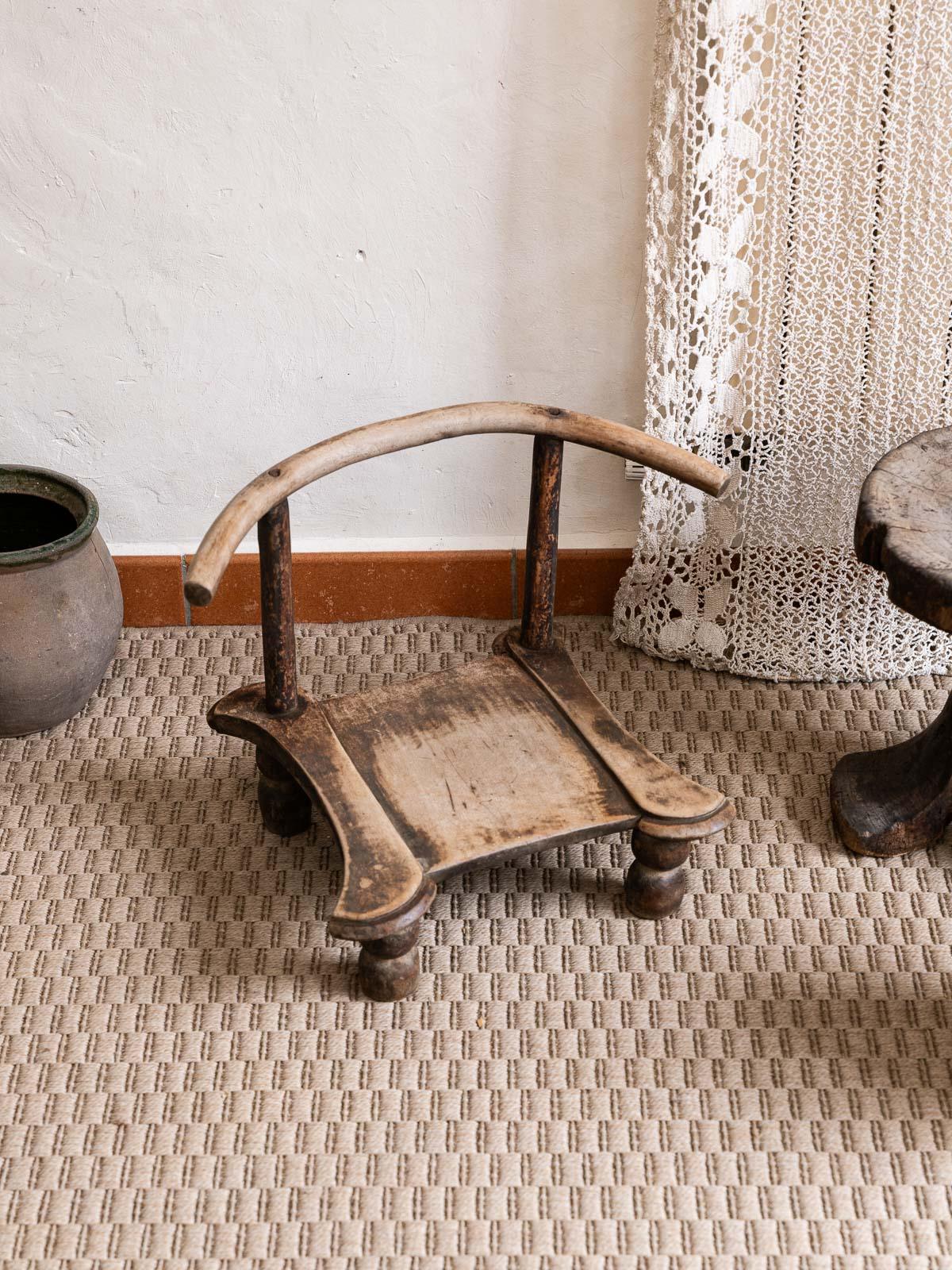 Adopt this small Baoulé chair from Ivory Coast, carved from dark wood with simple lines. Its size and low seat make it perfect for occasional use in a living room, entryway, or bedroom, adding a touch of handcrafted charm and a welcoming feel. The natural patina of the wood and the simplicity of its design create a warm, understated, and elegant atmosphere. Some signs of age are present.