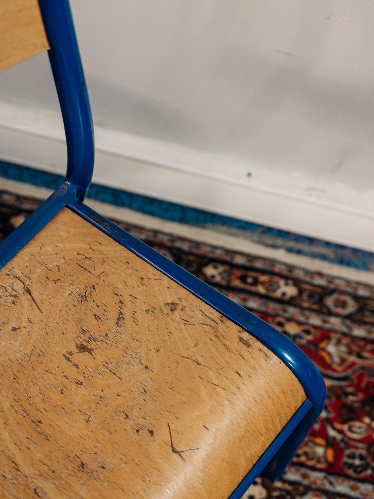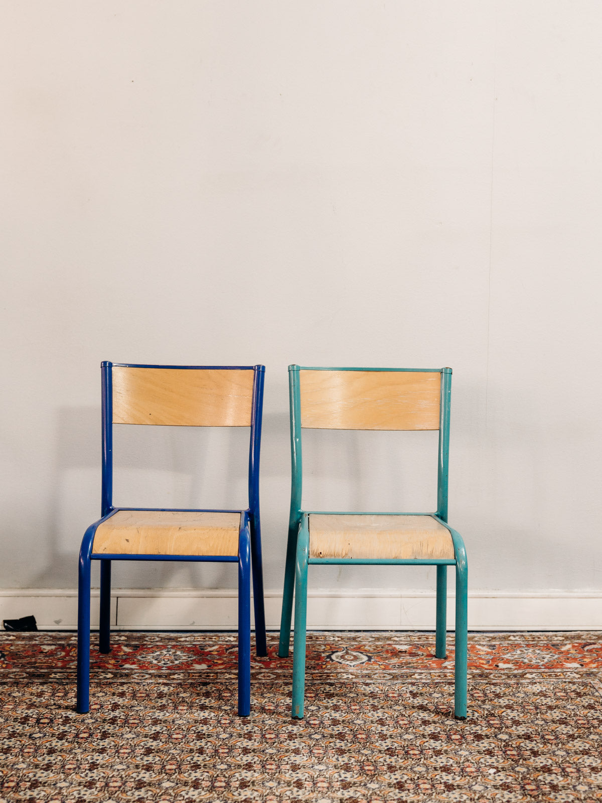 Embrace this dark blue metal chair with its simple and balanced design, combining a wooden seat and back for a warm and structured feel. Its lightweight construction and compact proportions make it equally suited to a city kitchen, a home office, or an intimate dining room, offering comfortable support and a graphic silhouette. The contrast between the deep hue of the metal and the patina of the wood creates a welcoming and contemporary atmosphere. A few signs of wear only add to its authenticity.