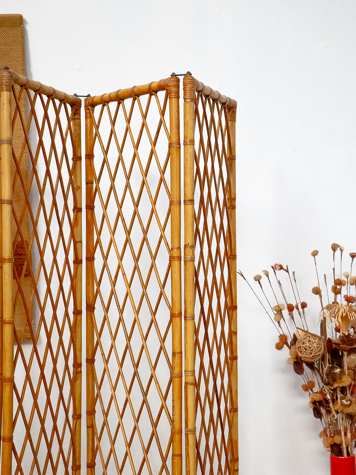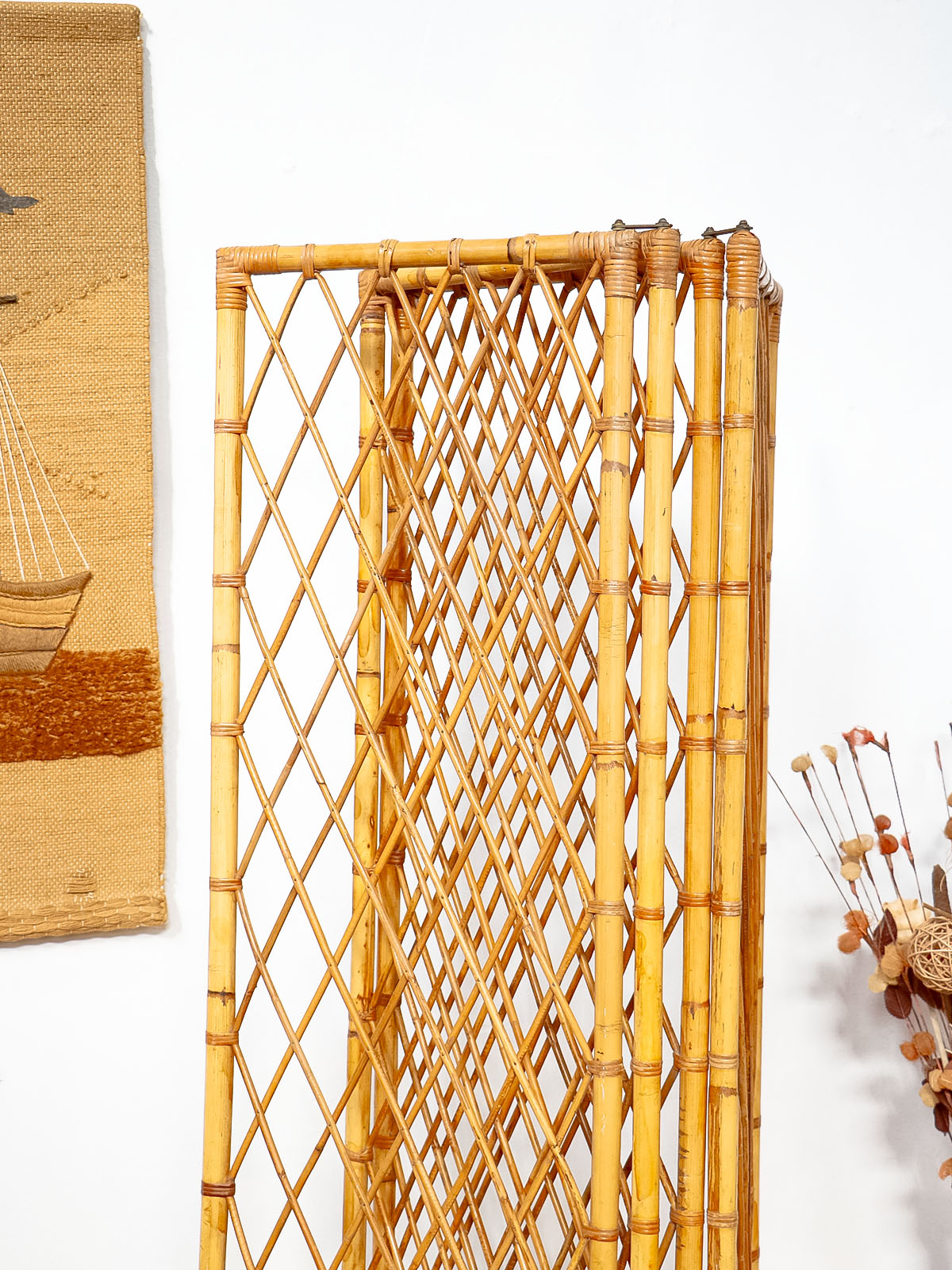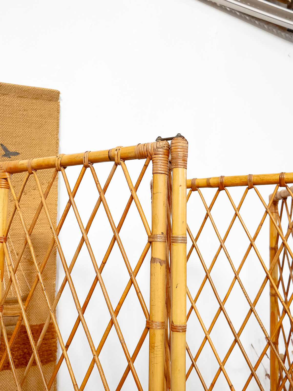 Invitez ce paravent en bambou et rotin au charme années 60, monté sur une structure en bambou et orné d'attaches en laiton. Ses quatre vantaux étroits dessinent une cloison légère et modulable, idéale pour séparer une chambre ou habiller un coin salon tout en laissant filtrer la lumière; il se plie finement pour un rangement discret. Le mélange de fibres naturelles et de bois crée une ambiance chaleureuse et élégante, entre vintage et bohème. Une petite réparation discrète.