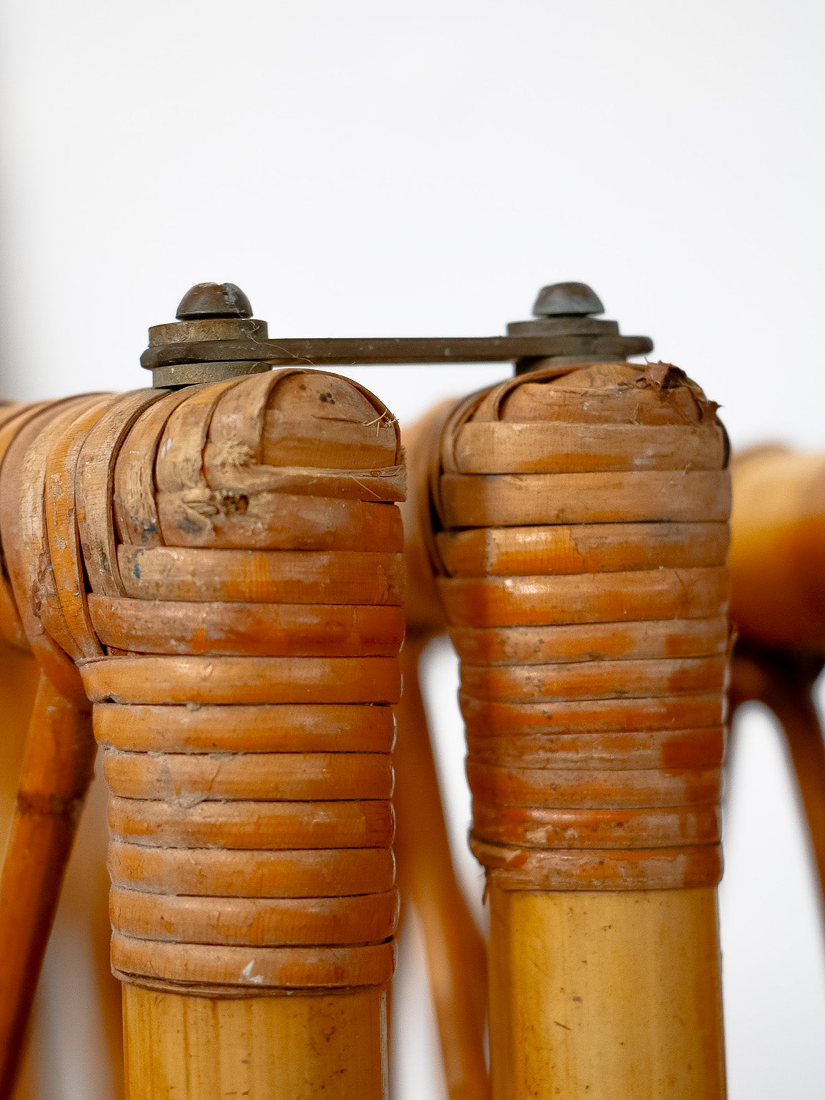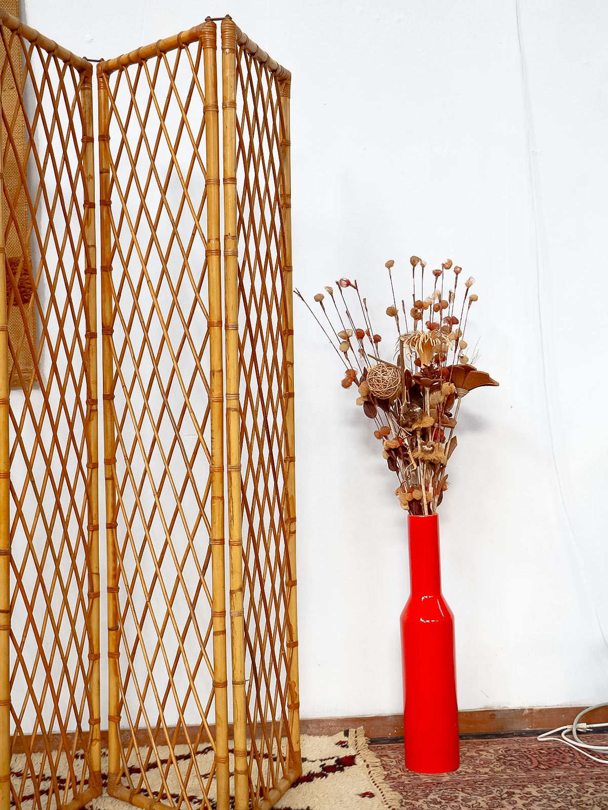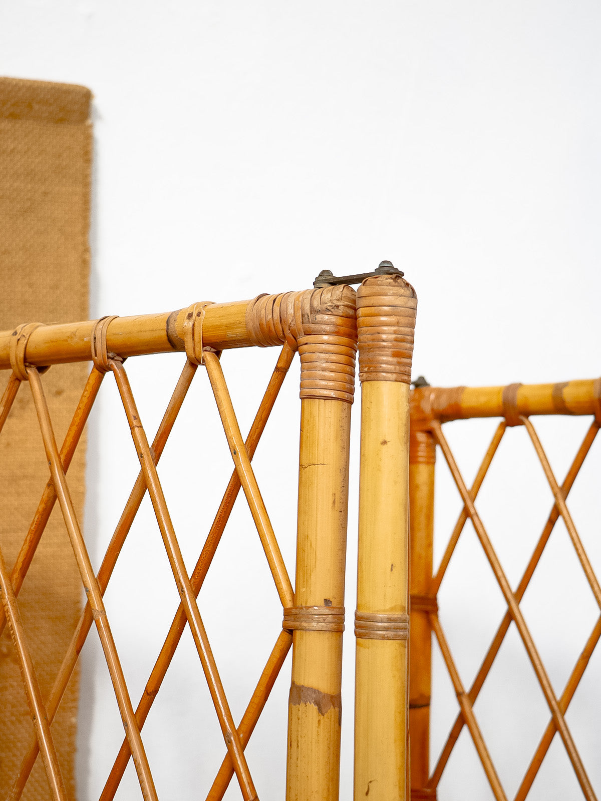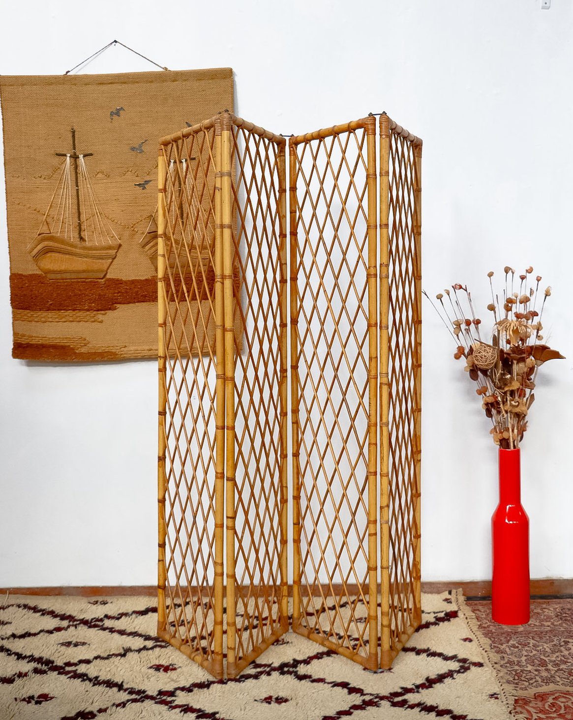 Invitez ce paravent en bambou et rotin au charme années 60, monté sur une structure en bambou et orné d'attaches en laiton. Ses quatre vantaux étroits dessinent une cloison légère et modulable, idéale pour séparer une chambre ou habiller un coin salon tout en laissant filtrer la lumière; il se plie finement pour un rangement discret. Le mélange de fibres naturelles et de bois crée une ambiance chaleureuse et élégante, entre vintage et bohème. Une petite réparation discrète.