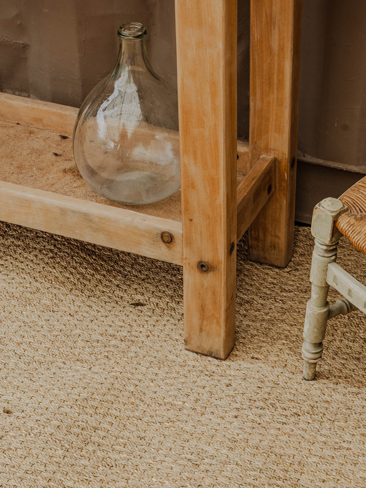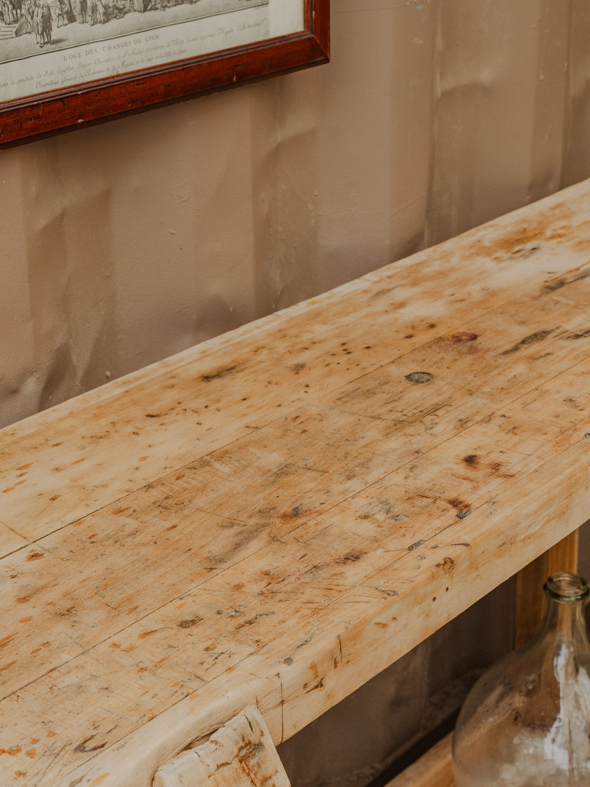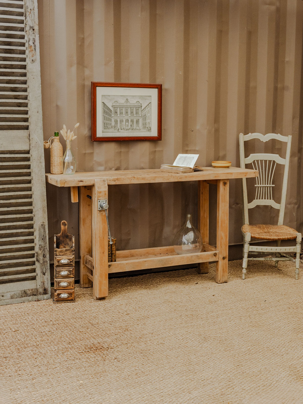 Embrace this antique wooden workbench, whose robust silhouette and under-table offer ample storage and a welcoming work surface. Its soft patina and natural wood grain highlight an authentic style that fits perfectly in a creative workshop, a kitchen, or a stylish entryway. Functional and warm, it adds character to both contemporary and rustic interiors. Some signs of age are present.