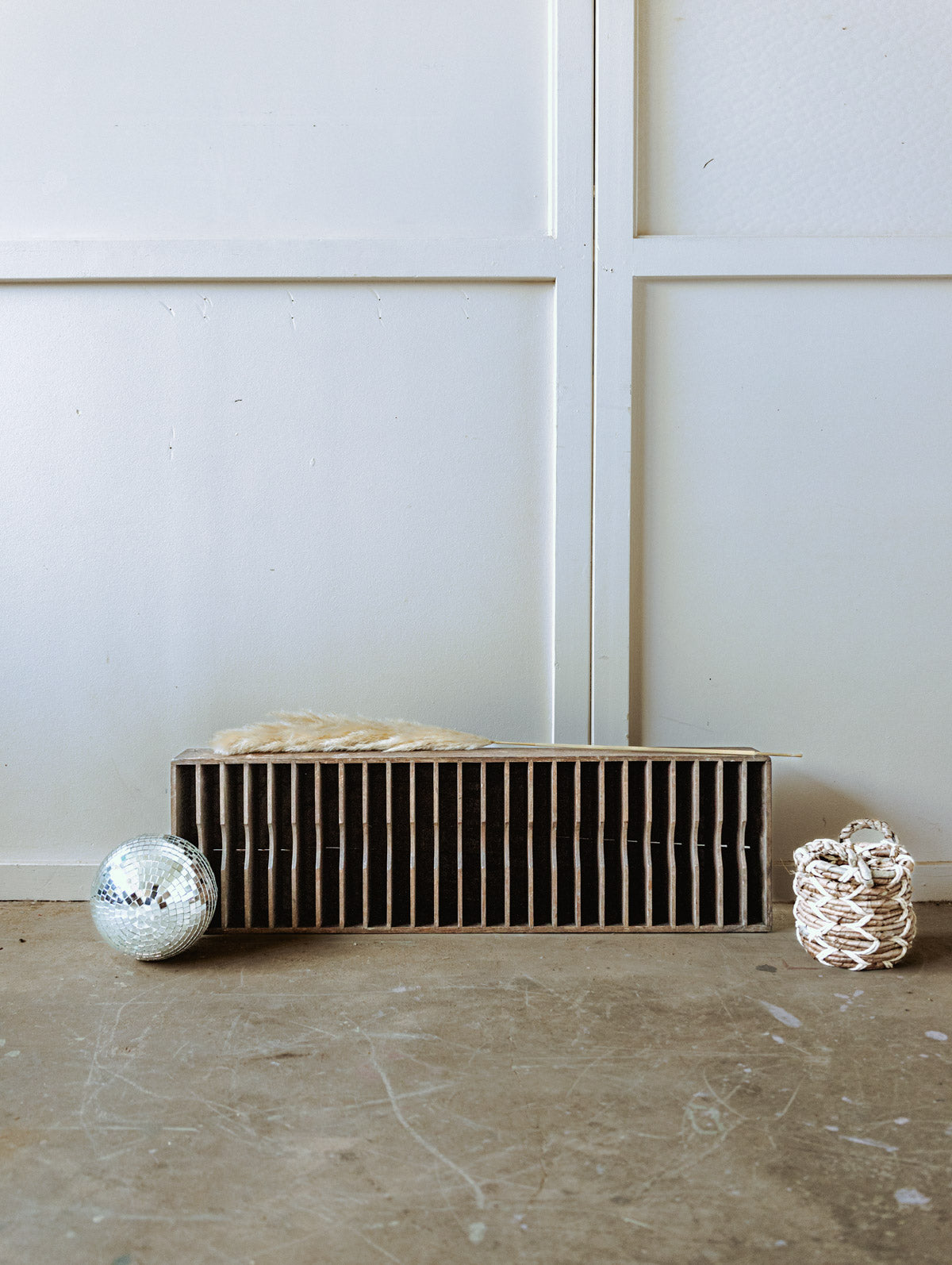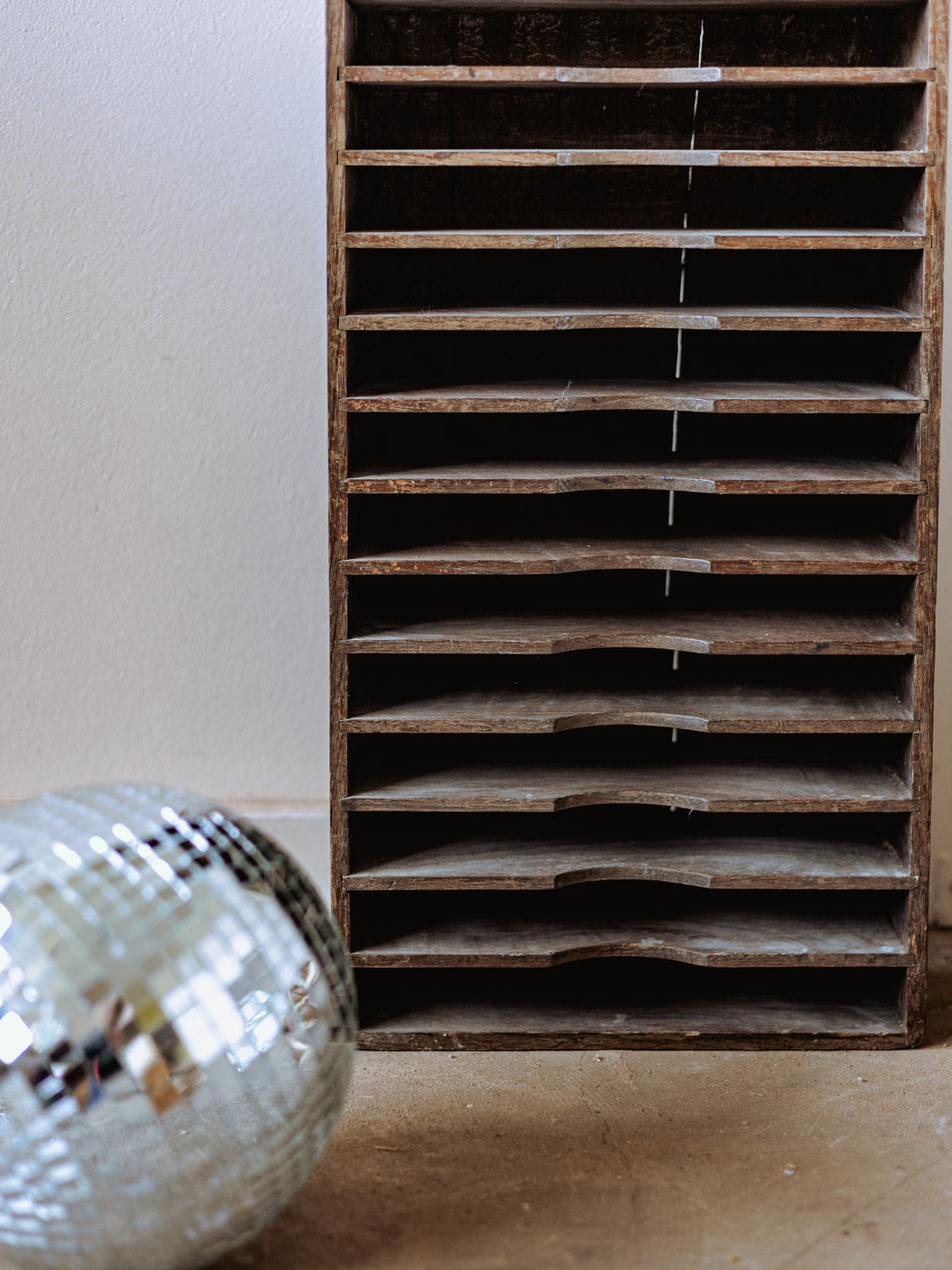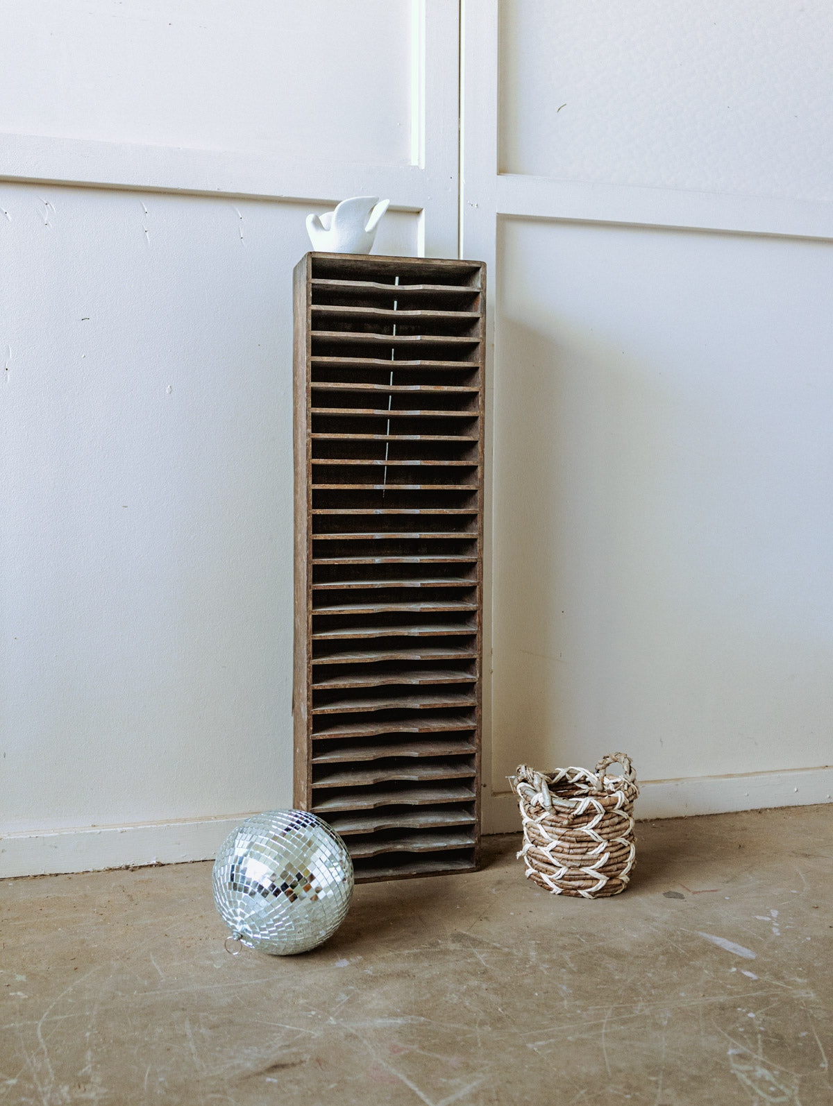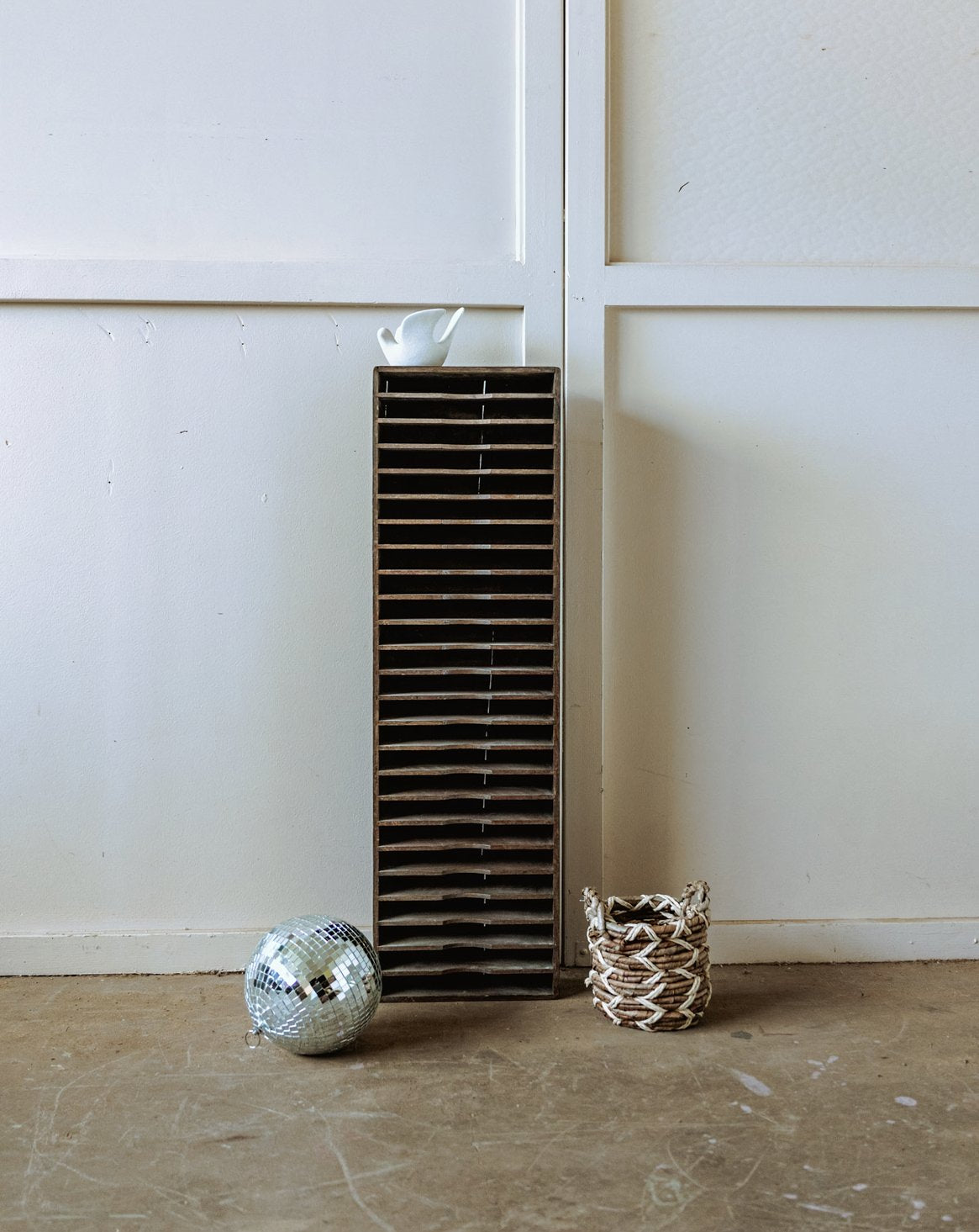 Adopt this wooden cabinet with twenty-four rows, slender and narrow, that naturally fits into a hallway or a small room, offering numerous compartments for organizing papers, small objects, and accessories. Its patinated hue and aged wood tell a warm and sober story, ideal for an authentic and contemporary decor. Marked traces of time.