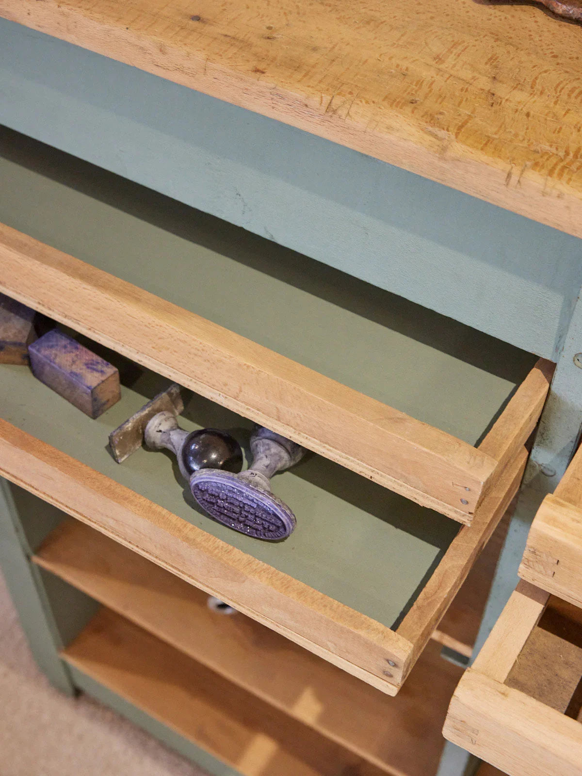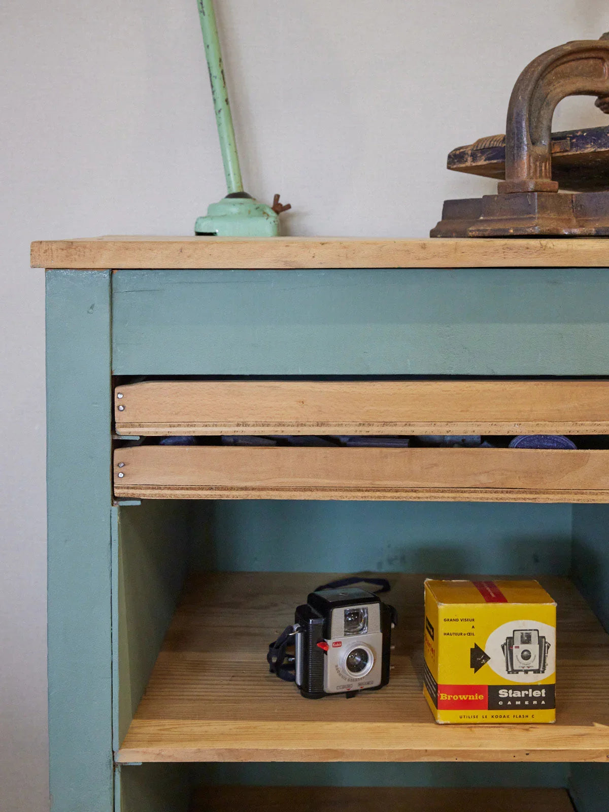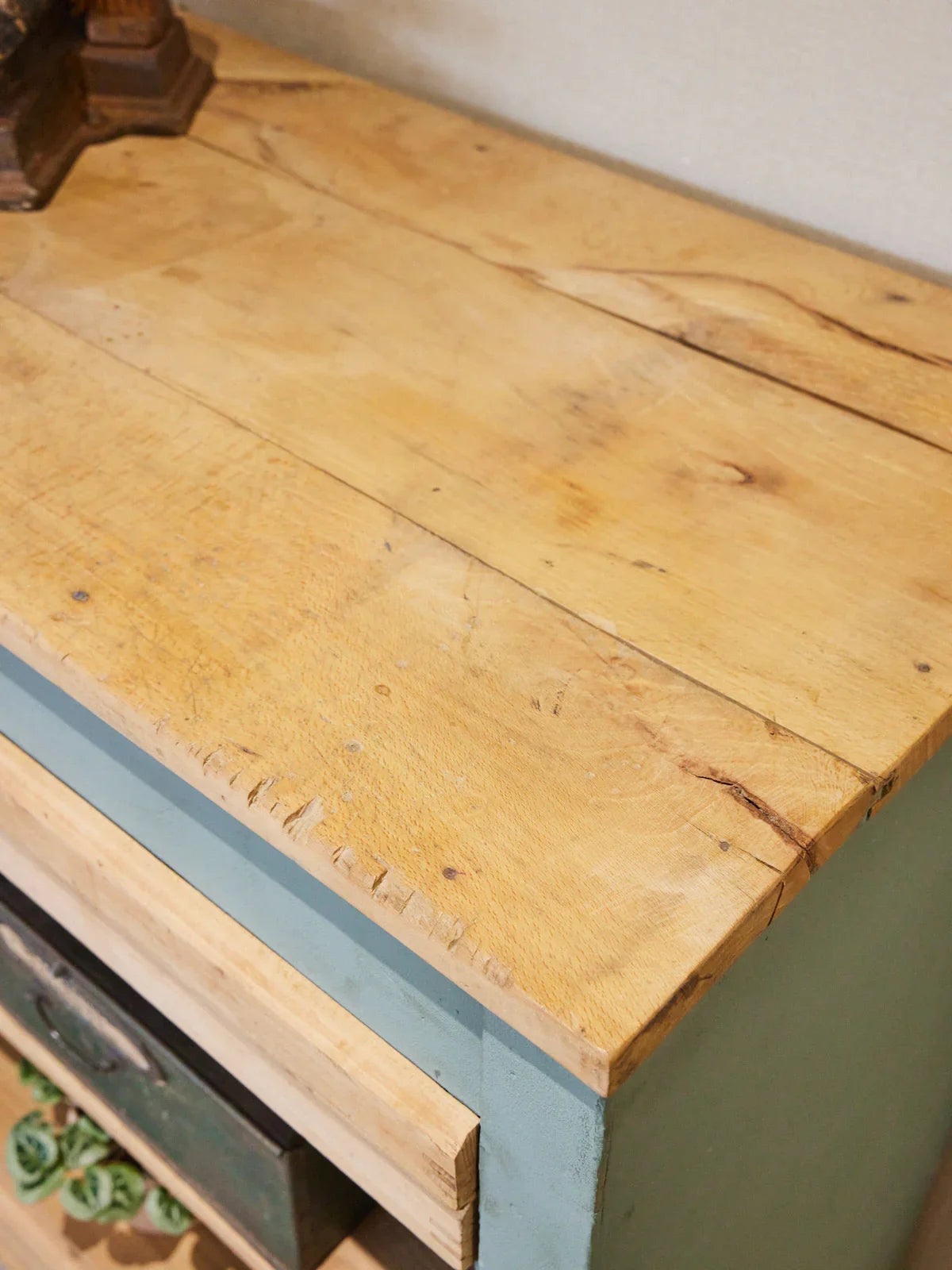 Discover this authentic wooden printing cabinet, featuring thin drawers and multiple compartments that organize papers, tools, and small objects with great space efficiency. Its robust construction and warm patina bring a chic workshop touch, ideal for an entryway, a creative office, or a vintage-style living room. The compact proportions allow for dense storage without cluttering the room, creating an inspiring and functional atmosphere.