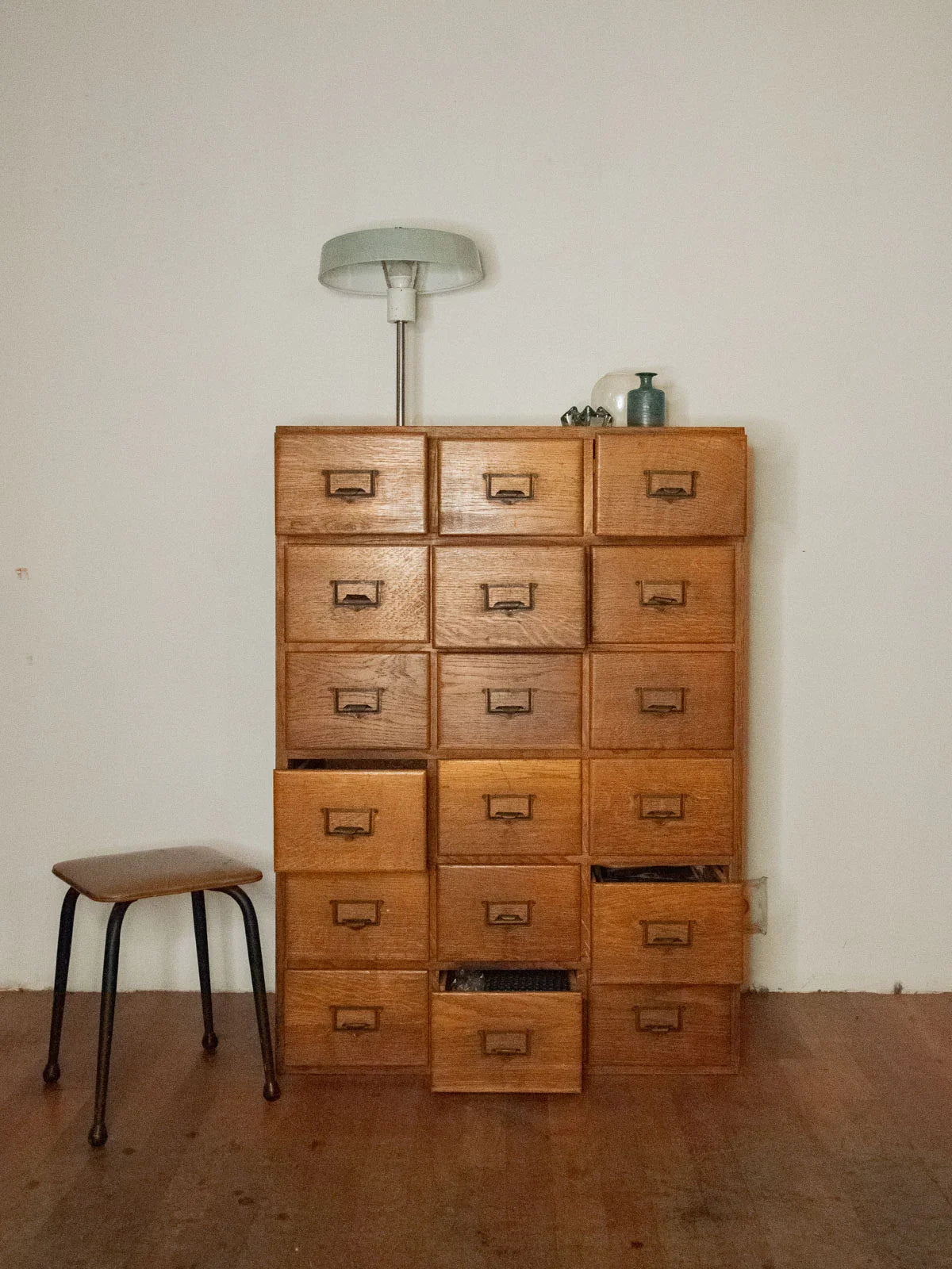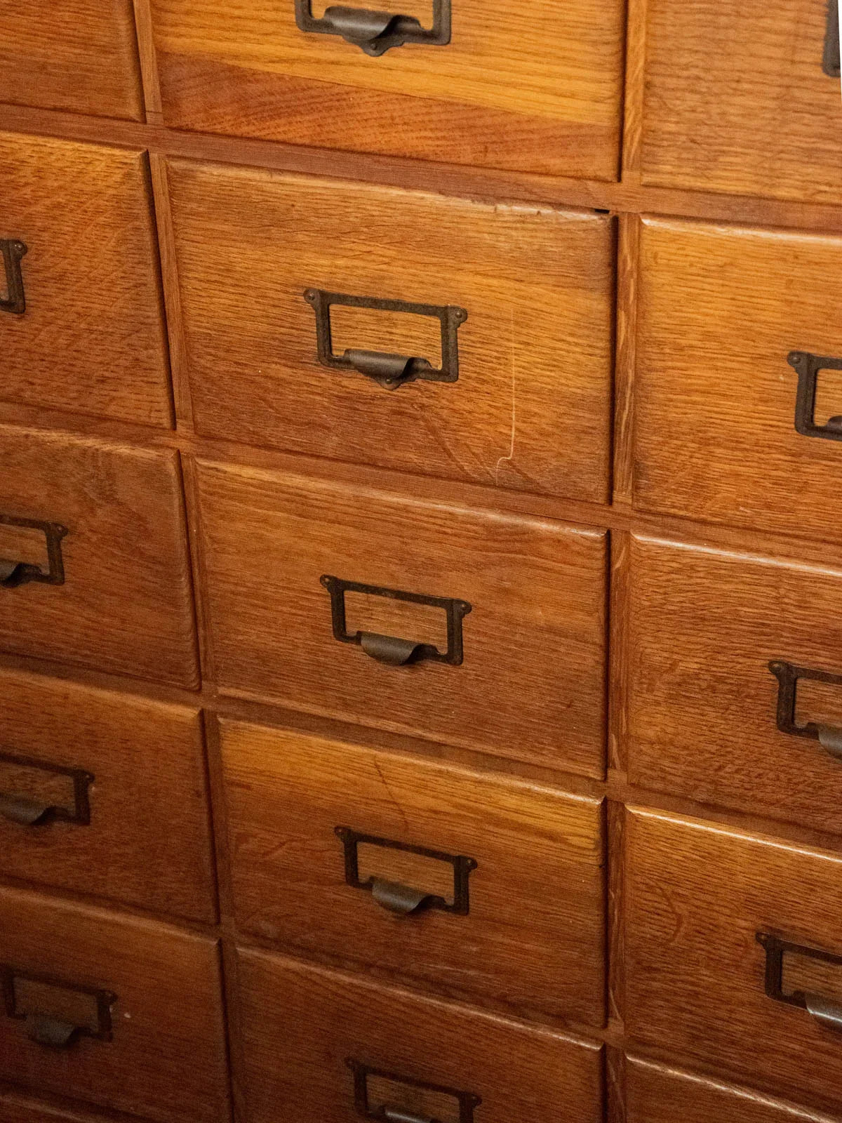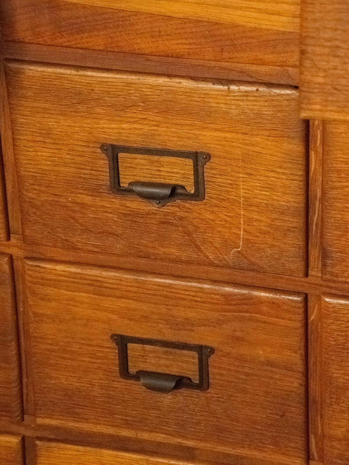 Adopt this vintage oak and fir workshop cabinet, dating from the 1930s-50s, with its practical charm and clean lines. Its 18 A4-sized drawers, equipped with label holders and metal handles, offer organized storage for files or workshop parts. The combination of oak and fir brings warmth and authenticity to a contemporary interior or a renovated workspace. Its practical proportions and patinated finish lend themselves to a functional and inspiring style. Minor signs of age are visible on the drawers and top.