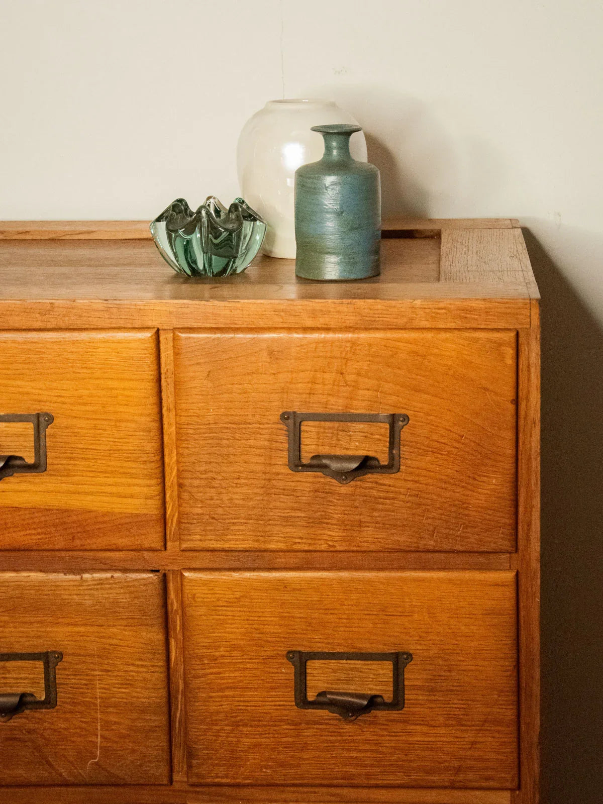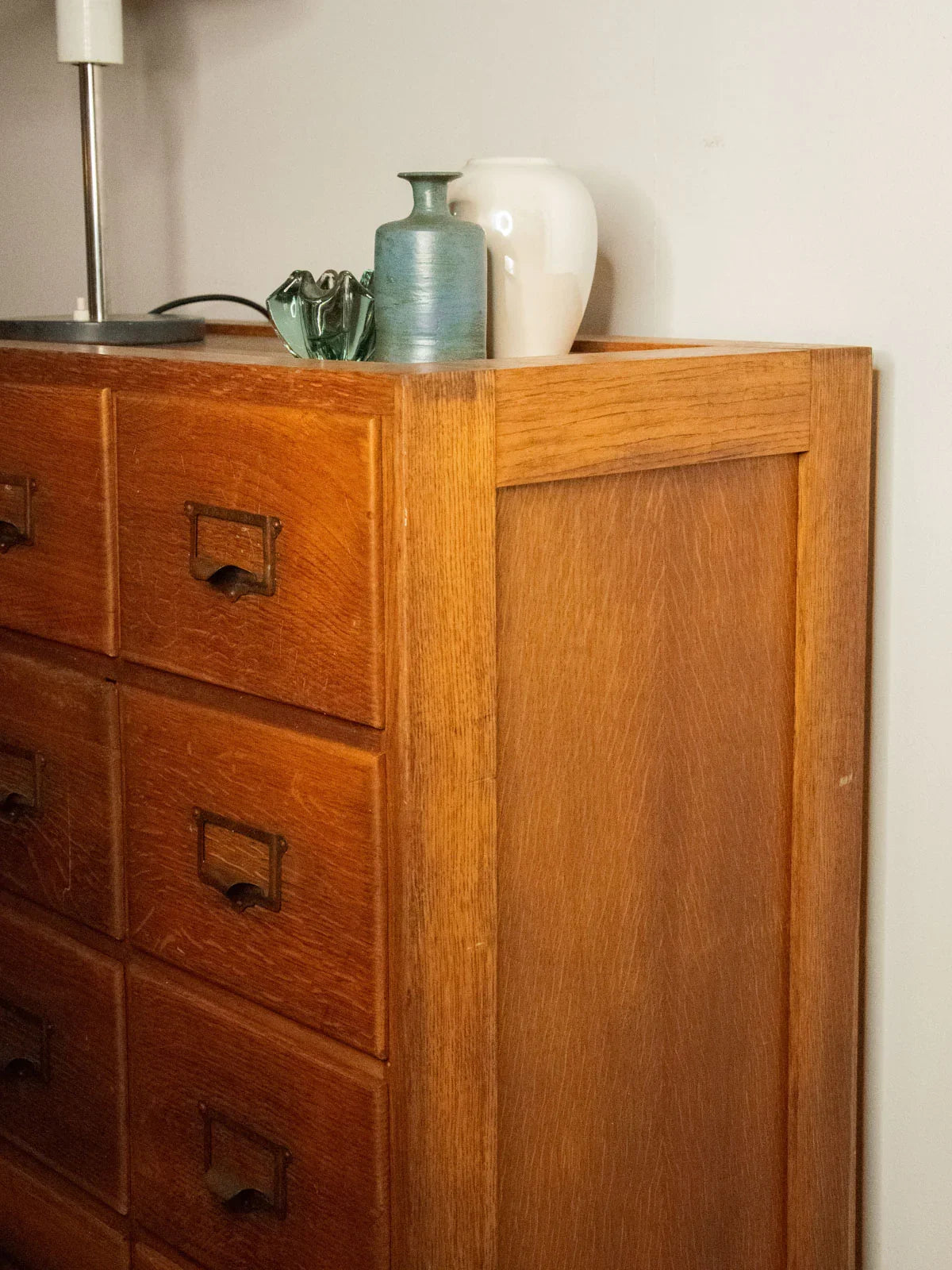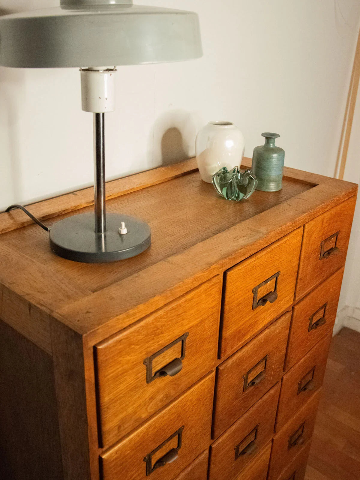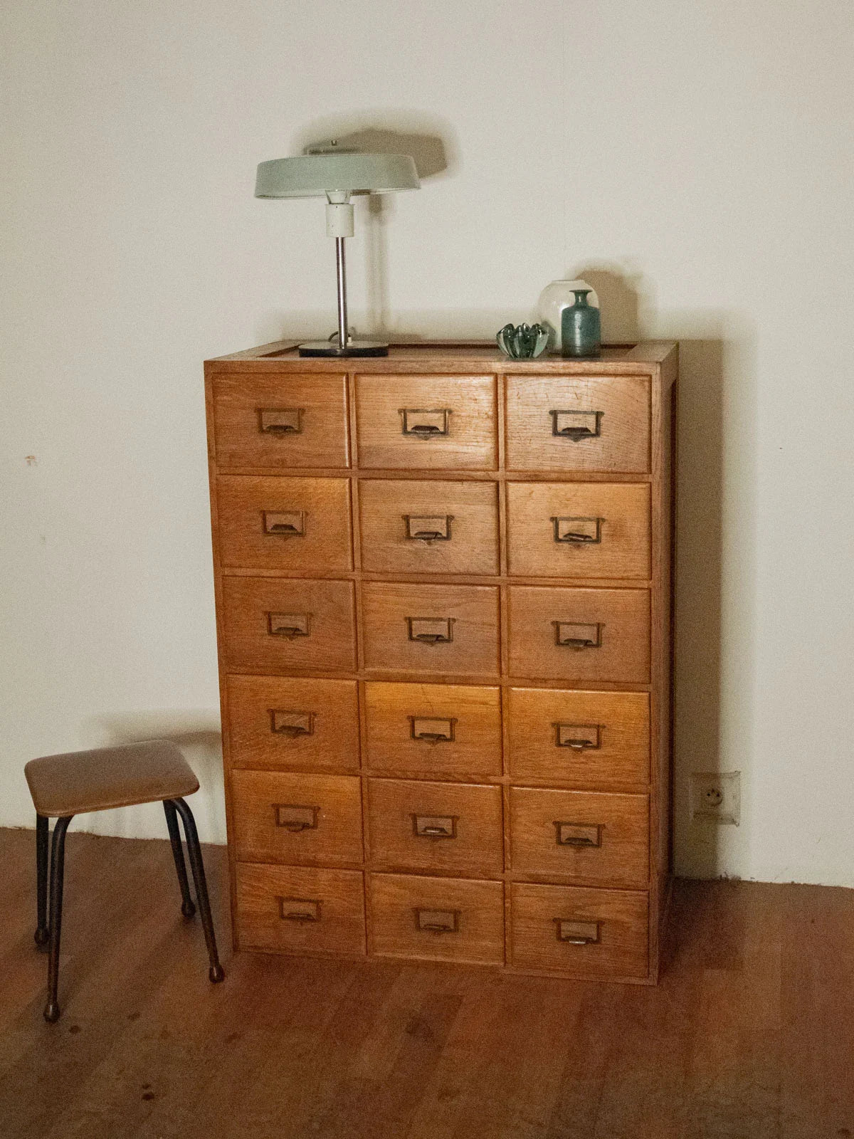 Adopt this vintage oak and fir workshop cabinet, dating from the 1930s-50s, with its practical charm and clean lines. Its 18 A4-sized drawers, equipped with label holders and metal handles, offer organized storage for files or workshop parts. The combination of oak and fir brings warmth and authenticity to a contemporary interior or a renovated workspace. Its practical proportions and patinated finish lend themselves to a functional and inspiring style. Minor signs of age are visible on the drawers and top.