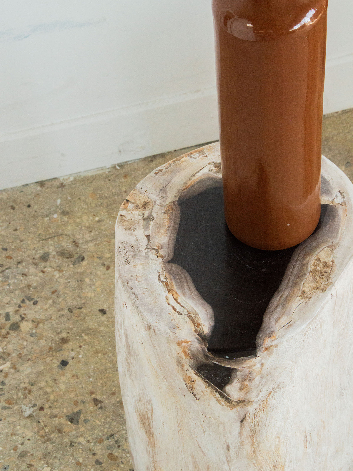 Add a raw and elegant touch with this cylindrical petrified wood side table. Its black core on top gives it character and beautiful visual depth. Each piece is unique, shaped by nature over time. Compact and stable, it easily fits into a contemporary or mineral interior. A beautiful object, both decorative and useful.