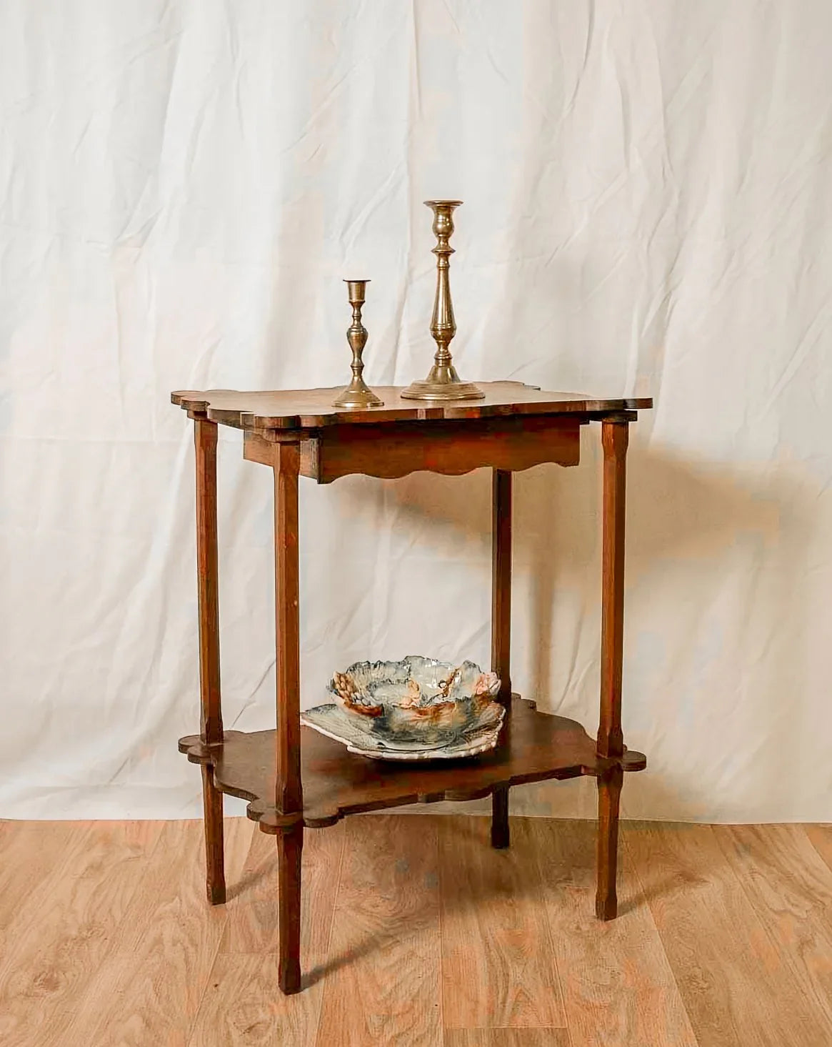 This pre-war side table, crafted from light wood, boasts a compact design that fits perfectly at the end of a sofa or as a bedside table. Its sculpted top adds a subtle decorative touch, while a discreet drawer beneath provides storage for small everyday items. The balanced proportions and luminous wood tone lend a warm presence, easily complementing both contemporary and traditional interiors. A piece with authentic character, it combines personality and functionality without overwhelming the space.