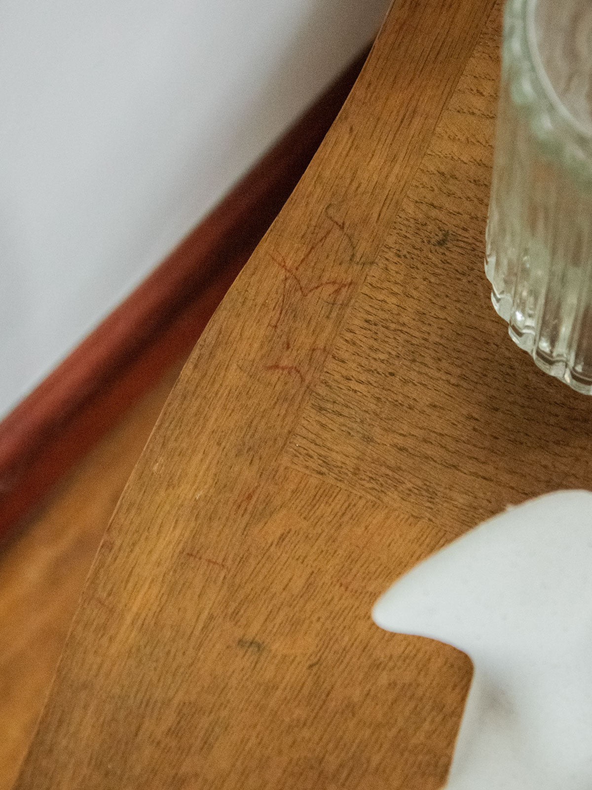 Discover this small side table with vintage charm, featuring a discreet drawer, curved legs, and a zinc knob that accentuates its refined style. Its rounded top, composed of four assembled wooden panels in the center, offers an ideal surface for lamps, books, or decorative objects, while its compact proportions make it easy to place in an entryway, living room, or bedroom. Some pen marks and minor signs of age are present.