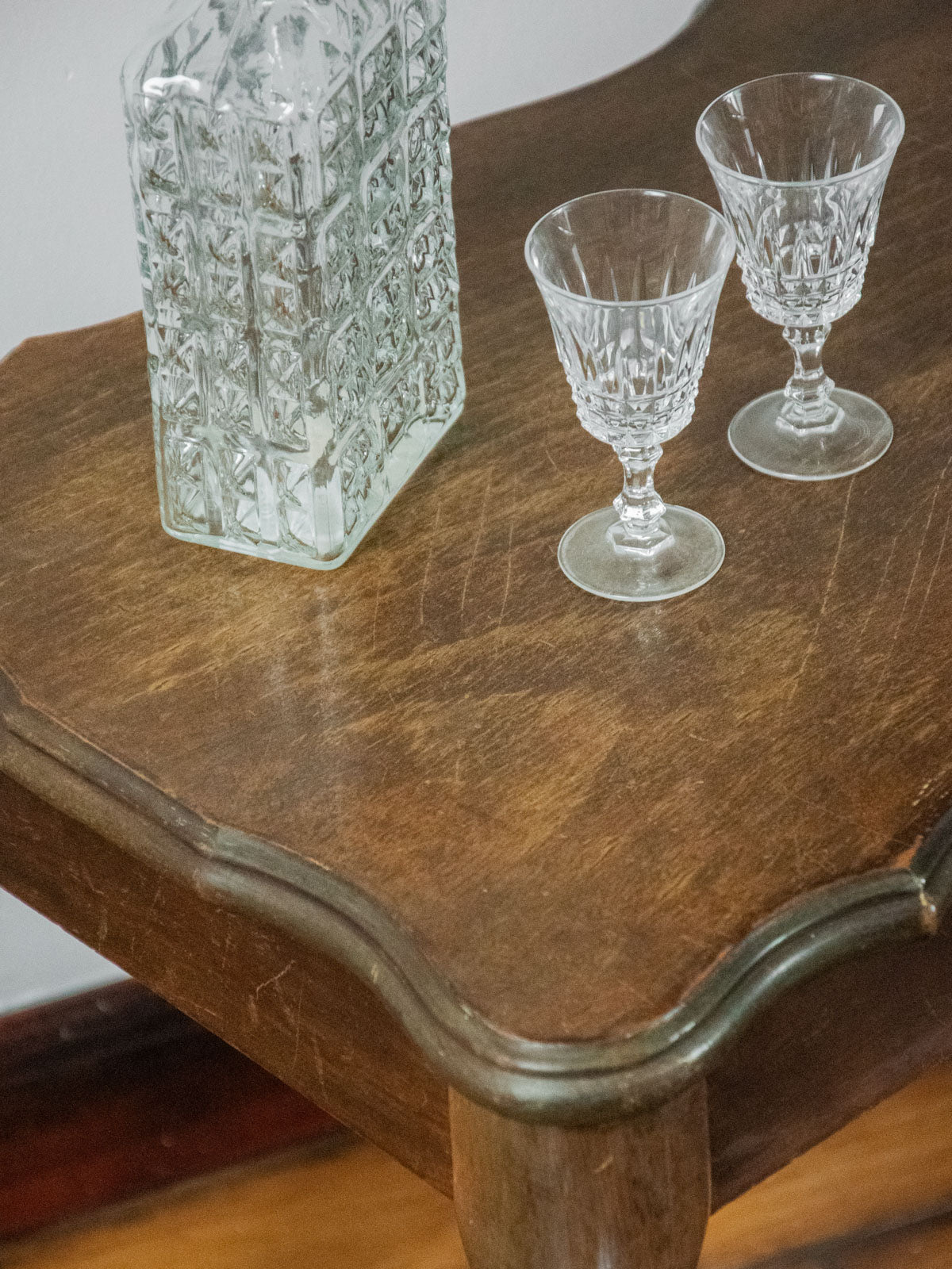 Embrace this dark wood side table with its finely sculpted, rounded top, which creates a symmetrical and serene silhouette. The rounded legs and visible grain add an organic and warm touch, ideal next to a sofa or bed for a lamp, cup, or plant. Its compact size offers a discreet yet assertive presence in an elegant and understated interior. A few signs of wear and scratches are present, adding to its authenticity.