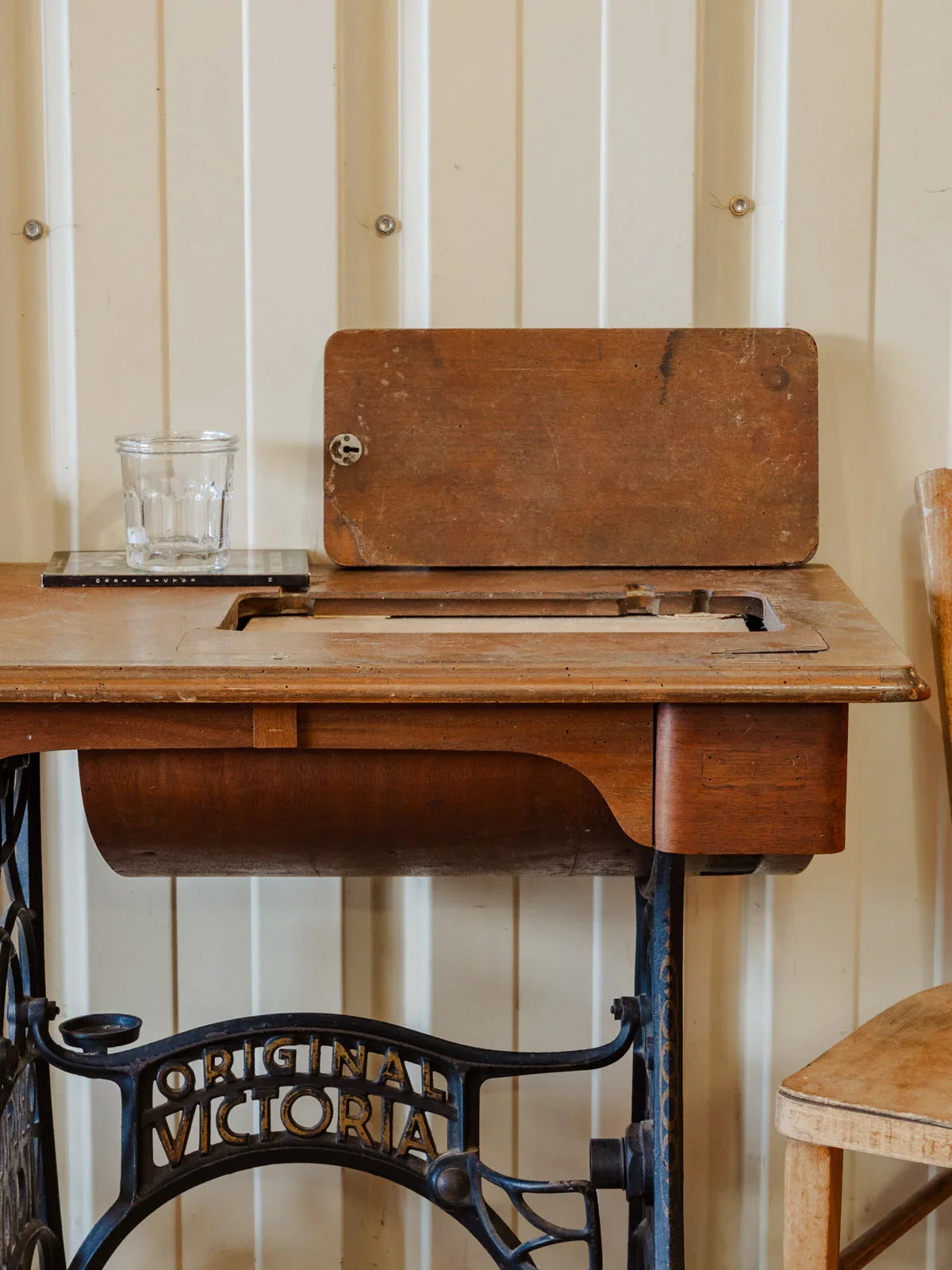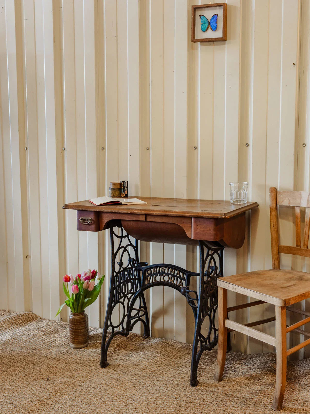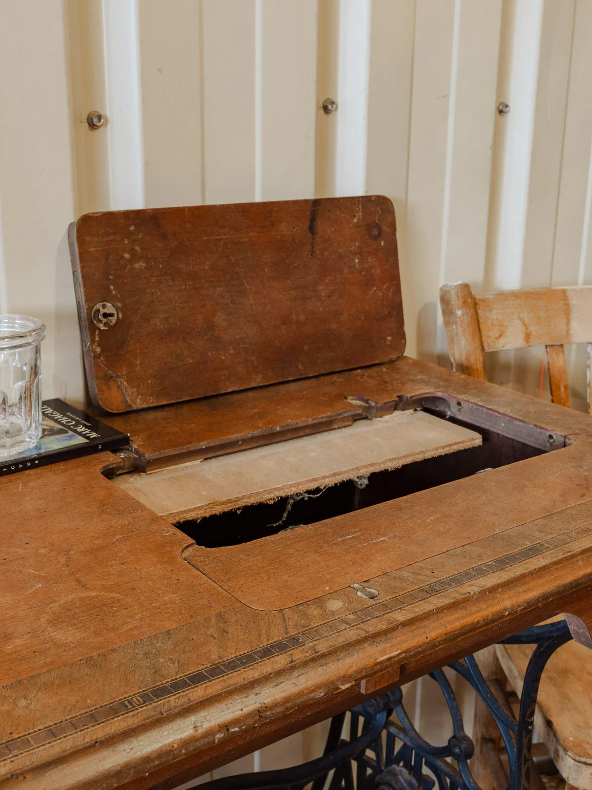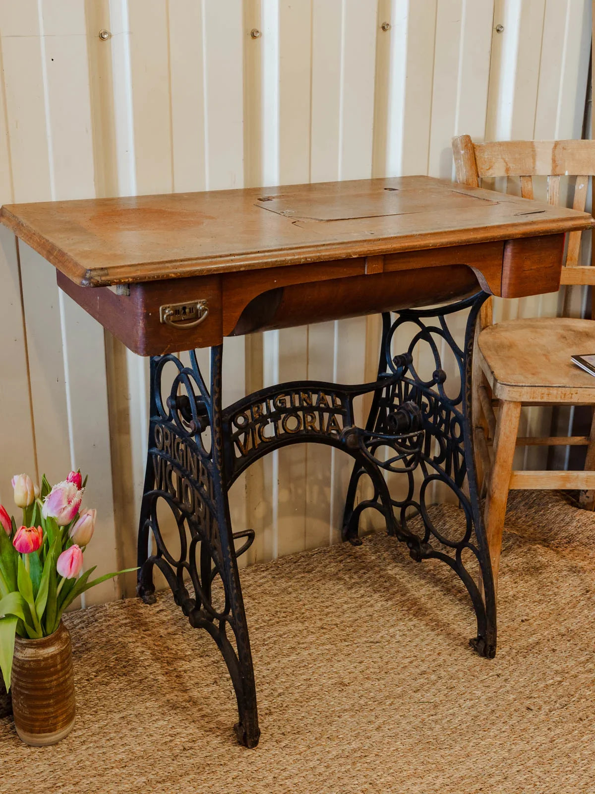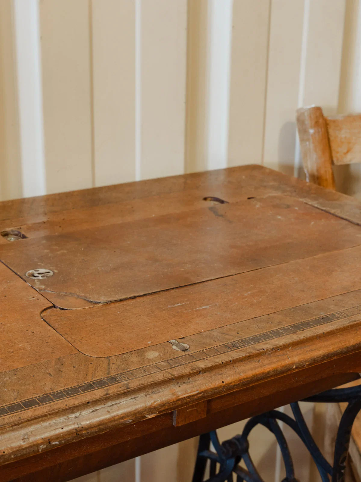Discover this side table with a wooden top and black iron base, an elegant blend of contemporary lines. Its top opens to reveal practical storage, while a side drawer offers organized space for small items. Four casters allow for easy movement as needed. Originally a sewing machine table, its size makes it a versatile piece for a living room, office, or bedroom, adding warmth and character. Some signs of age are present.