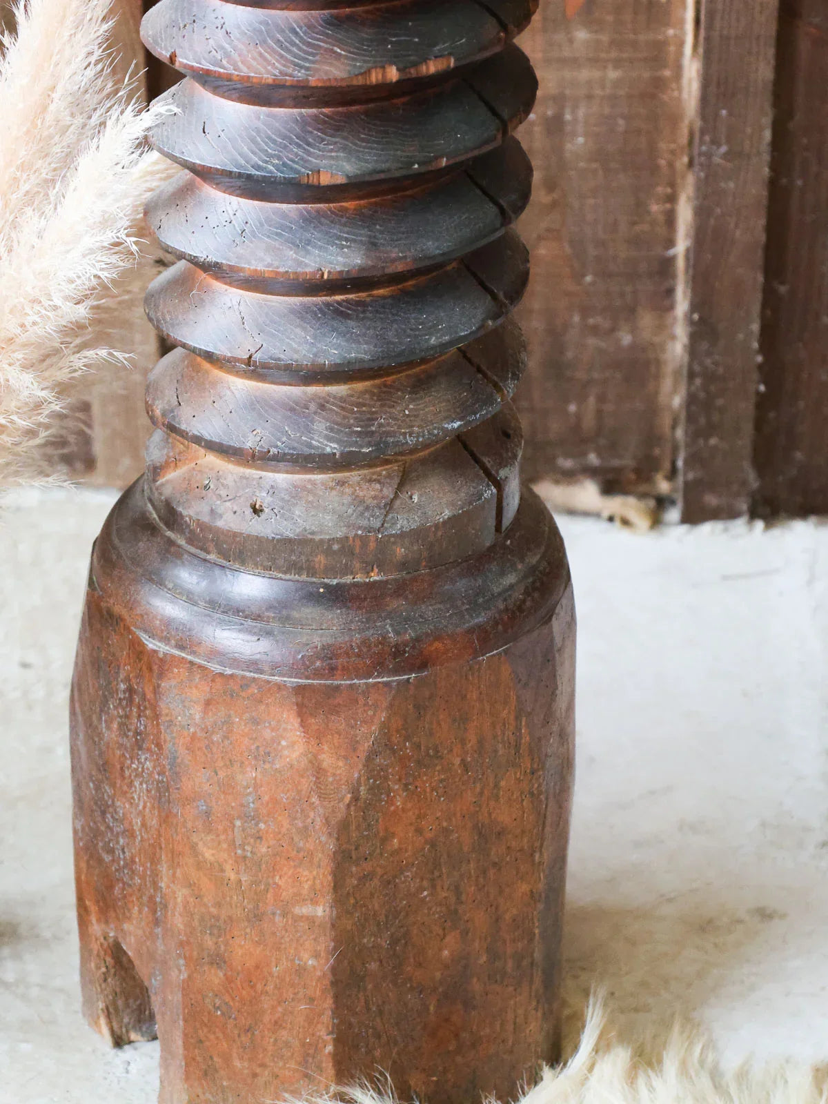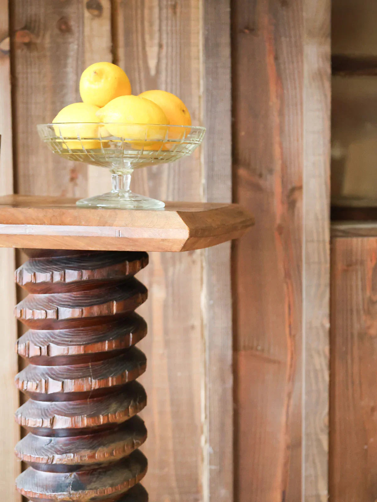 Discover this sculpted oak side table, with its dark wood, which blends a sculptural presence with understated elegance. Its thick, compact top rests on a finely crafted column reminiscent of press screws, and its slender silhouette, supported by a stable base, makes it a refined pedestal table or display stand for a living room or entryway. The deep patina of the oak suggests a warm, workshop-like atmosphere, ideal for showcasing a lamp or a plant.