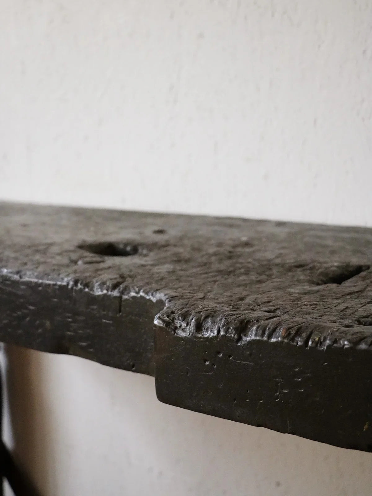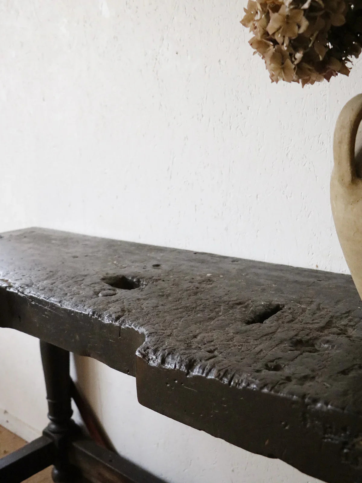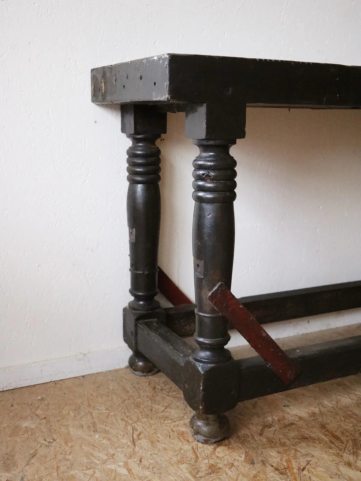 Discover this console table, a former jeweler's workbench crafted from solid wood with a black stain, combining sturdiness and elegance. Its turned legs and slender base give it a balanced silhouette, while the generous top accommodates a lamp, workshop tool, or small decorative item. Its natural patina, with original drips, tells its story and lends a warm and authentic atmosphere to an entryway or living room. A few signs of wear only add to its charm.