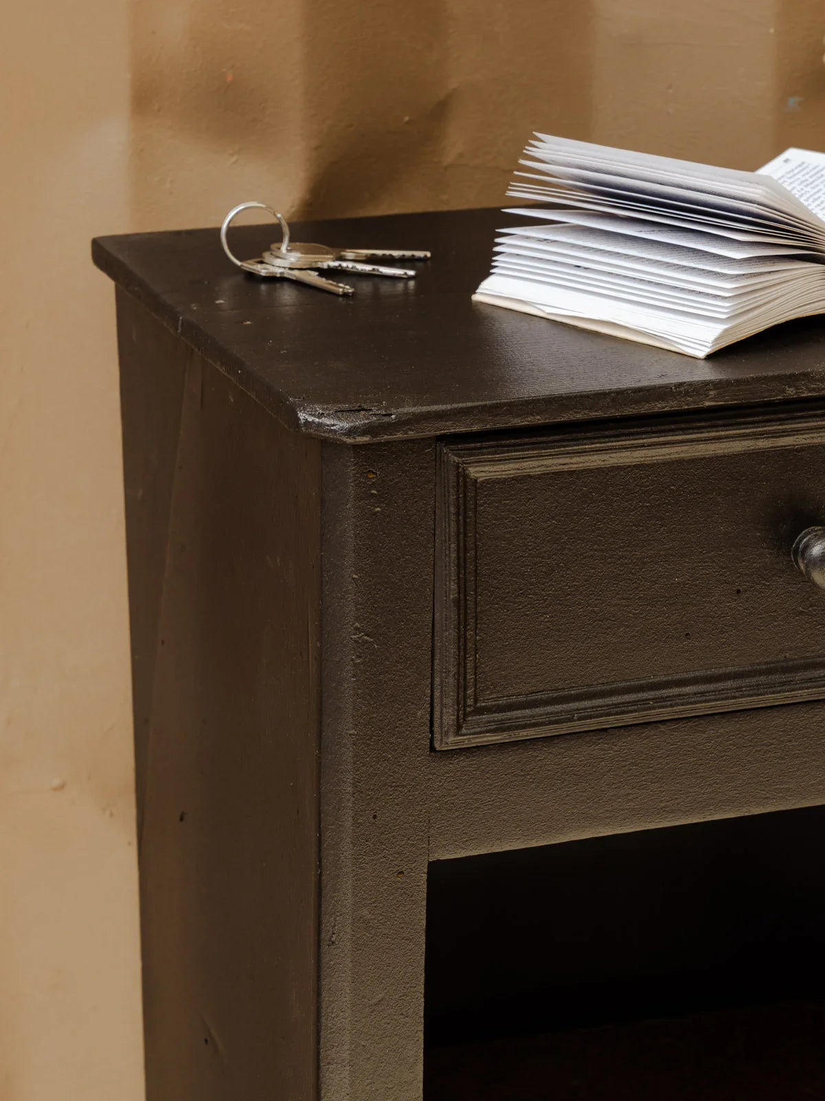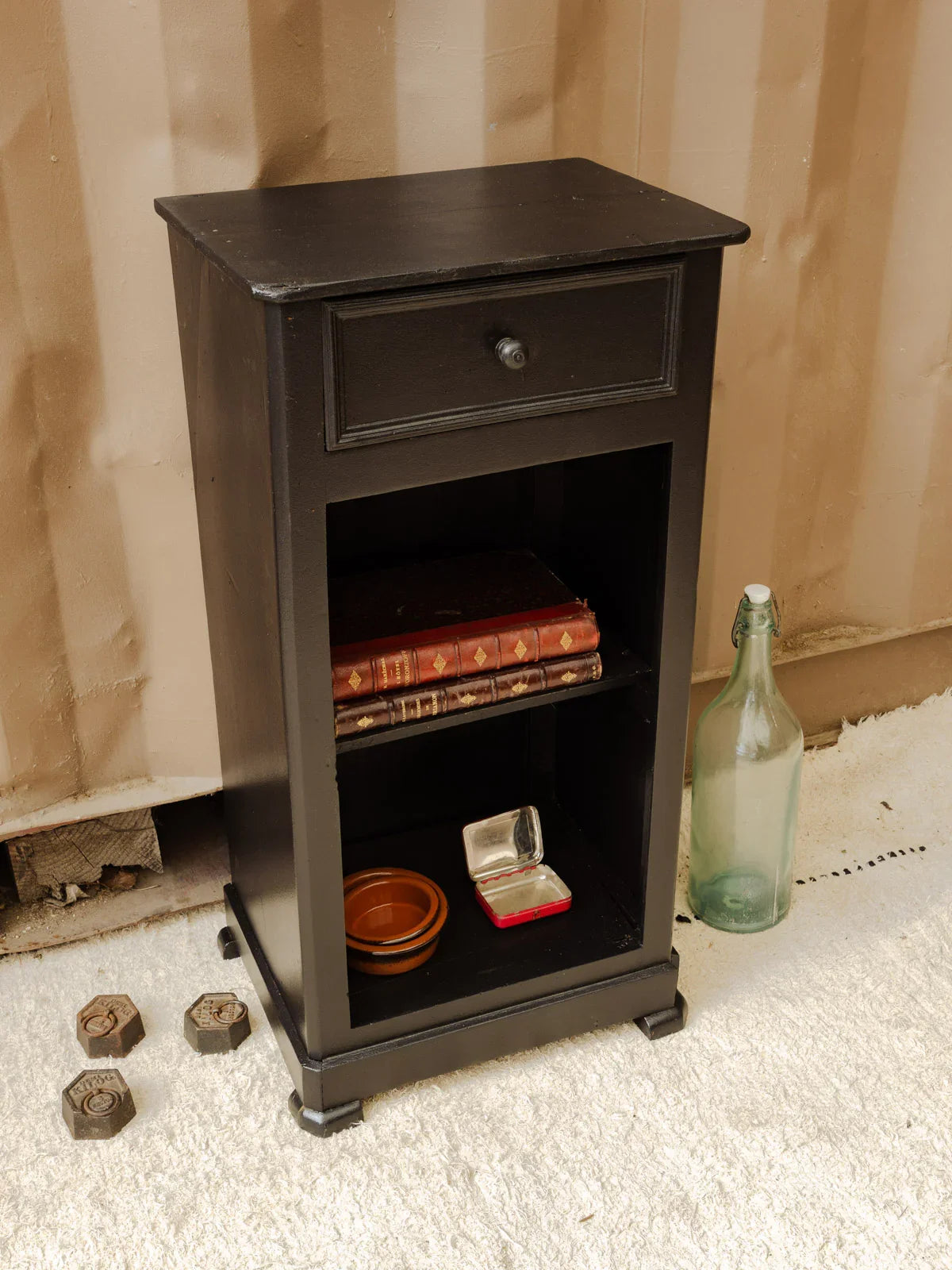 Adopt this black wooden side table with a simple and graphic style, featuring a drawer and a low shelf offering clever storage for books or everyday items. Its size and proportions fit easily next to a sofa or by the bed, adding functionality. The black finish creates a contemporary and warm ambiance, highlighting the natural texture of the wood. Some traces of time are present.