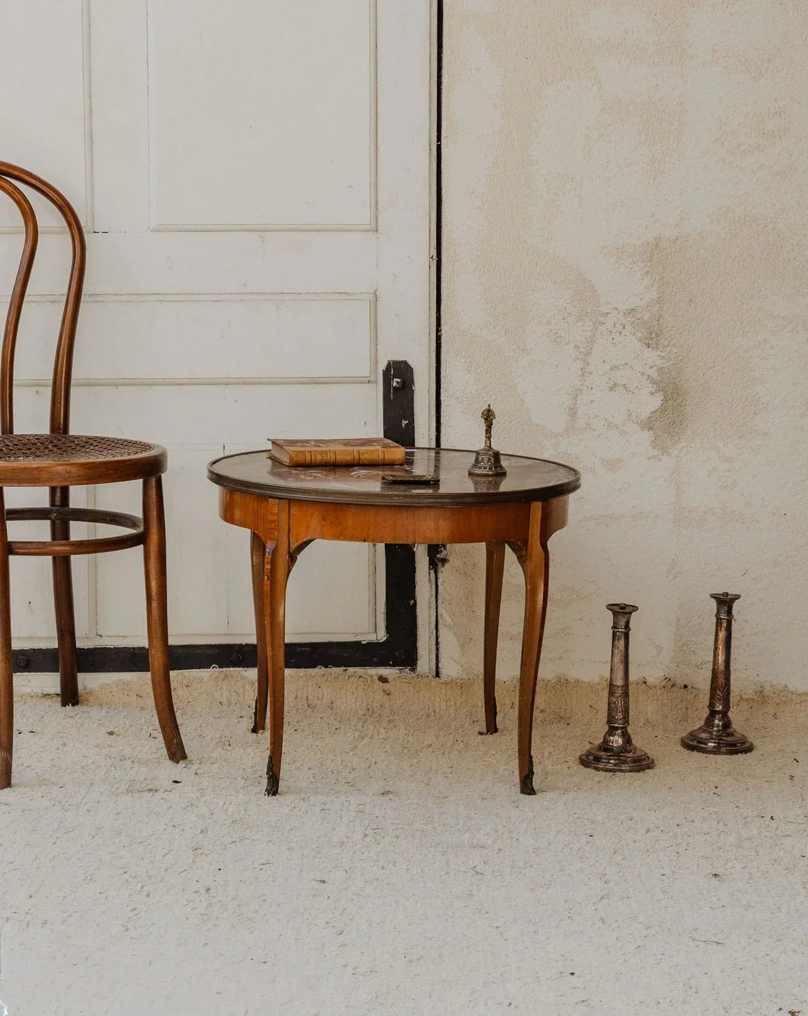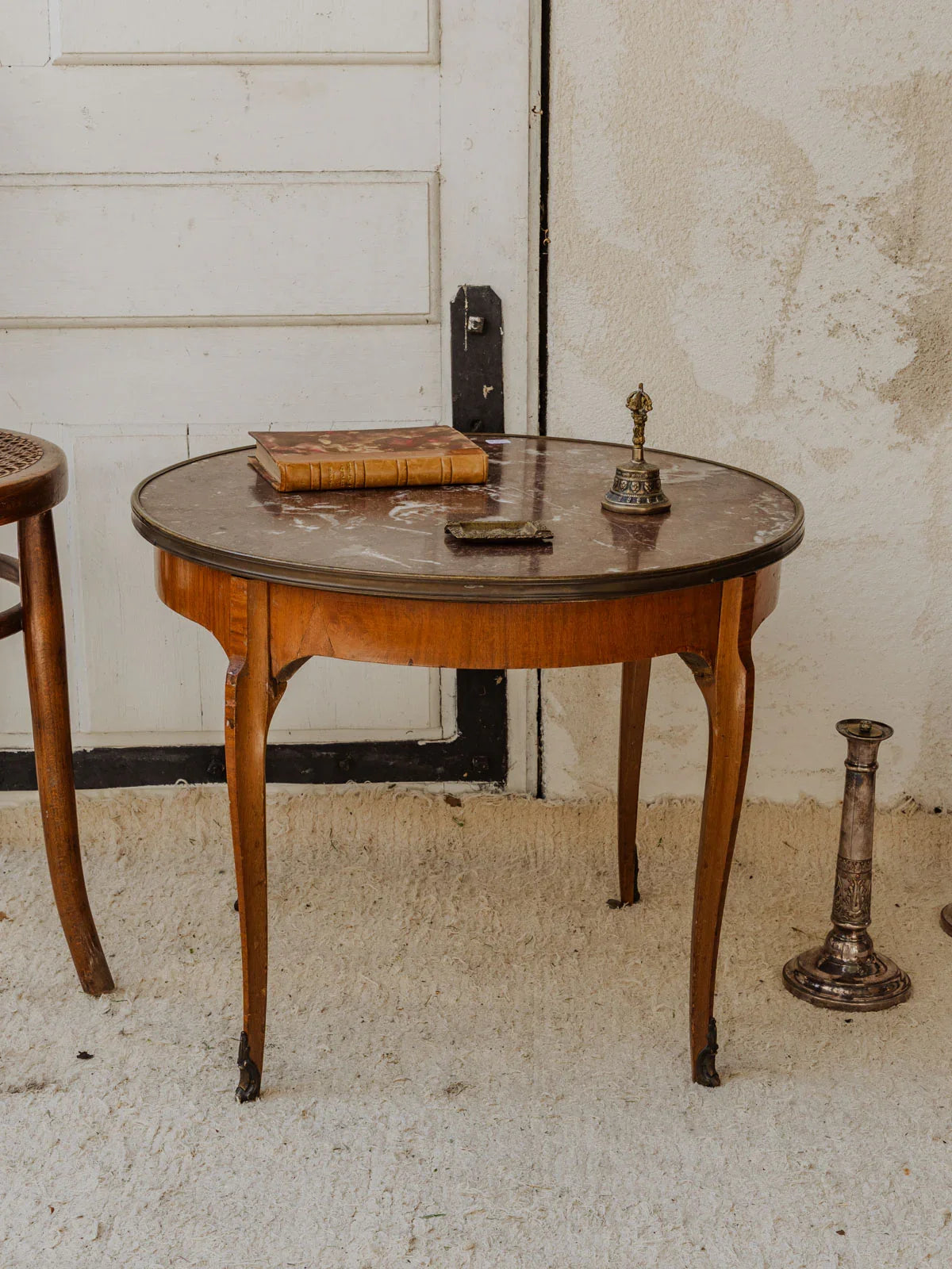 Enhance your interior with this Louis XVI style bouillotte side table, featuring a round brown marble top set on a wooden structure. Its compact size allows it to easily fit beside a sofa or in an entryway to hold a lamp or a cup, while the warm contrast of the wood and polished stone creates an elegant and intimate atmosphere. Some signs of age are present.