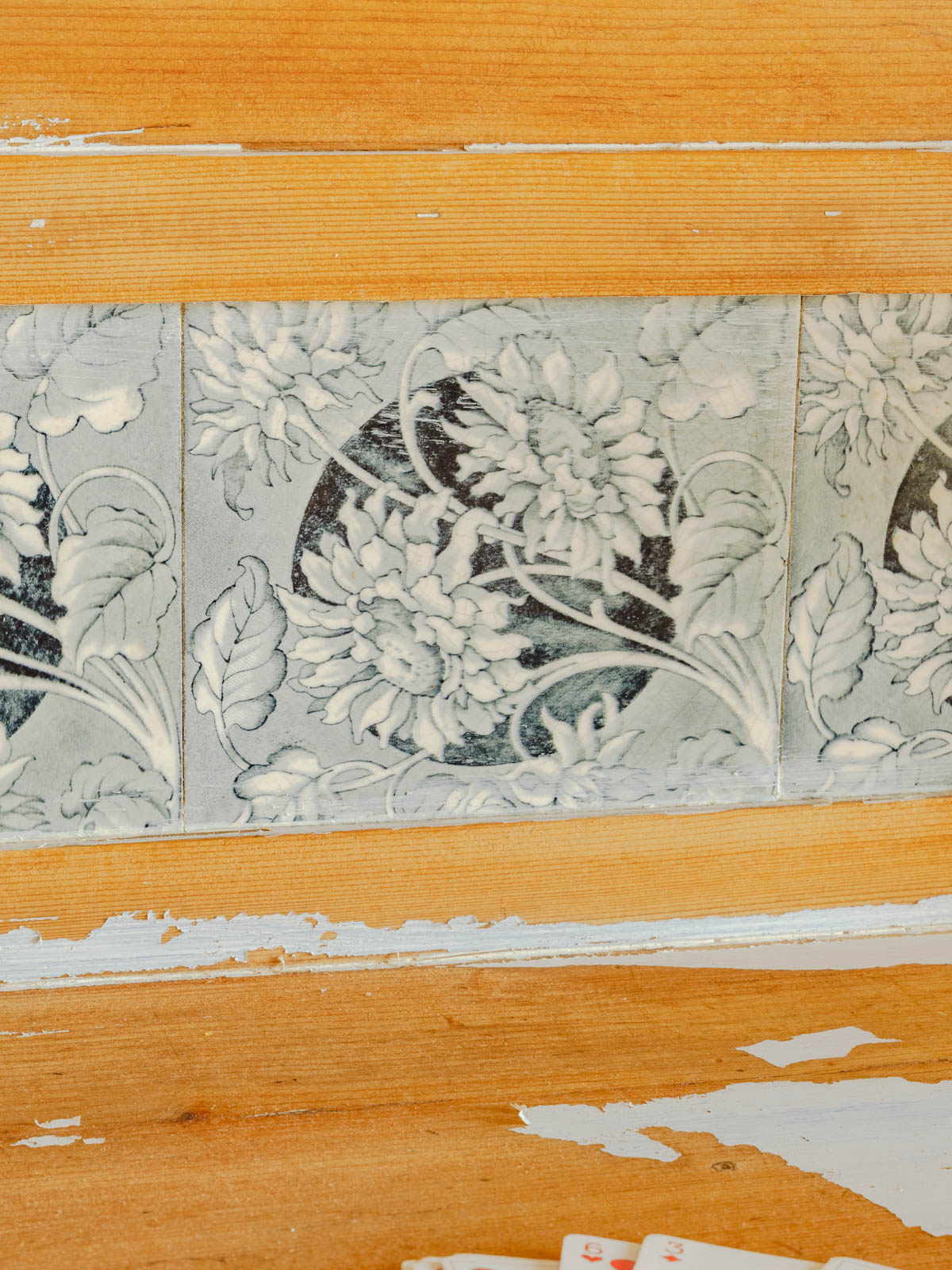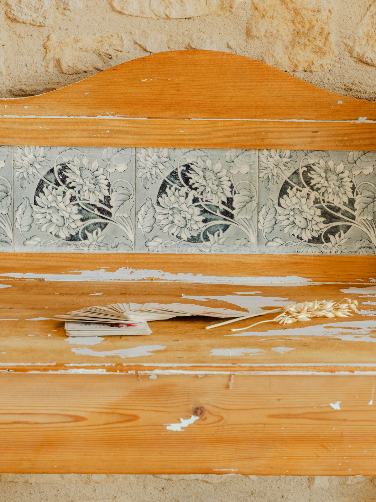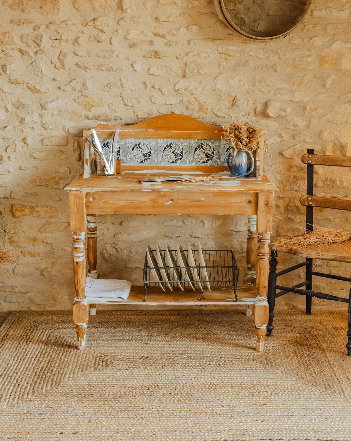 Bring a vintage console table to your home, crafted from fir with a white-painted patina. Its clean lines blend seamlessly with the character of natural wood. The upper section, adorned with a black and white sunflower tile design, adds a handcrafted, graphic touch. Its proportions and ample surface area make it a practical piece for storing jars and spices in the kitchen or bottles and accessories in the bathroom. A piece of understated charm, ideal for creating a warm, country-chic atmosphere.
