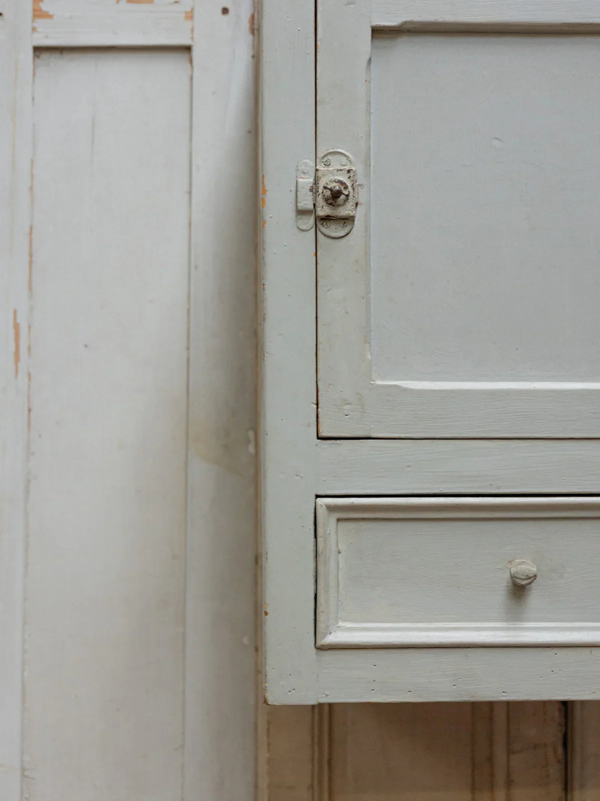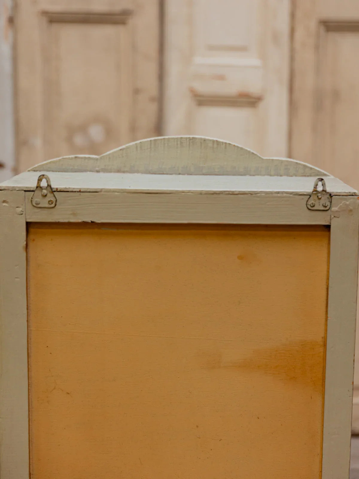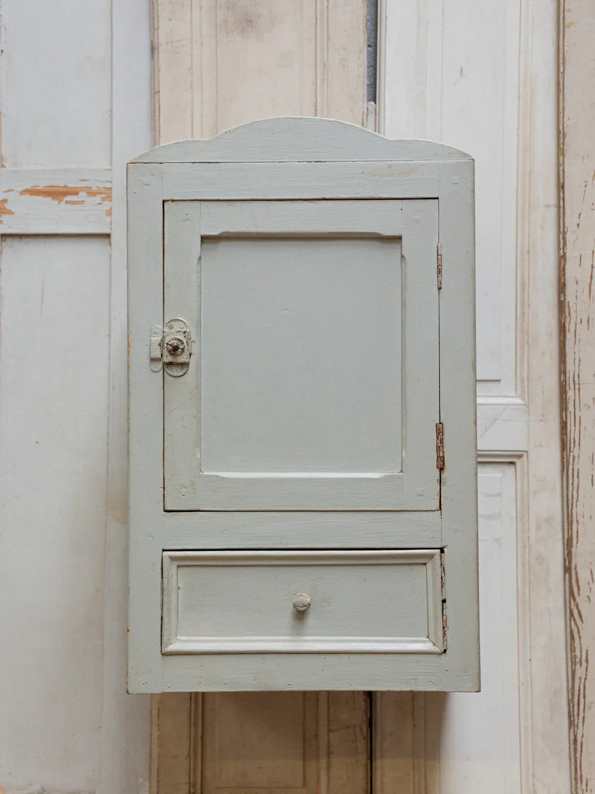 Discover this wall shelf with its charming patina, featuring a door that conceals a faux drawer and a handy compartment for organizing small items. The magnetic closure and lock provide security and discretion, while the interior shelf maximizes storage for books, plants, or decorative objects. Two discreet hooks make mounting easy, and its compact size makes it ideal for an entryway, kitchen, or bathroom, creating a warm and authentic atmosphere. Minor paint chips and treated woodworm marks.