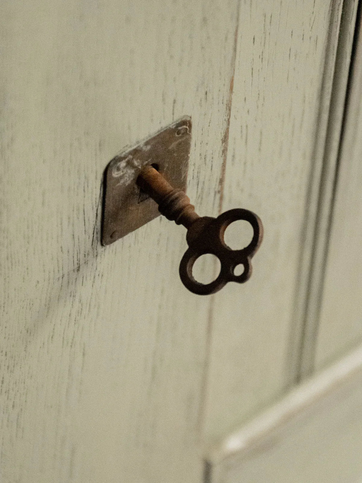 Discover this small medicine cabinet in patinated green wood, with its understated charm and clean lines. Its compact size and narrow profile make it ideal for optimizing a corner of a bathroom, kitchenette, or entryway, while the small key adds a touch of refined authenticity. Two adjustable interior shelves offer flexible storage for bottles and accessories, and small notches for hanging further emphasize its character.
