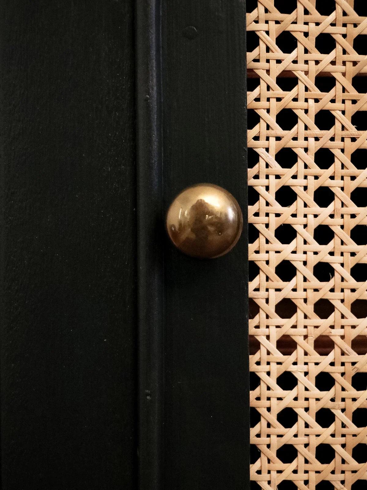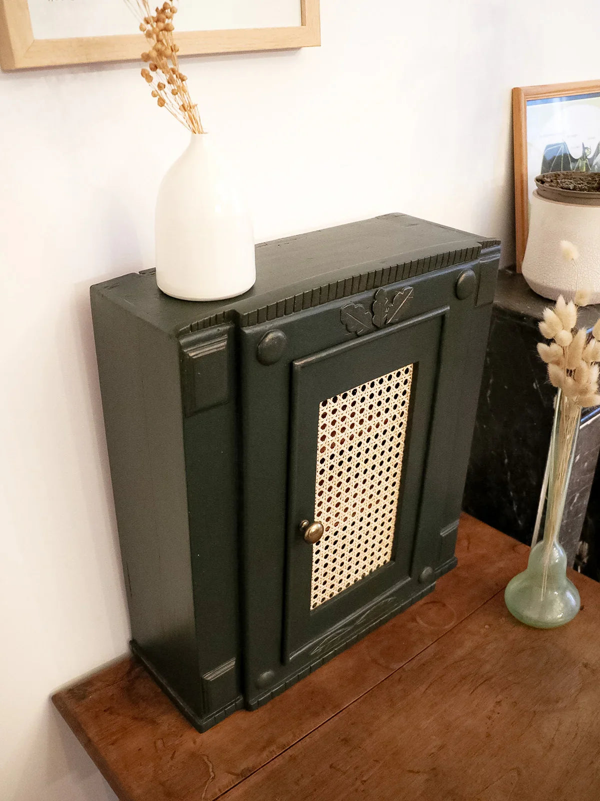 Discover this 1960s medicine cabinet crafted from solid wood, adorned with engraved motifs and a caned door that lend it a discreet retro charm. Its antique brass handle and compact proportions make it an ideal freestanding piece for a bathroom or entryway, offering several practical compartments thanks to the interior shelves for organizing bottles and small accessories. Its warm and understated style creates a refined and welcoming atmosphere.