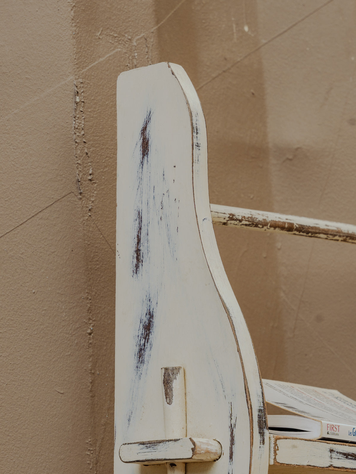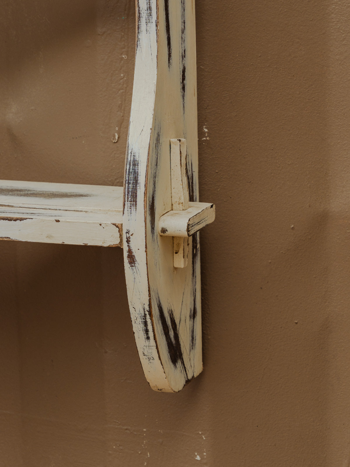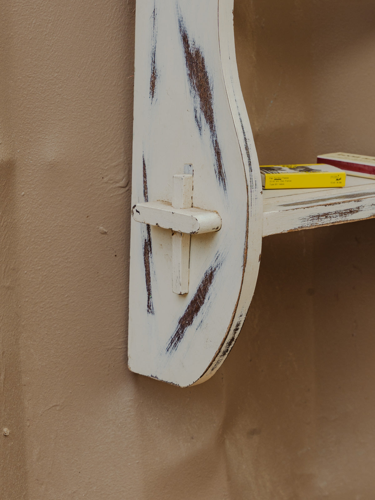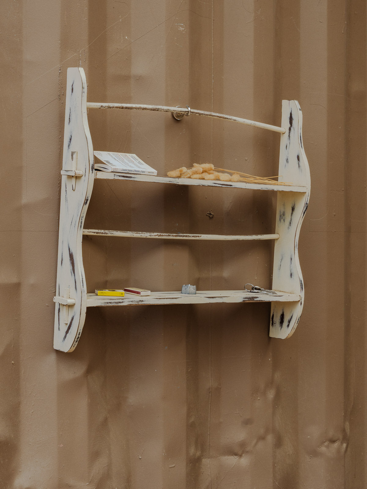 Add this wall shelf in off-white painted wood, with its simple and understated design that blends easily into a contemporary or more retro interior. Its two shelves offer practical storage, ideal for displaying plants, books, or everyday objects without cluttering the space. Its simple look and finish create a bright and calming atmosphere in a kitchen, bathroom, or entryway. Some signs of age are present.