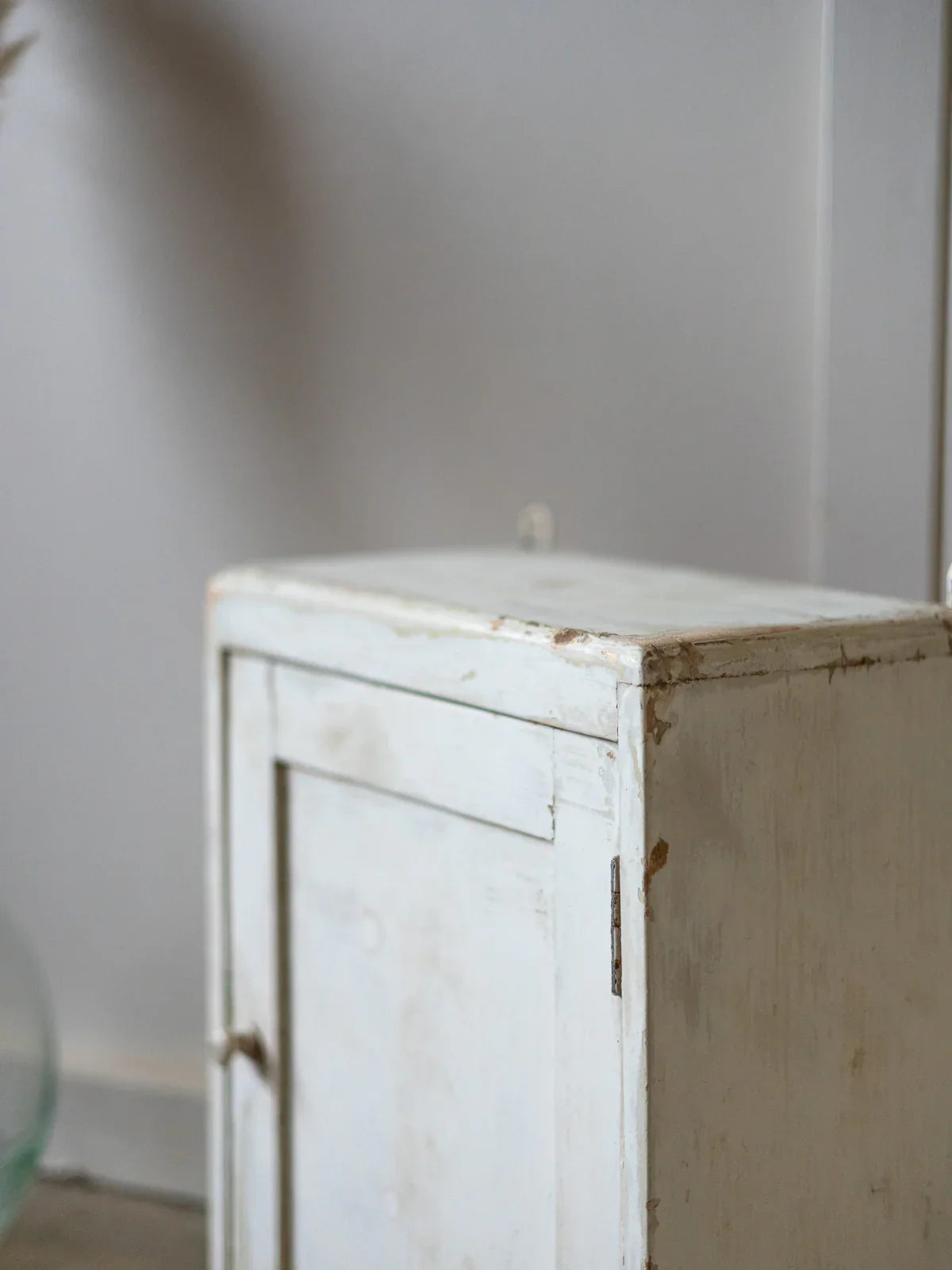 Discover this small wall shelf with its understated charm. Its rounded corners and wall brackets give it a soft, contemporary silhouette. Painted white with a subtle patina, it offers a shelf and an upper compartment for displaying books, plants, or bathroom essentials, integrating elegantly into a kitchen, entryway, or reading nook. Its shape structures the space without overwhelming it. Patina finish, lightly sanded.