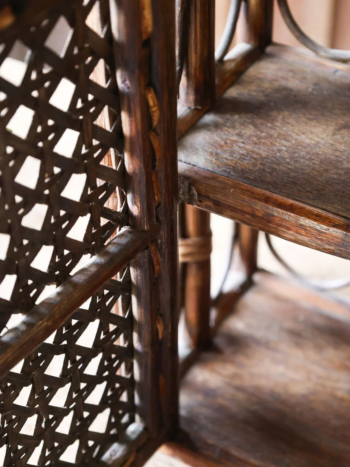 Choose this small, dark wood rattan wall cabinet/shelf. Its compact proportions make it easy to integrate into a bathroom, kitchen, or entryway. Two doors conceal three shelves, offering clever storage for toiletries, small items, or jars, while the carefully considered depth optimizes wall space. The rattan provides a warm, natural texture, and the dark wood finish lends a touch of understated elegance, creating a contemporary and inviting atmosphere.