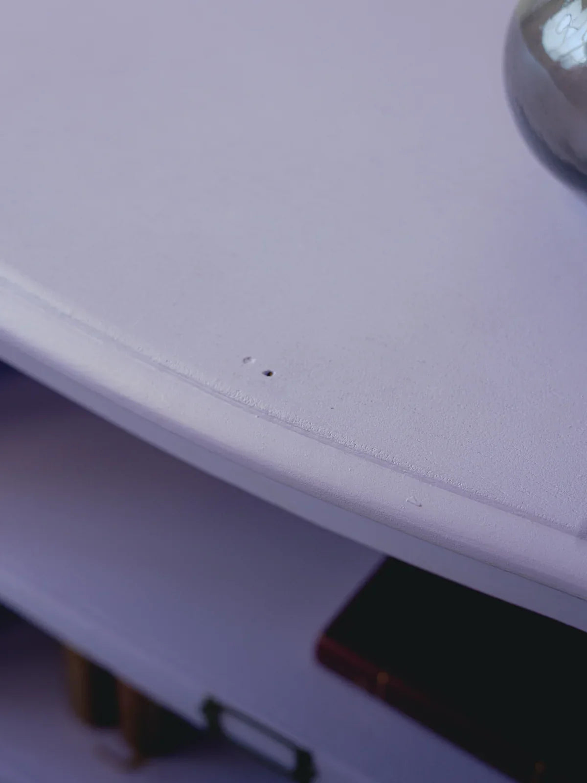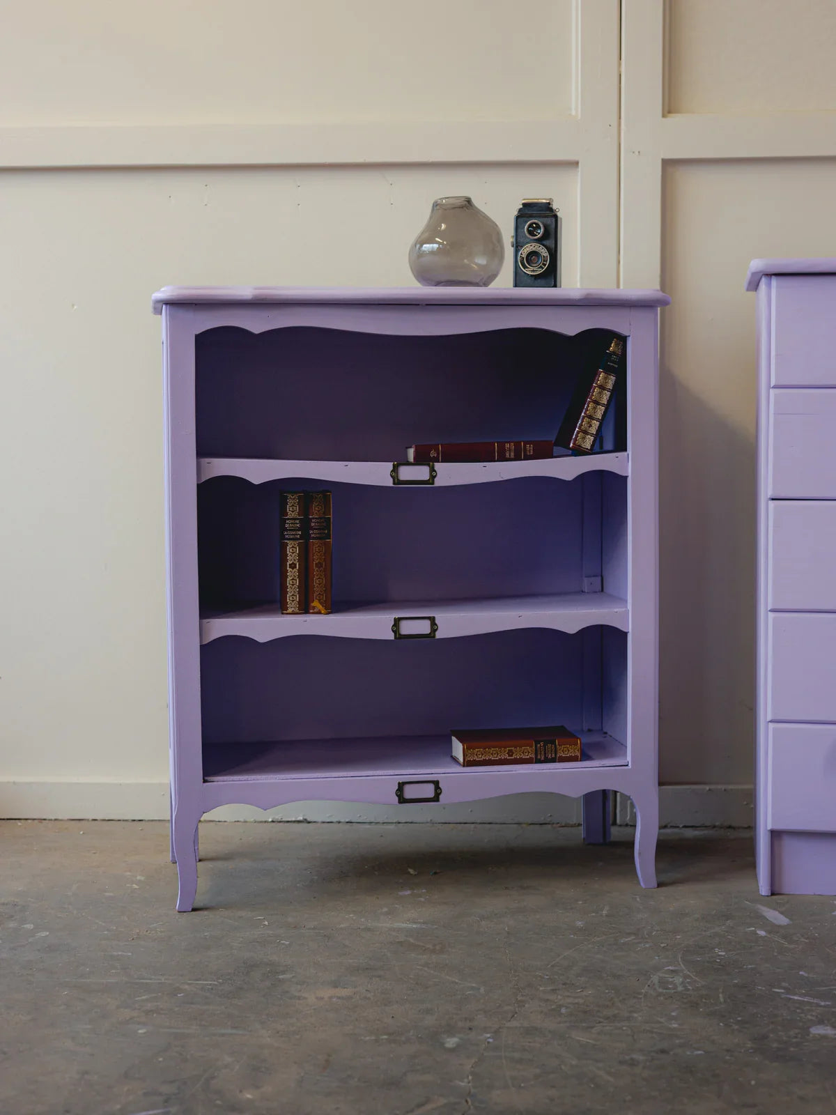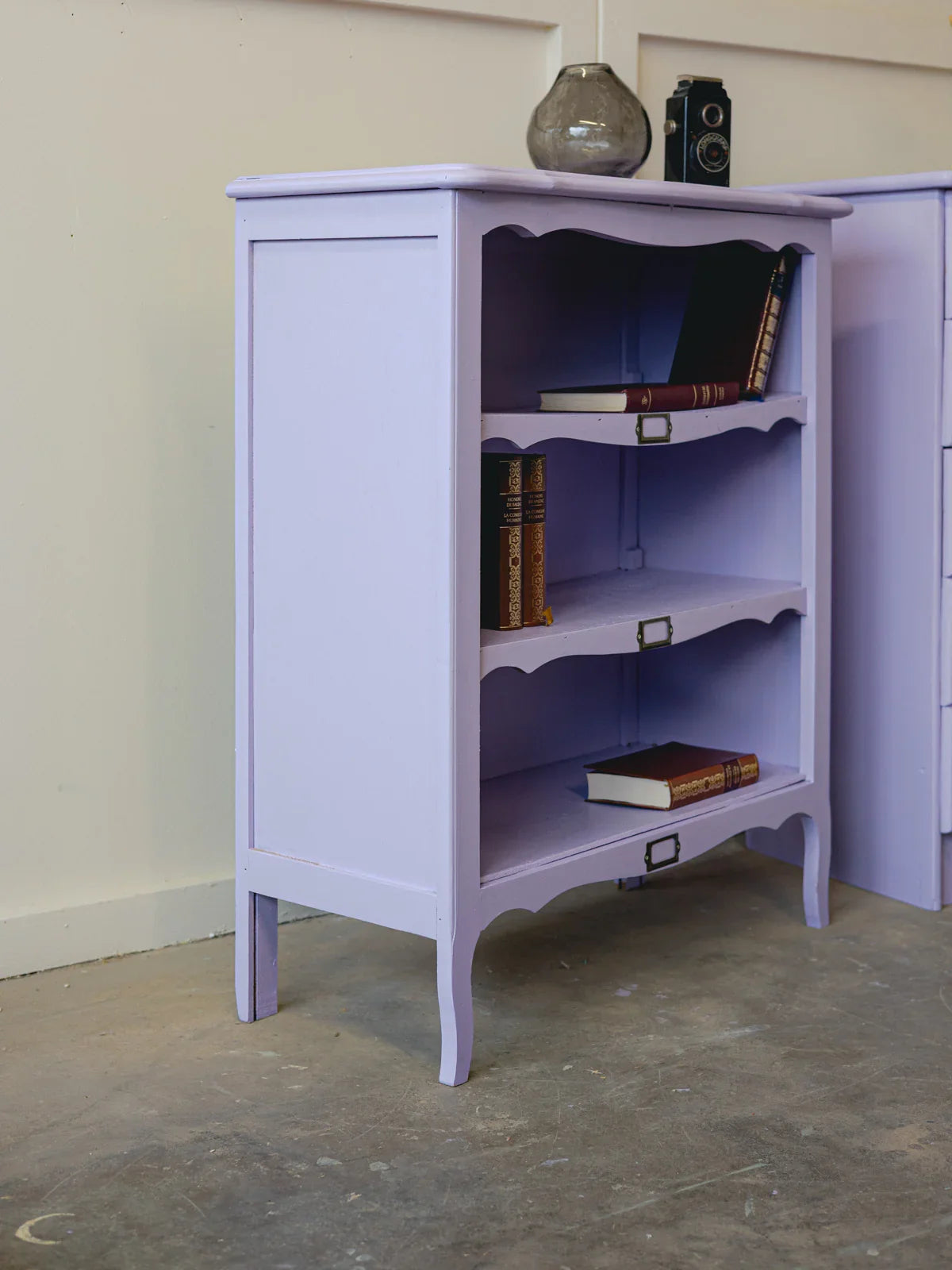 Embrace this reimagined light purple shelf, with its delicate lines and rounded pine top that adds a touch of warmth. Its three tiers offer optimized storage for books, plants, and small items, with compact proportions perfectly suited to smaller spaces. The contrast between the soft paint and the natural wood creates an elegant and inviting atmosphere, ideal for brightening up an entryway, living room, or reading nook.