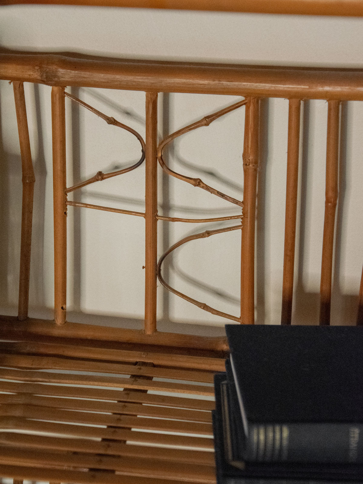 Easy to move and lightweight, this fully collapsible rattan shelf, with its light and organic lines, is ideal for structuring a reading nook or displaying plants and decorative objects with a natural touch. The wooden pegs used for attachment highlight the craftsmanship and allow for modular organization to suit your needs, offering multiple storage levels in a small space. In good overall condition. Several decorative pieces are missing from the sides and the wall front, and the left side of the fourth shelf is detached, but this does not detract from its charm or sturdiness.