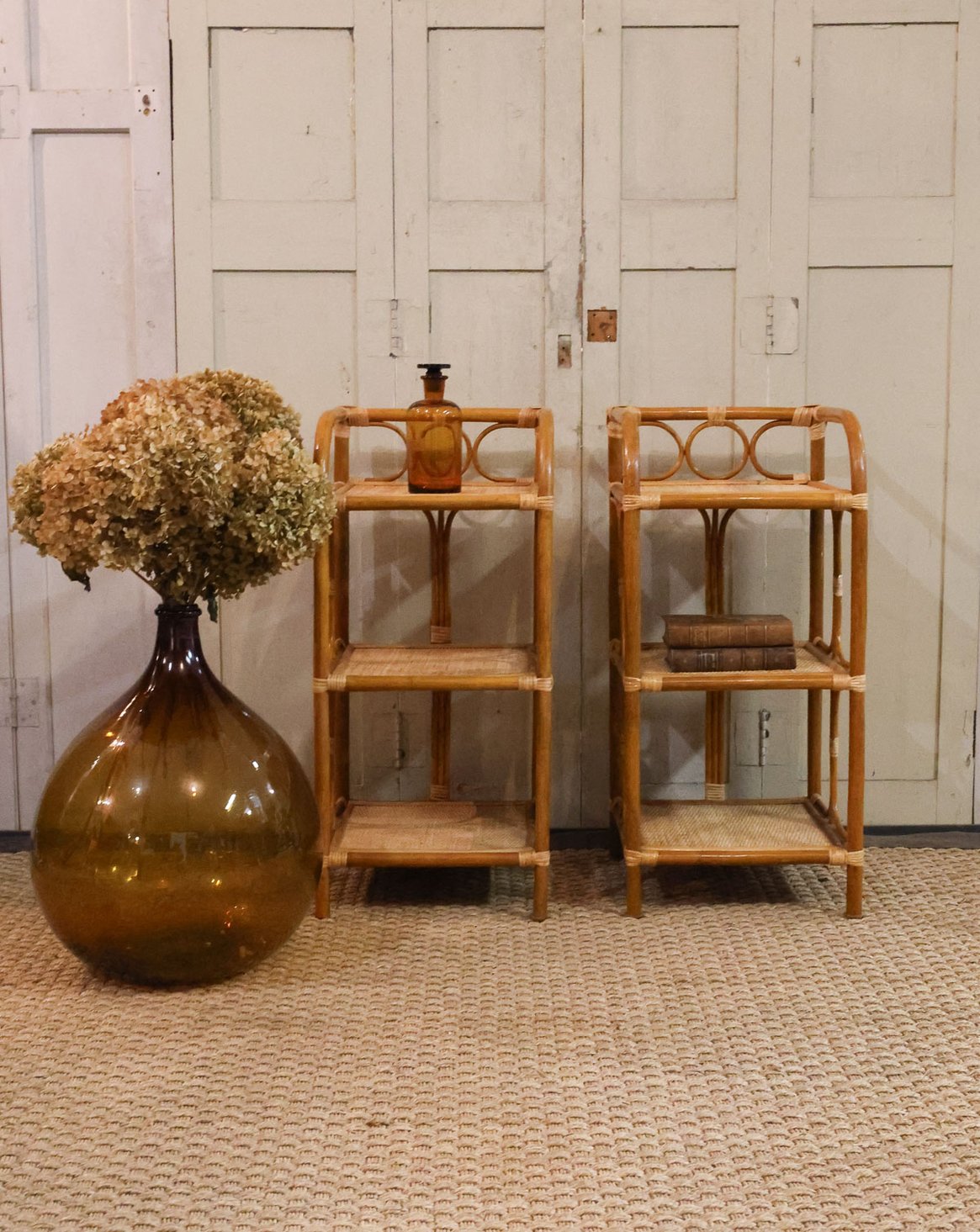 Choose a pair of rattan and cane bedside tables, blending bamboo and handcrafted weaving for a light and natural look. Their open, three-shelf design offers multiple storage options: a lamp and a few books on the top shelf, decorative objects on the middle and lower levels, all while maintaining a small footprint ideal for compact spaces. The woven rattan adds warmth and texture, creating a bright, bohemian-chic atmosphere in the bedroom.